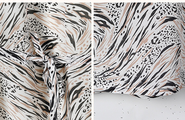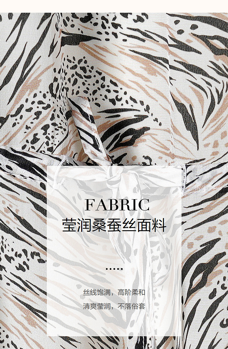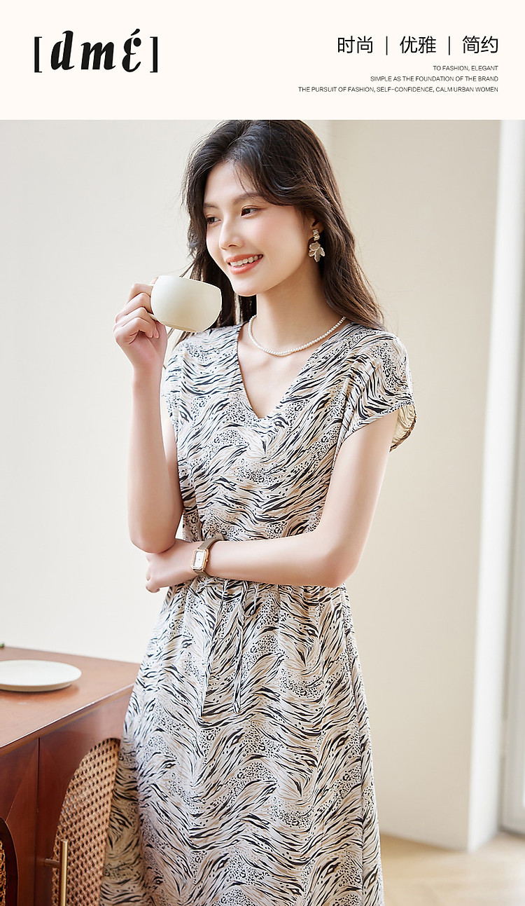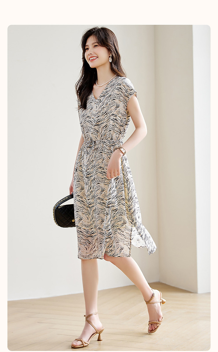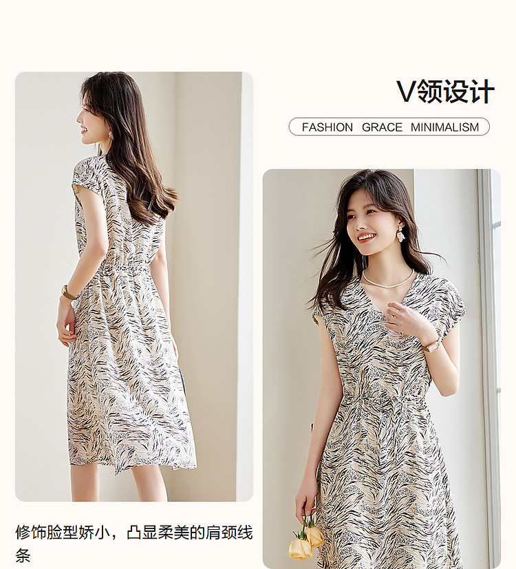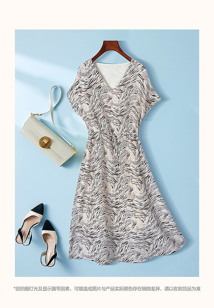 【文艺法风腔调】夏V领桑蚕丝调节腰印花抽绳直筒连衣裙 511361