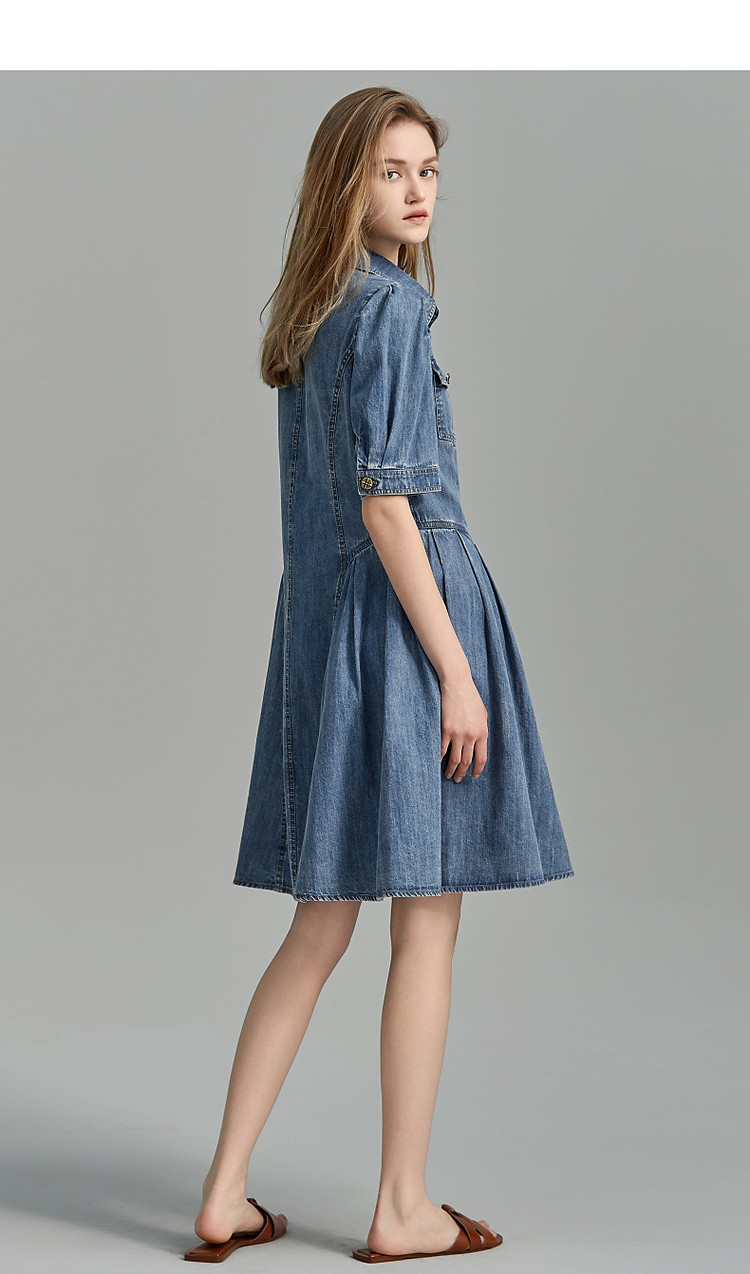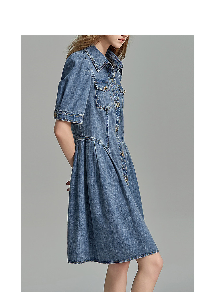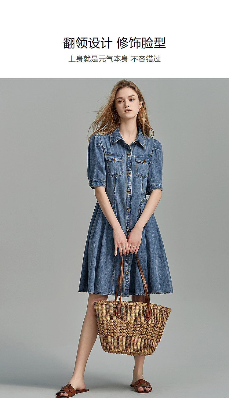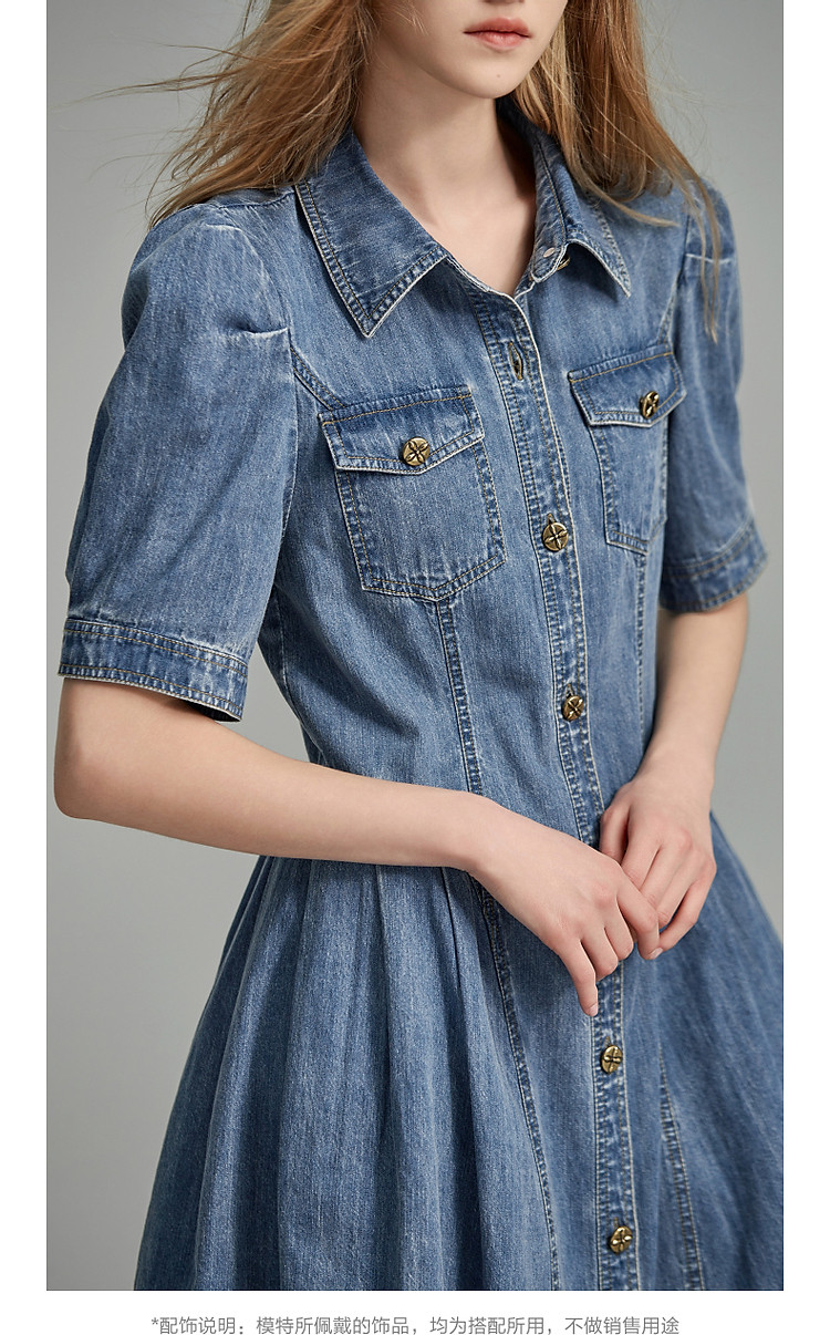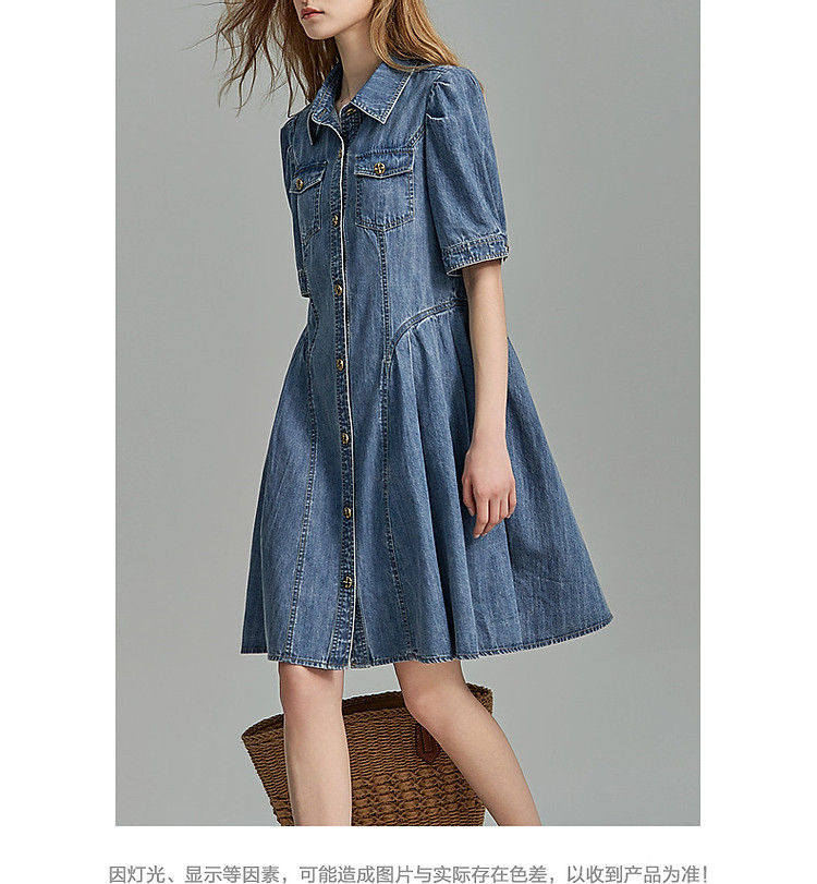 商品名称:【牛仔控B入】夏翻领收腰泡泡袖百褶100%棉牛仔连衣裙女中长 796481