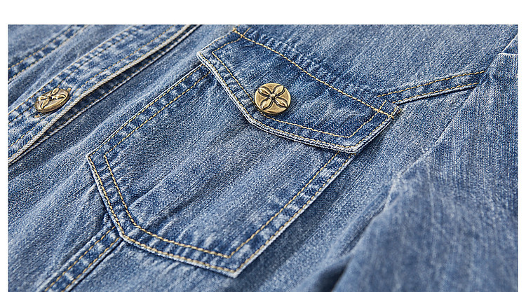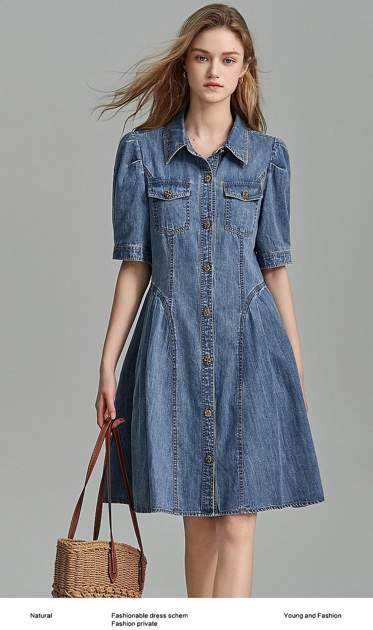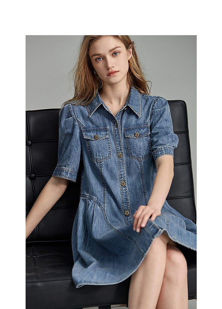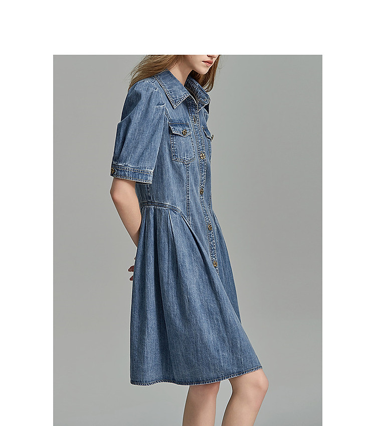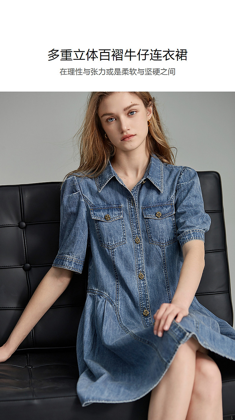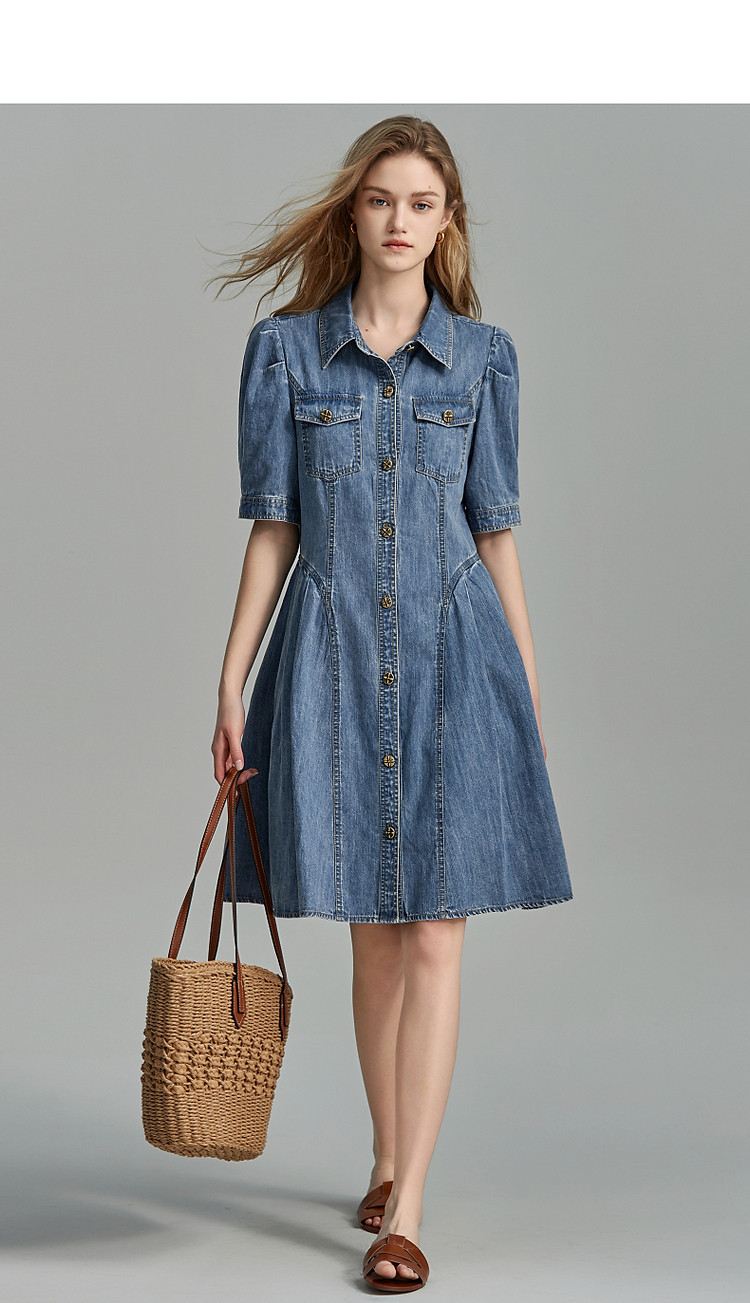 商品名称:【牛仔控B入】夏翻领收腰泡泡袖百褶100%棉牛仔连衣裙女中长 796481