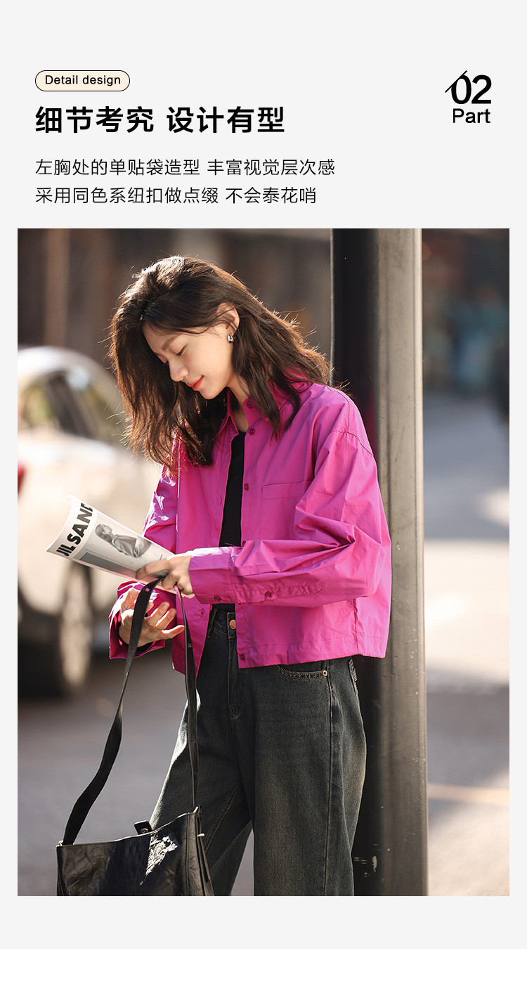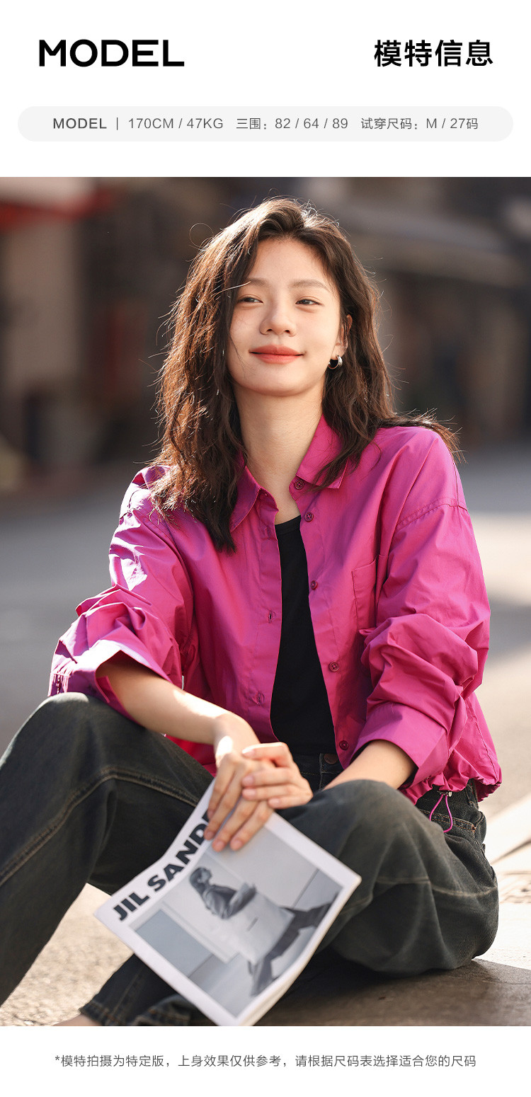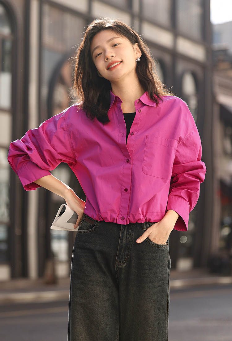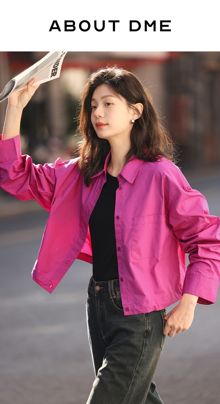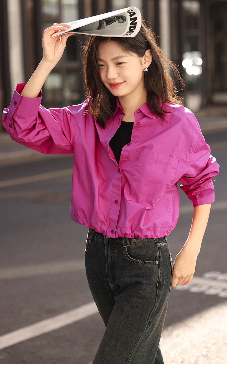 【亮眼玫紫色衬衫】秋款个性下摆抽绳短款松弛感衬衣女 092610