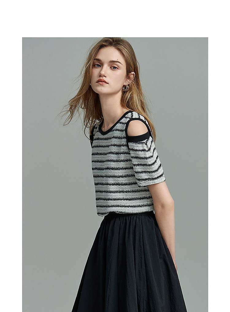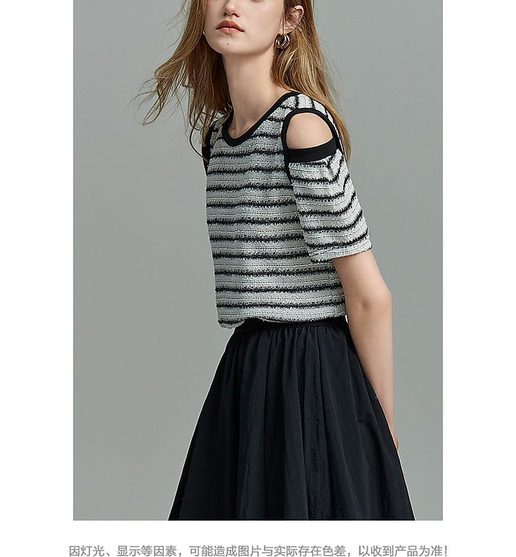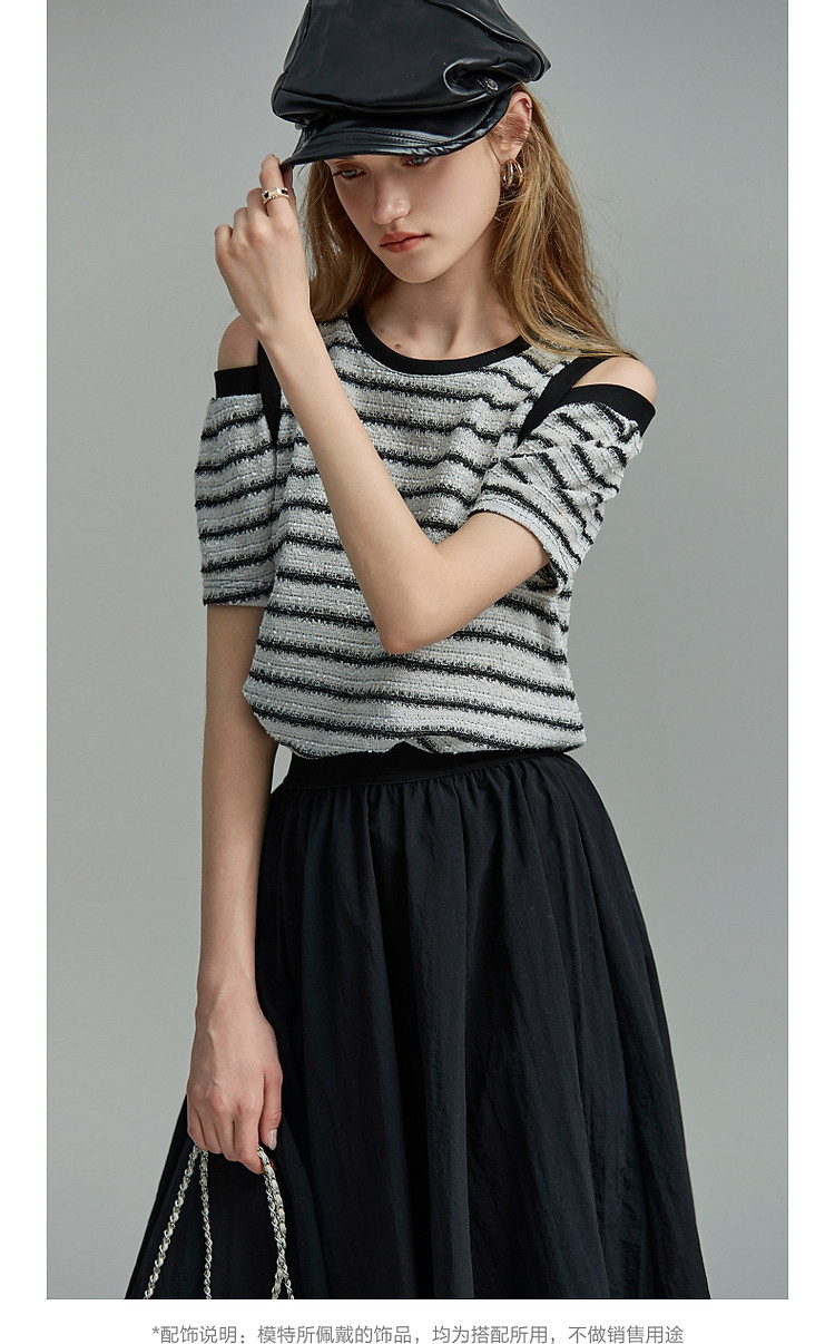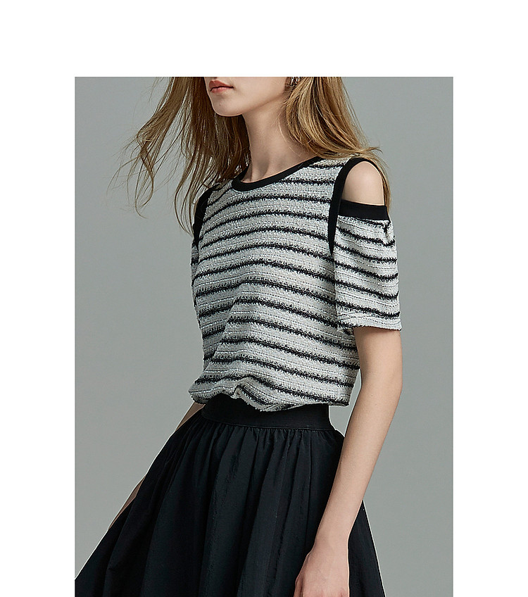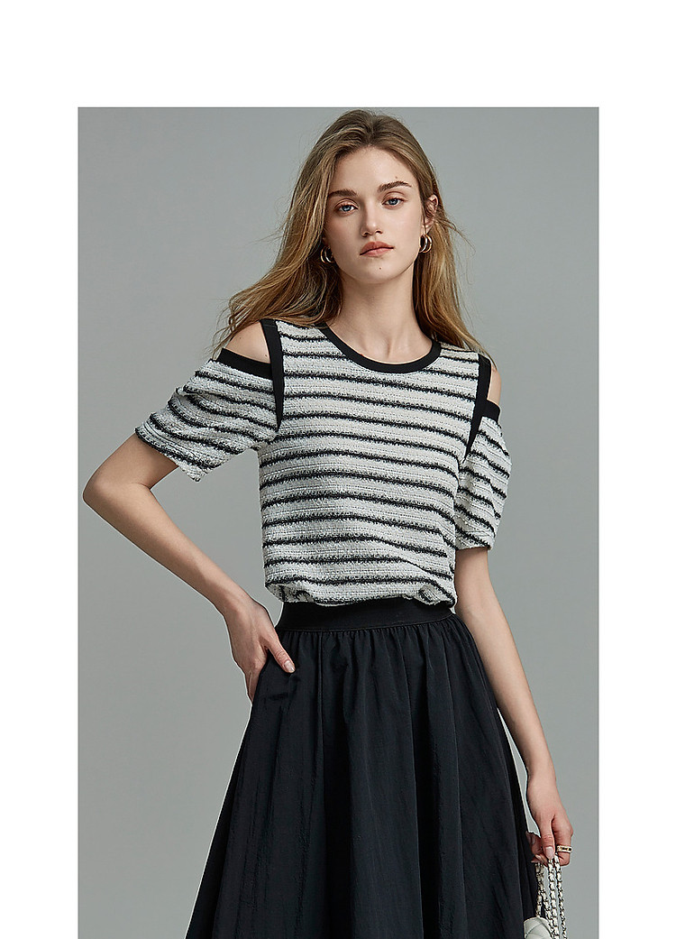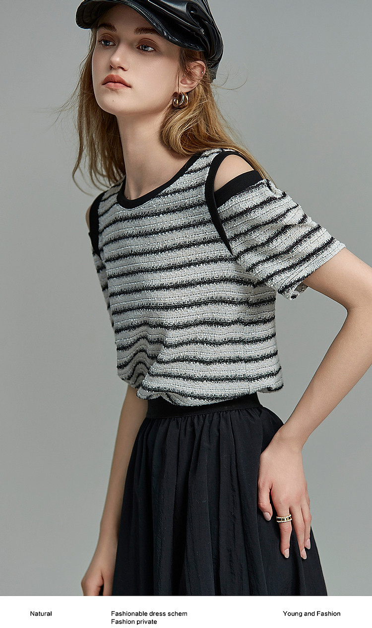 【时髦设计感露肩】夏都市通勤活力条纹t恤肌理质感女式t恤 355841