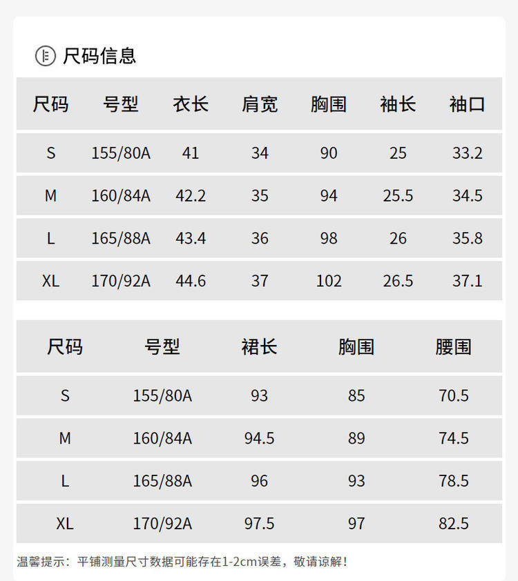 | 尺码 | 裙长(cm) | 肩宽(cm) | 袖长(cm) | 上装号型 | 下装号型 | 衣长(cm) | 腰围(cm) | 臀围(cm) | 胸围(cm) | 内胸围(cm) | 号型 |