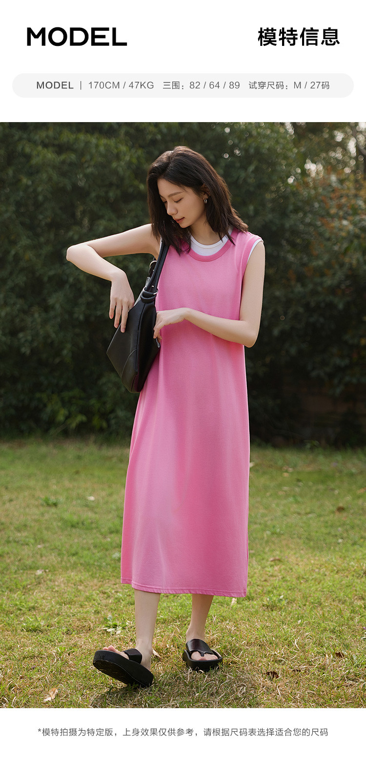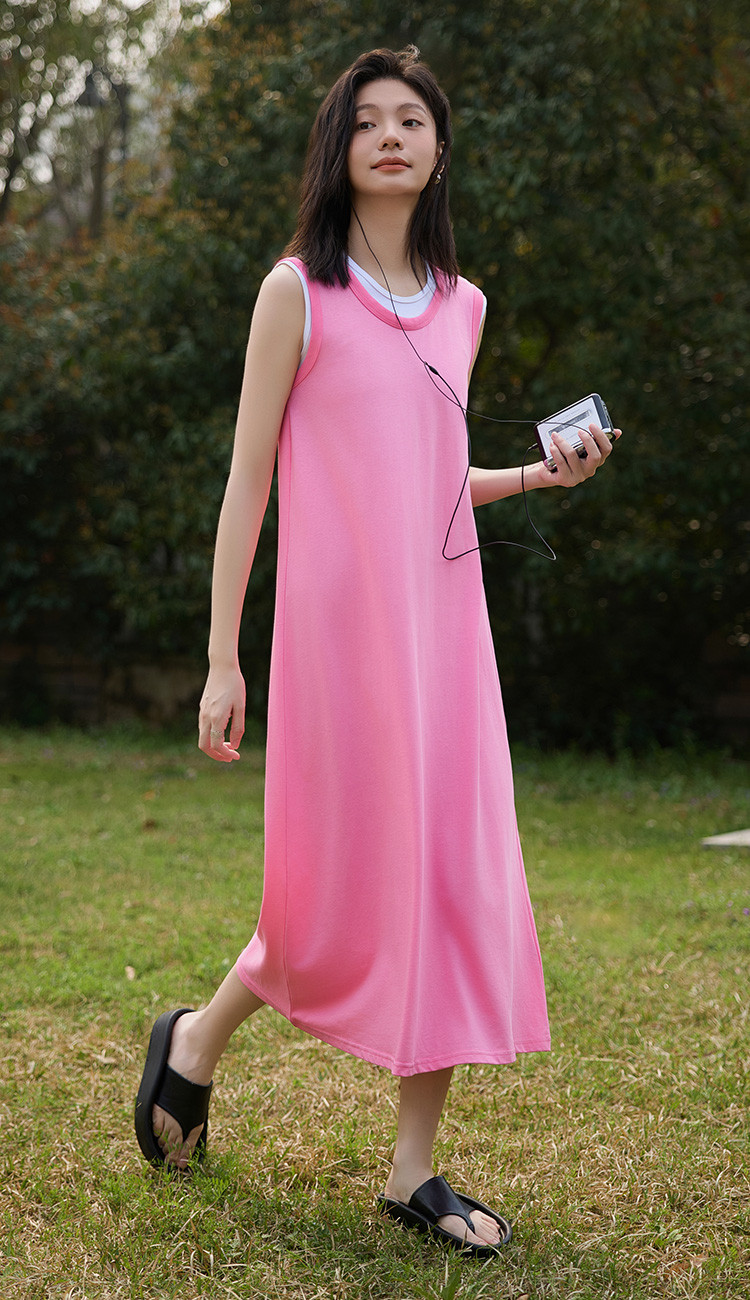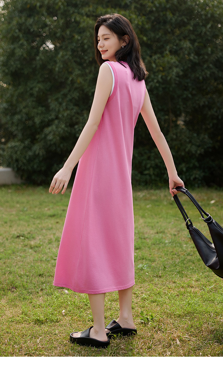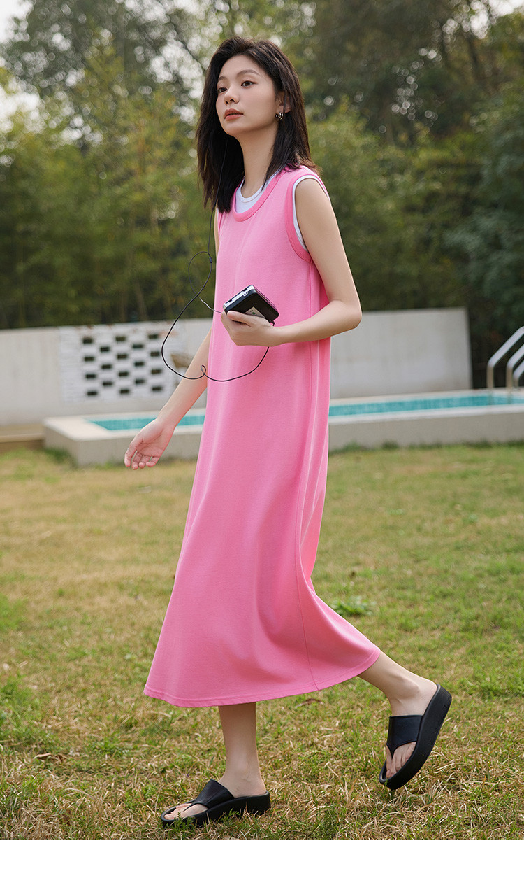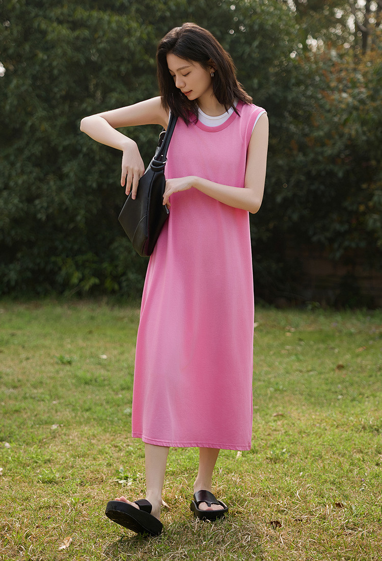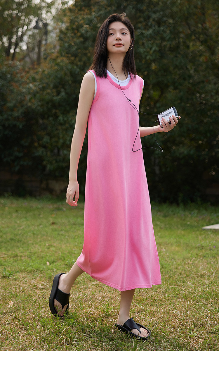 商品名称:【假两件粉白撞色长裙】夏款圆领无袖百搭针织长款连衣裙 051074