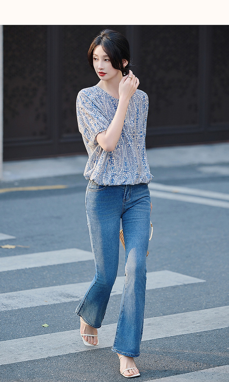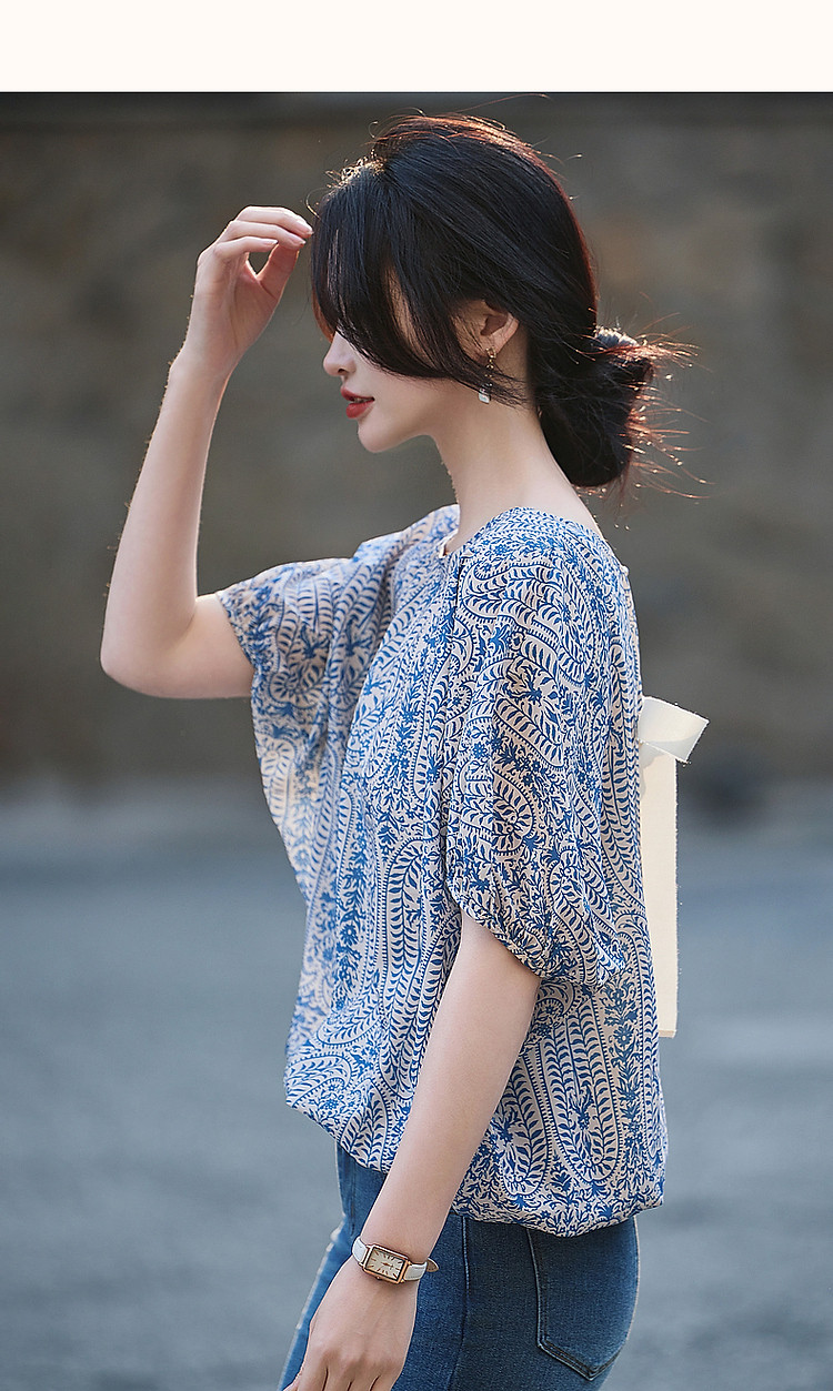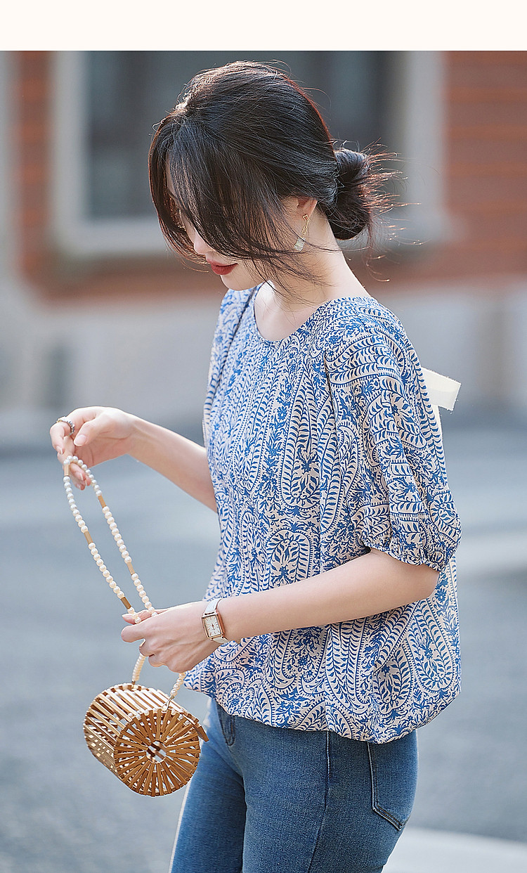 【艺术感后背镂空系带】夏文艺印花衬衫灯笼袖舒适遮肉衬衣女上衣 351937