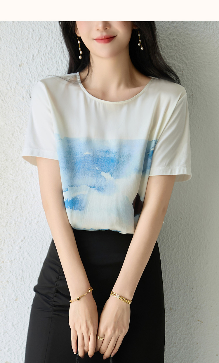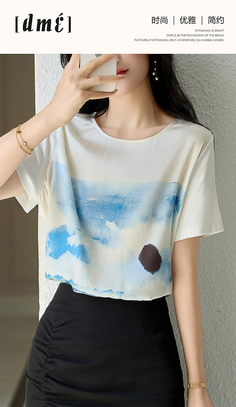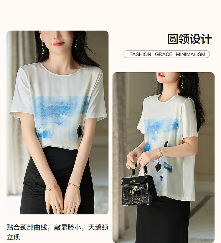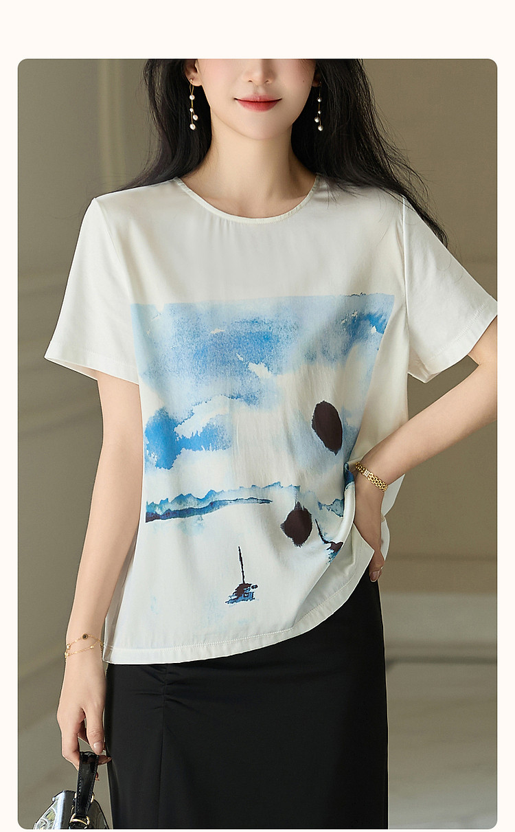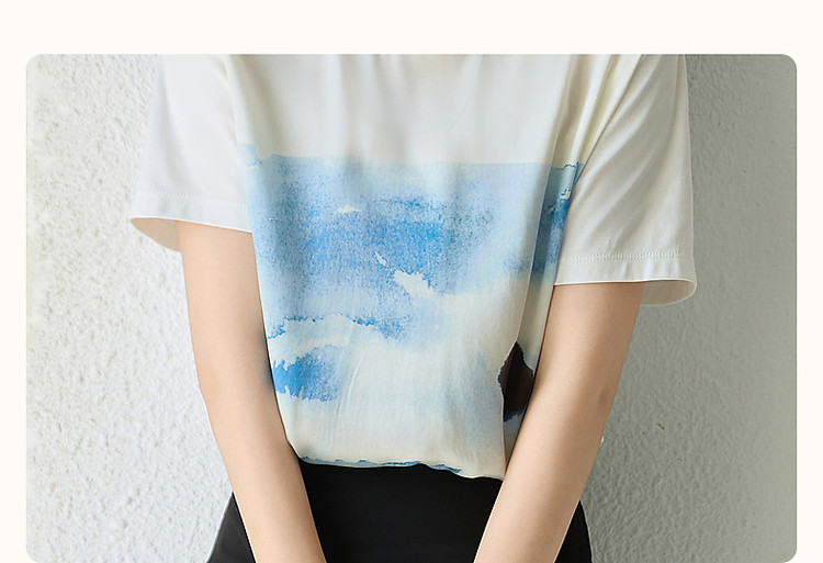 商品名称:【SPA级舒适】夏季桑蚕丝云氧棉山水印花短袖小个子女式t恤 925121