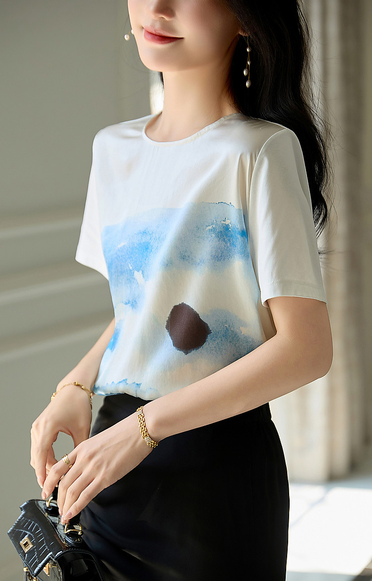 【SPA级舒适】夏季桑蚕丝云氧棉山水印花短袖小个子女式t恤 925121