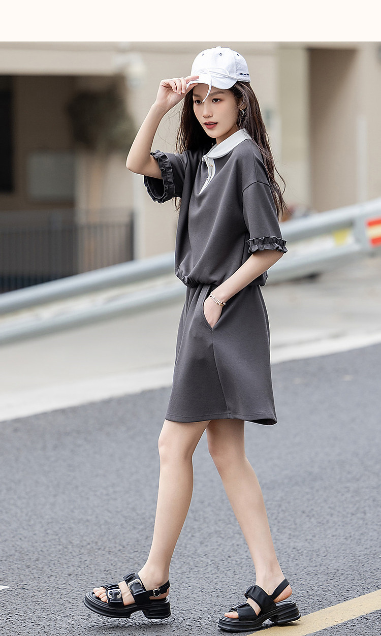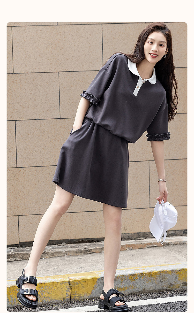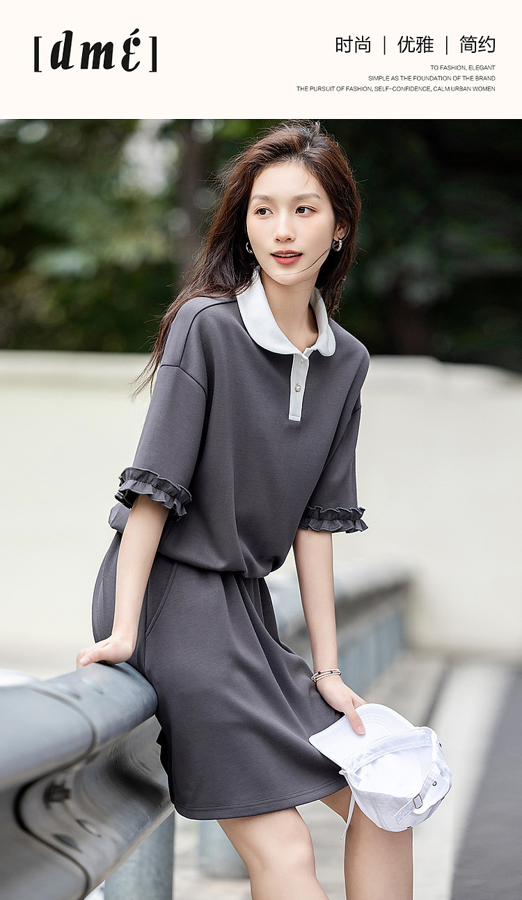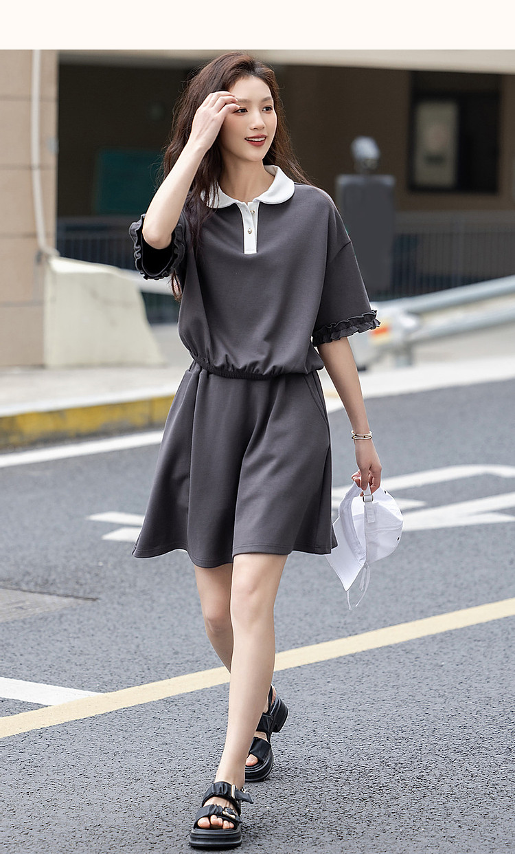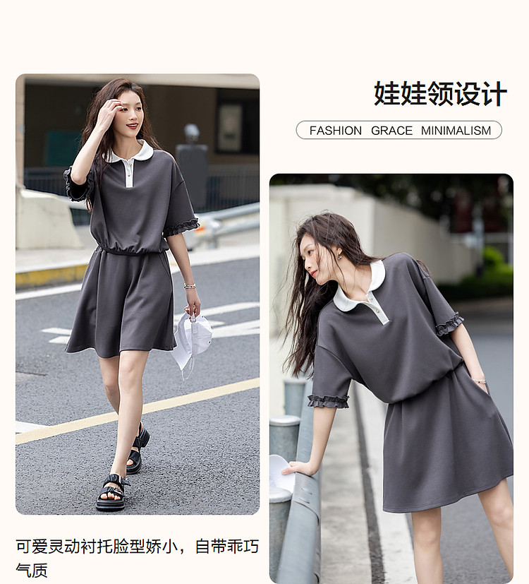 商品名称:【空气层套装】免搭娃娃领木耳边装饰短上衣撞色短裤卫衣两件套 438529