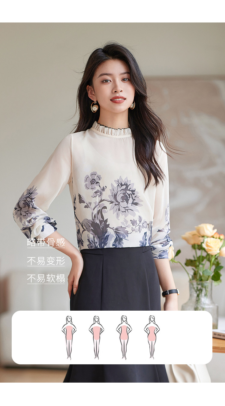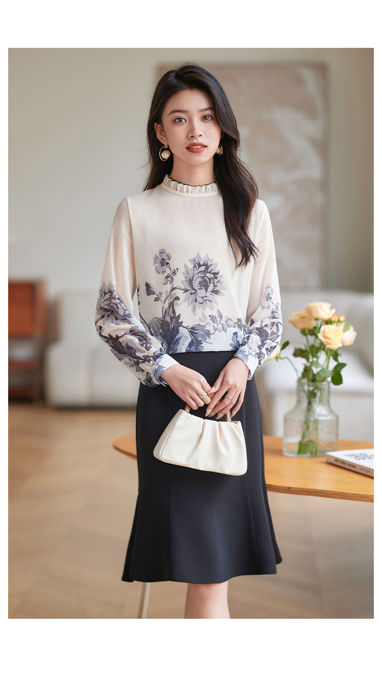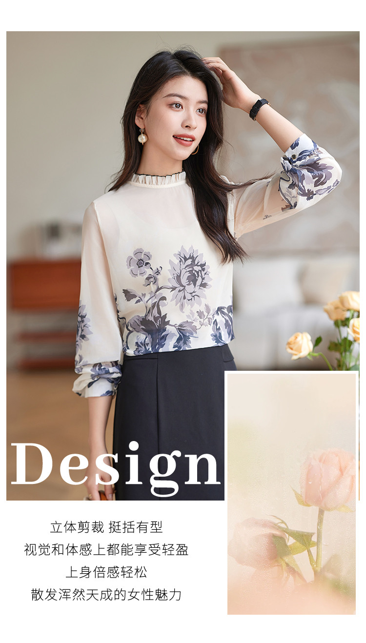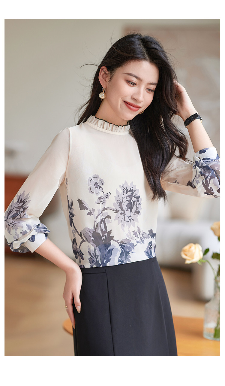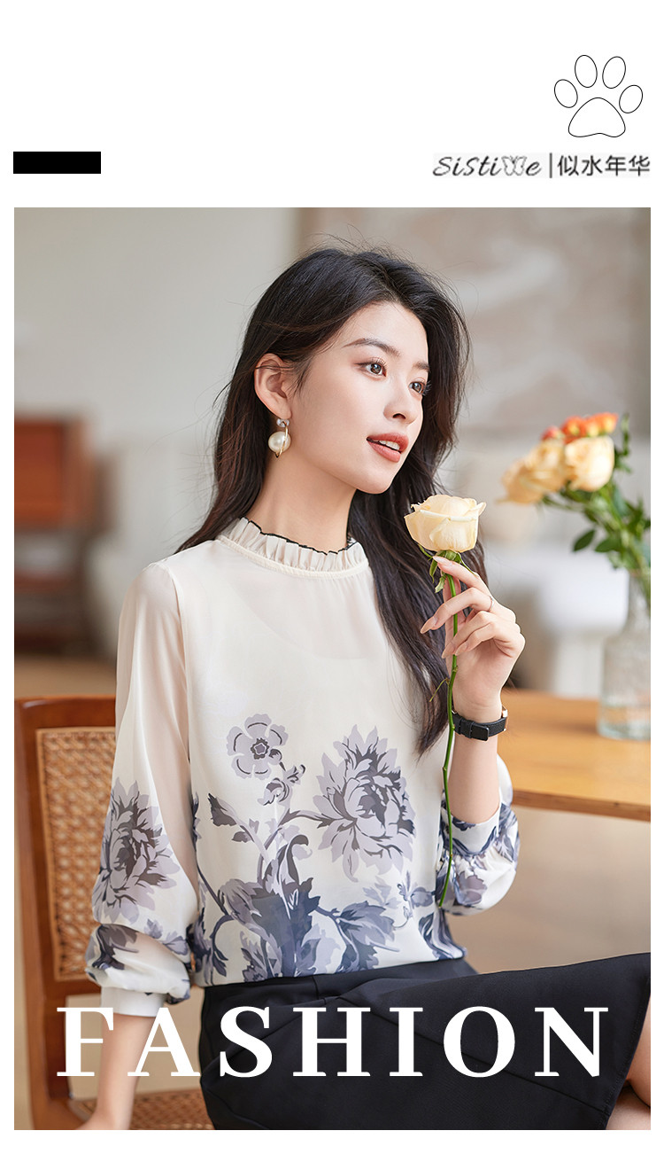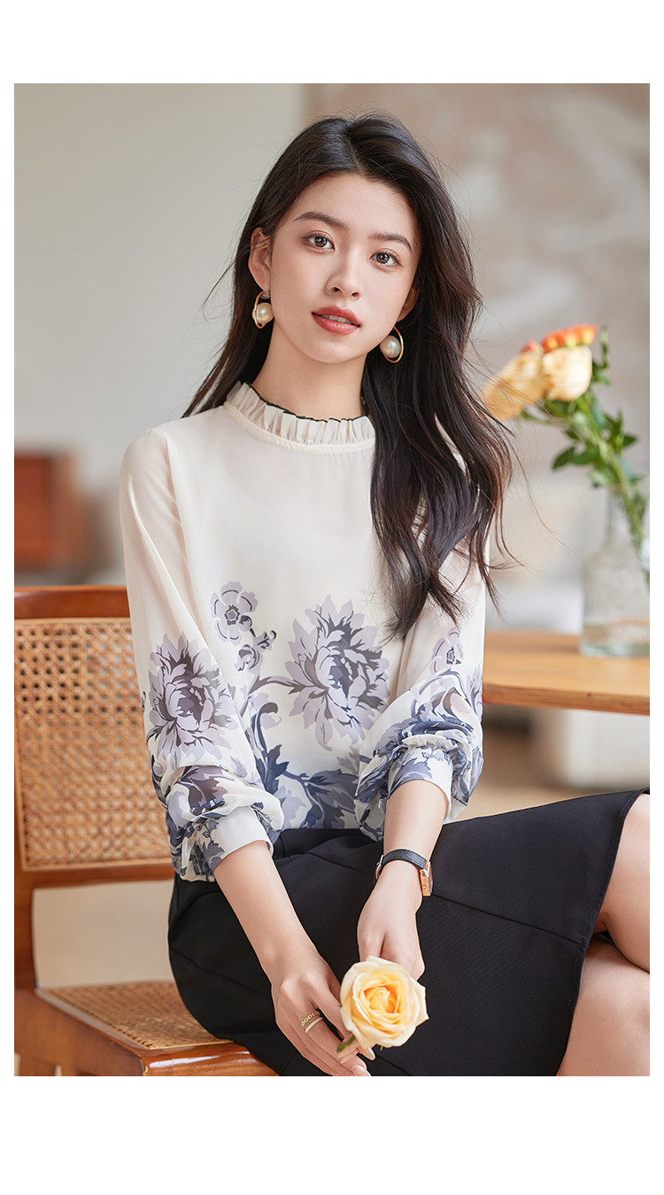 商品名称:时尚复古水墨印花女式衬衫女春季宽松气质显瘦木耳边长袖衬衣 508056