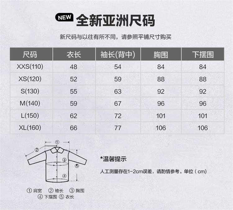 | 120cm(XS) | 52 | 120 | 59 | 6-7岁 | 88 | 120/59 |