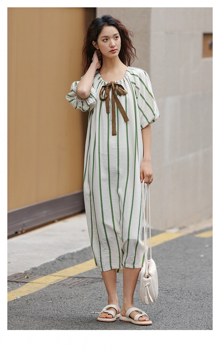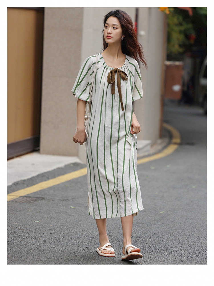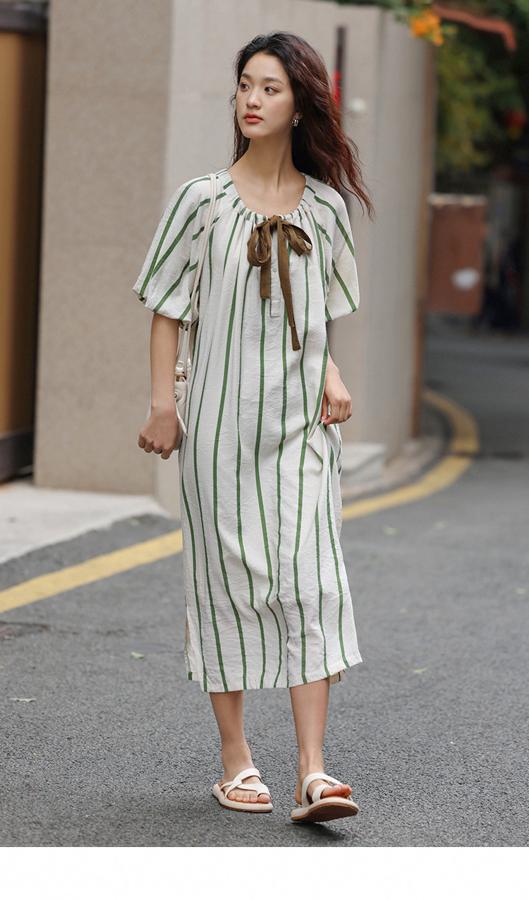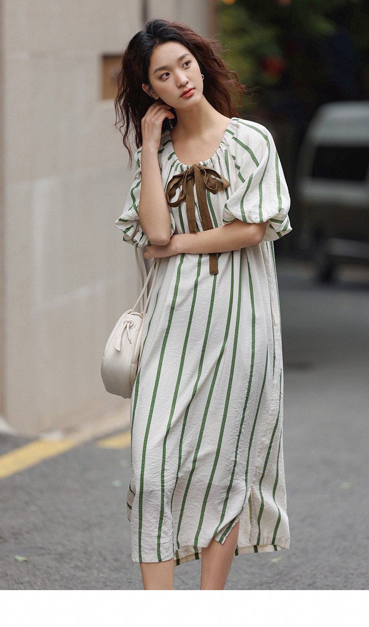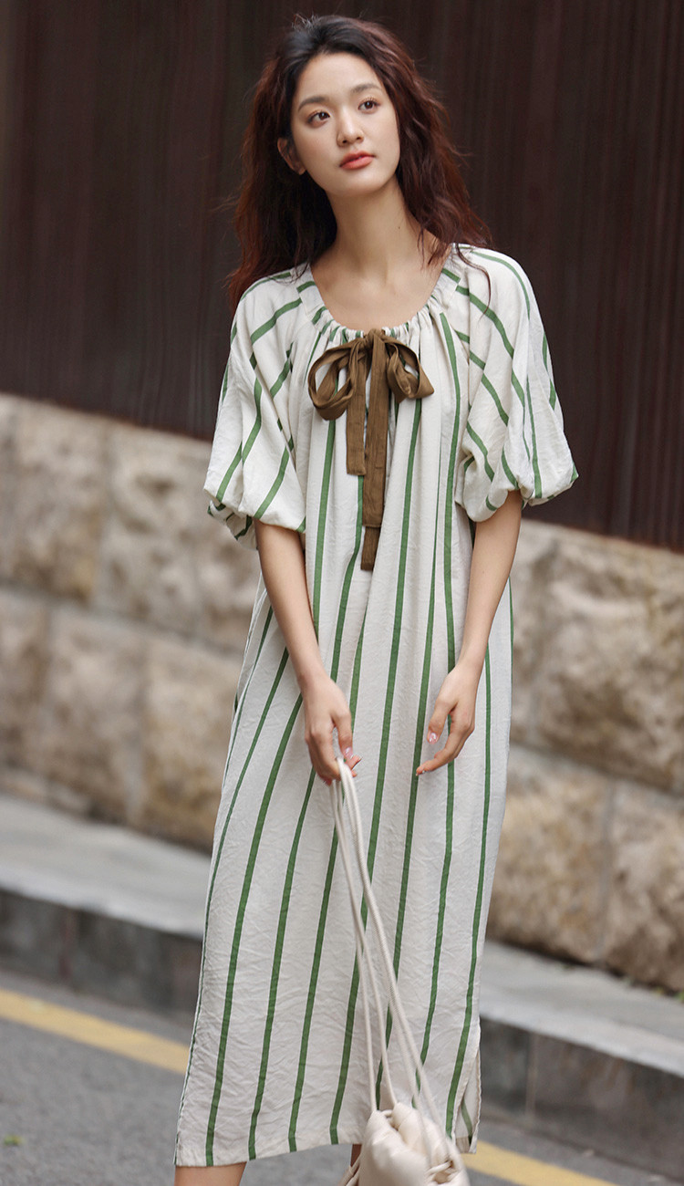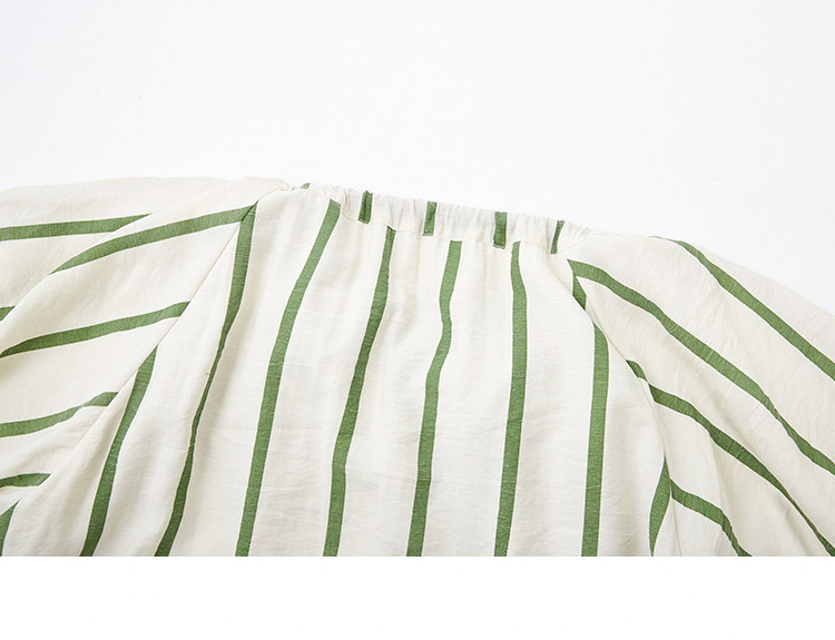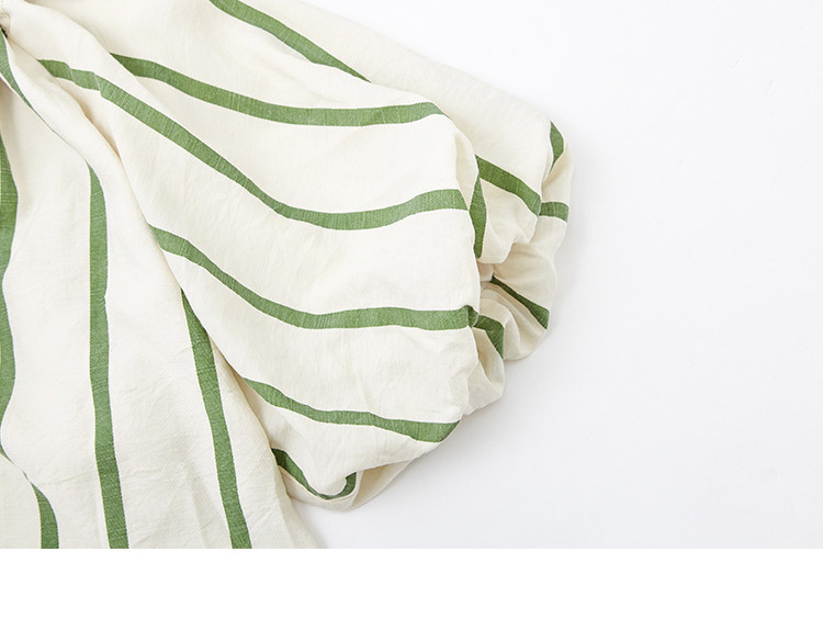 【简约绿条纹连衣裙】可调节领子下摆侧缝开叉中长款连衣裙 625794