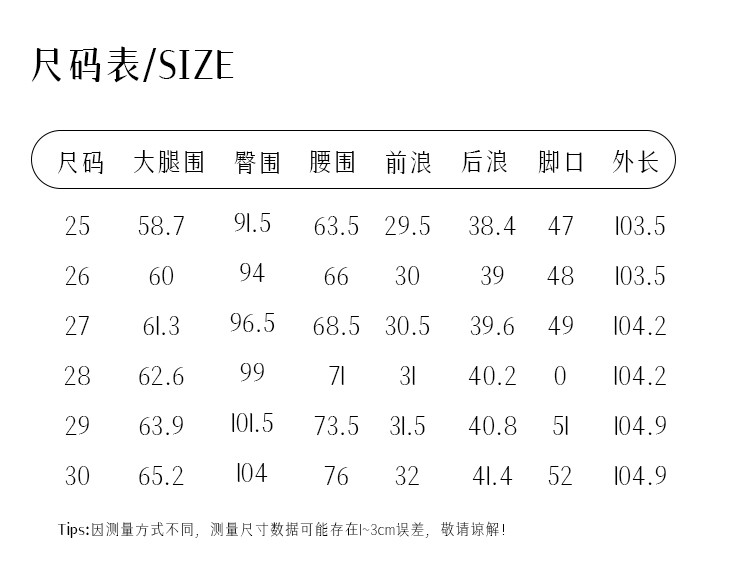 | 尺码 | 大腿围(cm) | 裤脚围(cm) | 前浪(cm) | 后浪(cm) | 腰围(cm) | 裤长(cm) | 膝围(cm) | 臀围(cm) | 号型 |