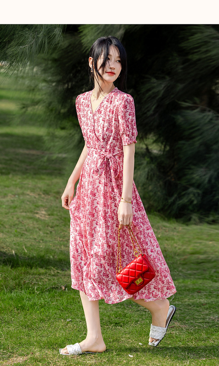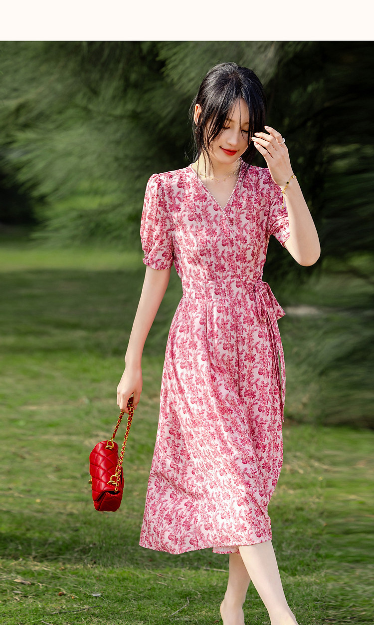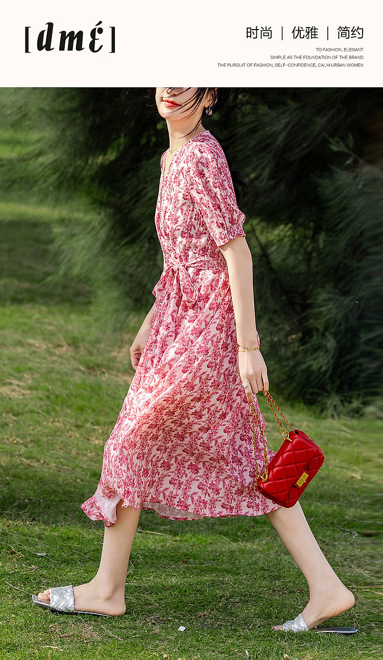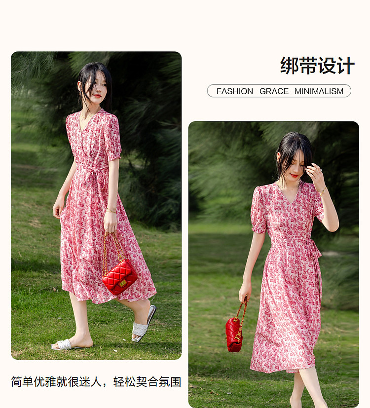 商品名称:【唯美雪纺茶歇裙】夏优雅风法式V领收腰印花珍珠链绑带连衣裙 976513