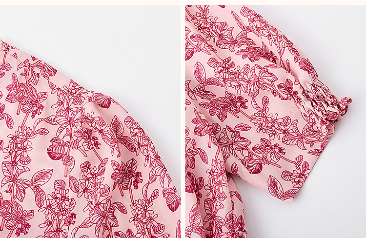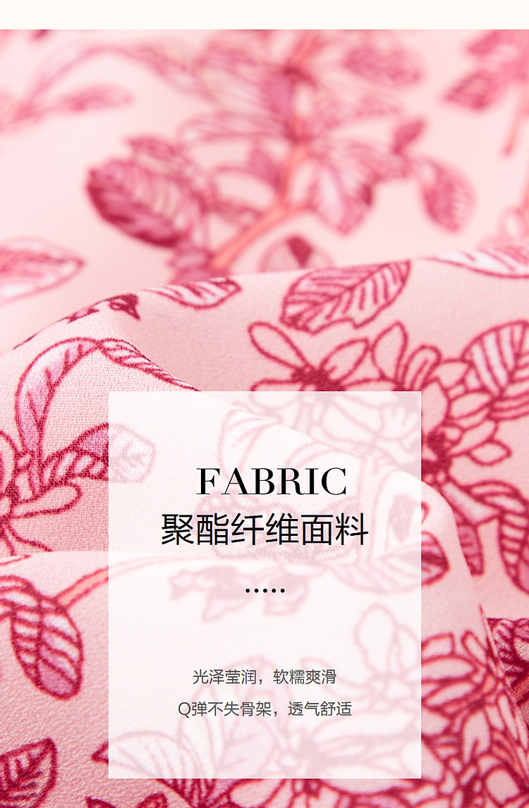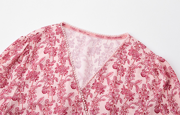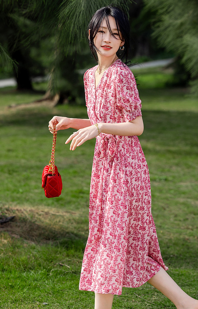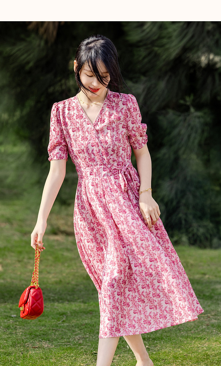 商品名称:【唯美雪纺茶歇裙】夏优雅风法式V领收腰印花珍珠链绑带连衣裙 976513