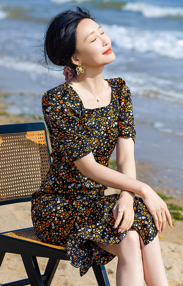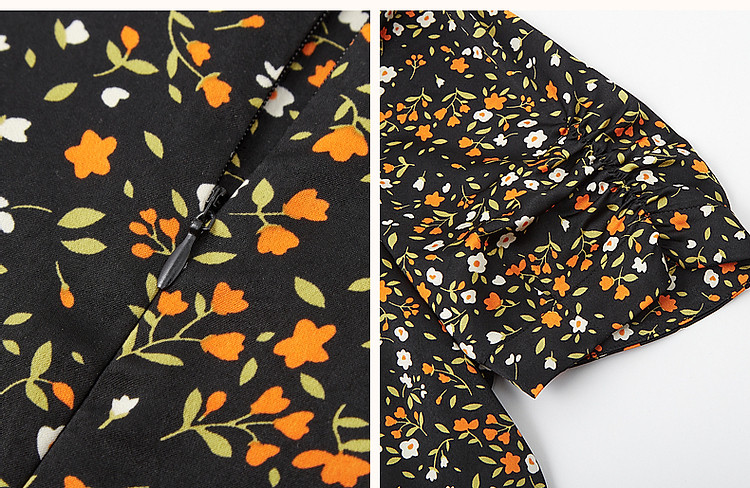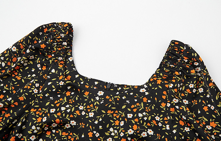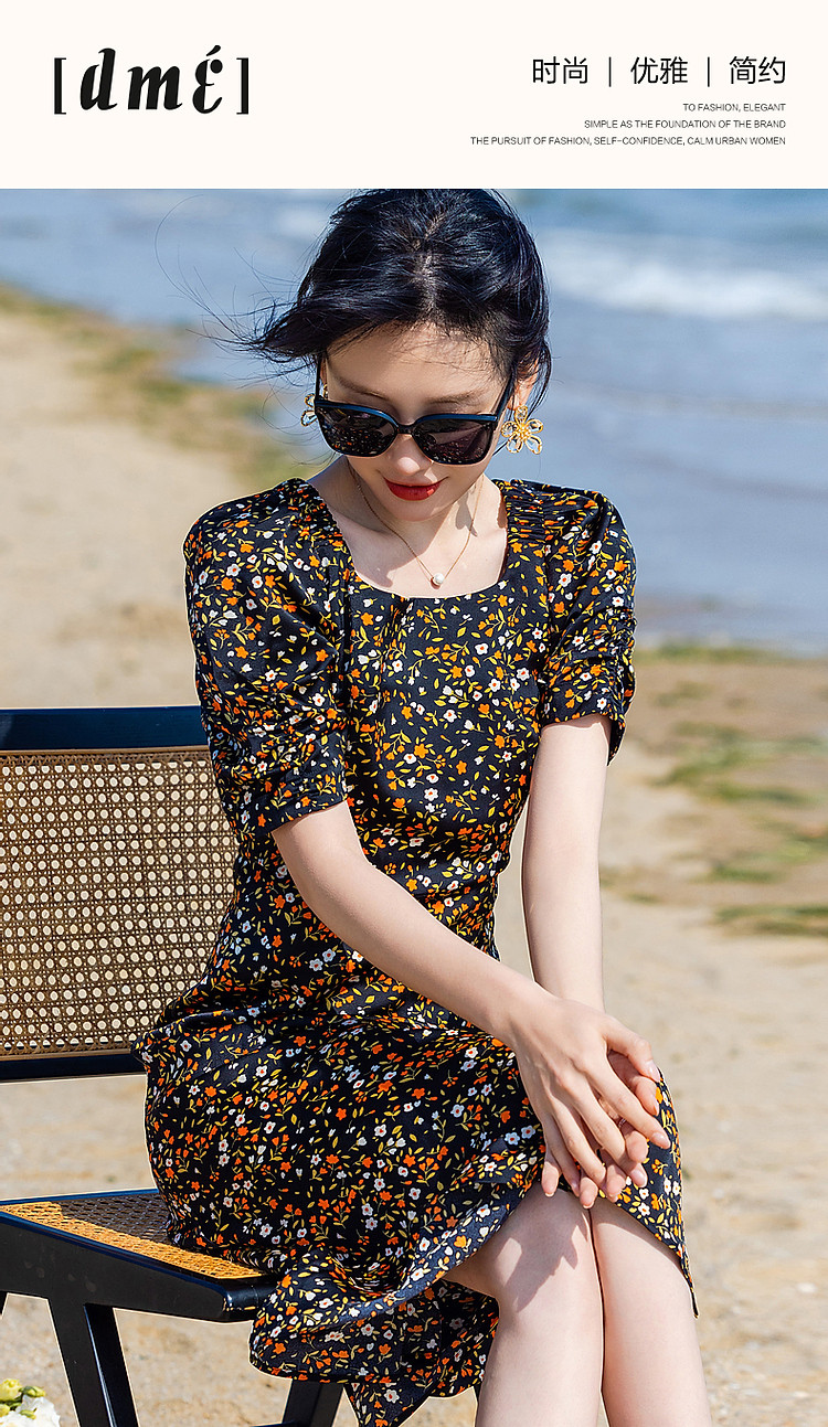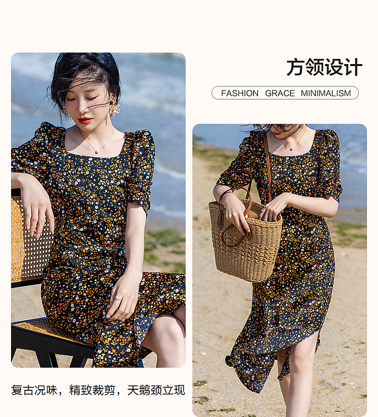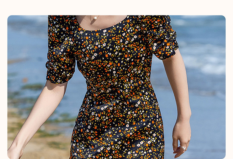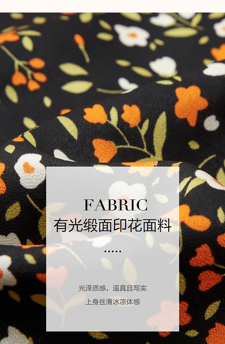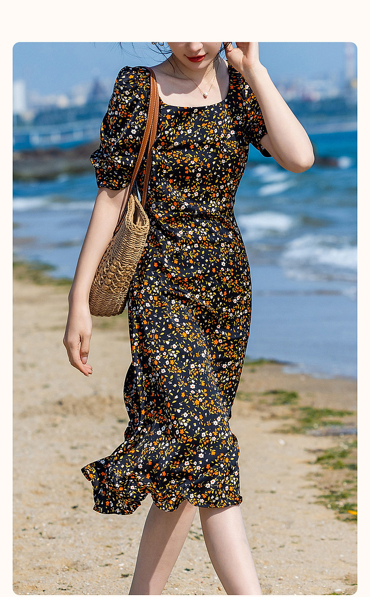 商品名称:【植物系女子】方领有光缎面印花泡泡袖茶歇裙收腰连衣裙女中长款 179713