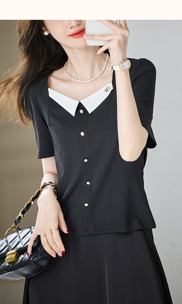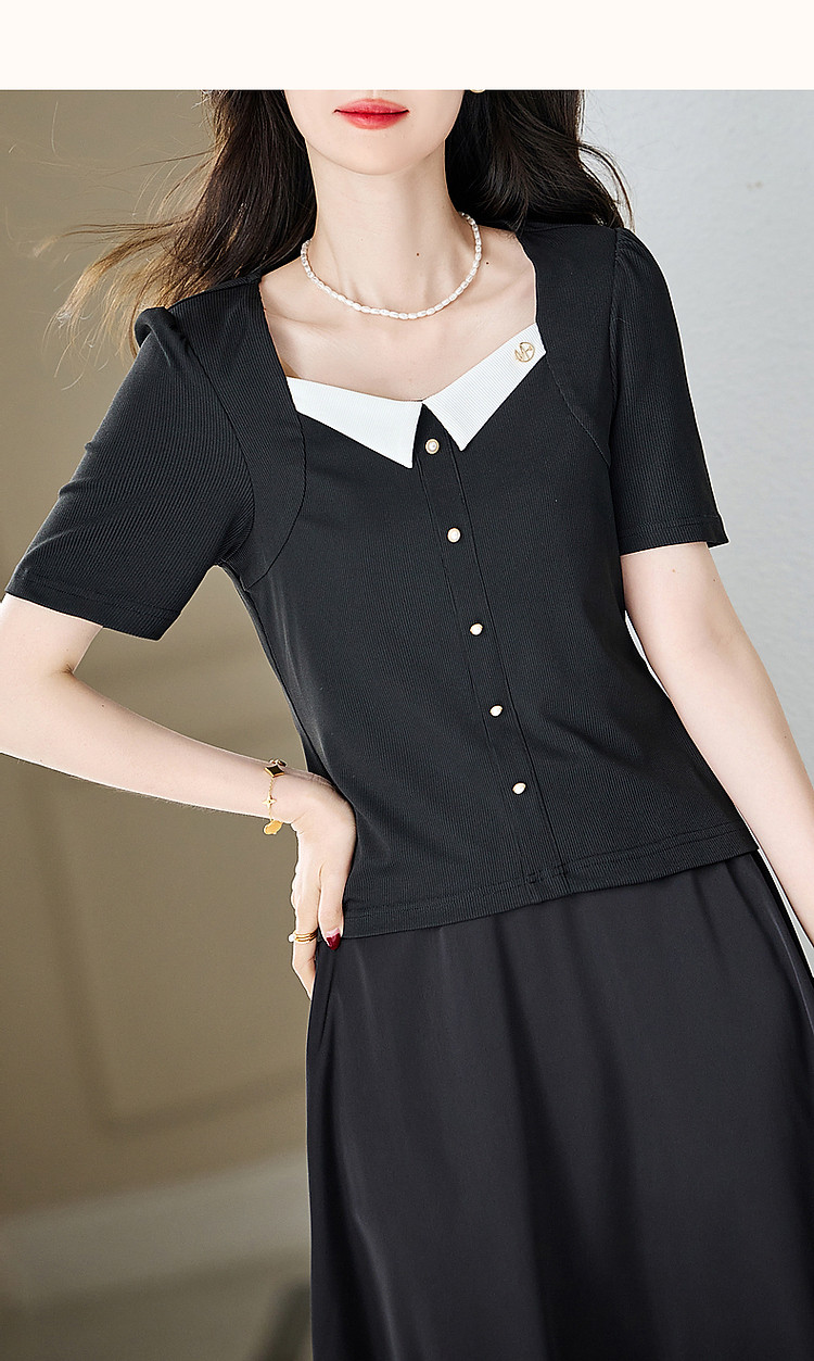 【奥赛罗公主】夏美式甜心方领短袖t恤女泡泡袖拼色针织女式t恤 454081