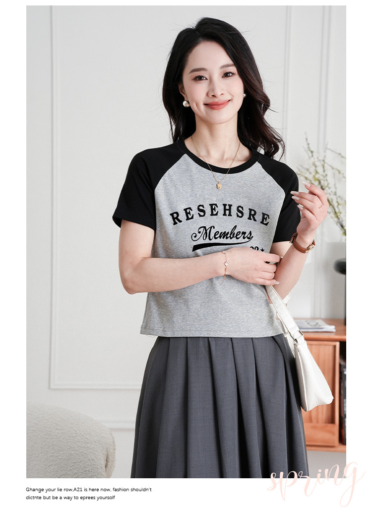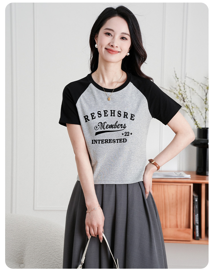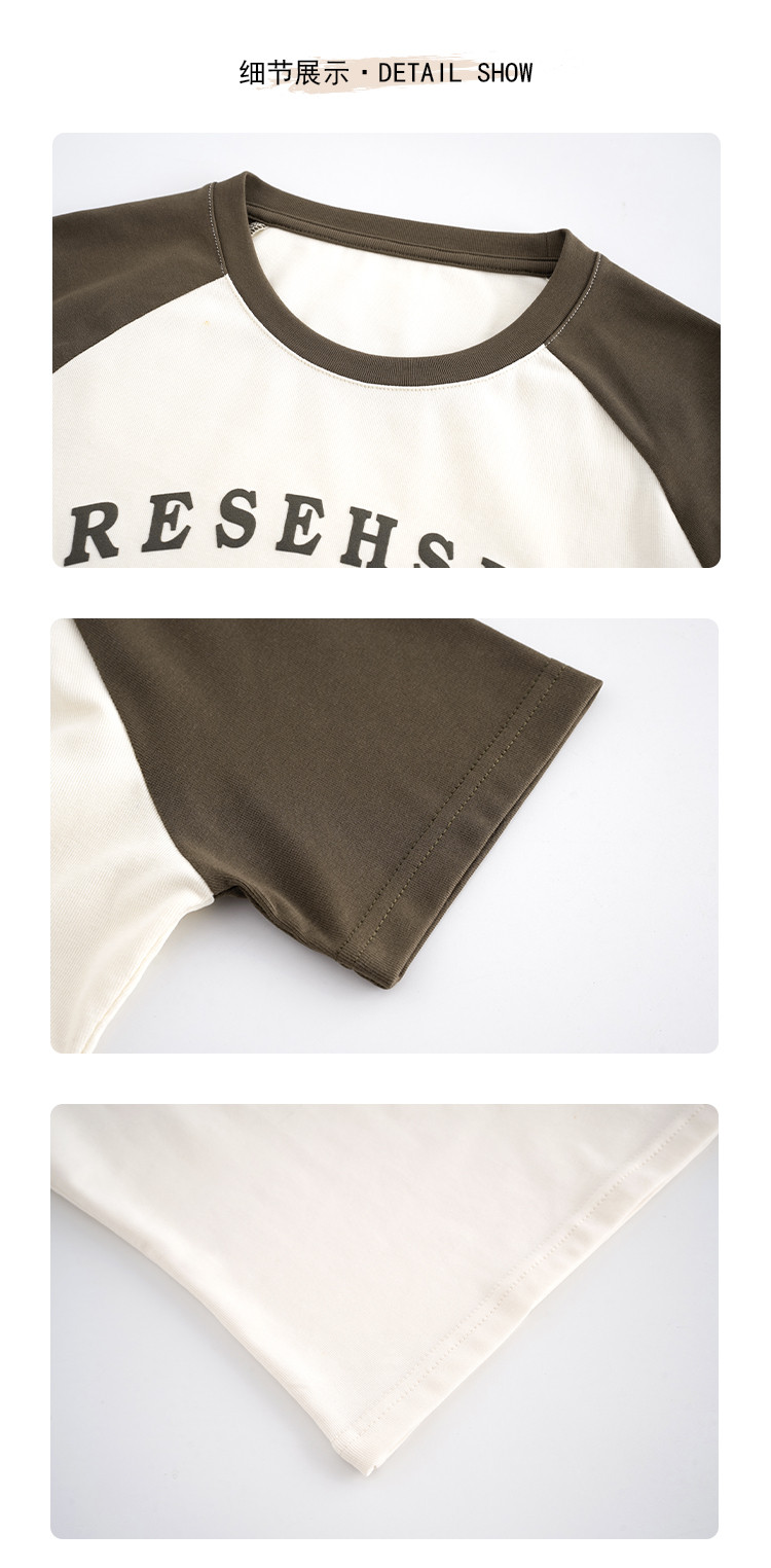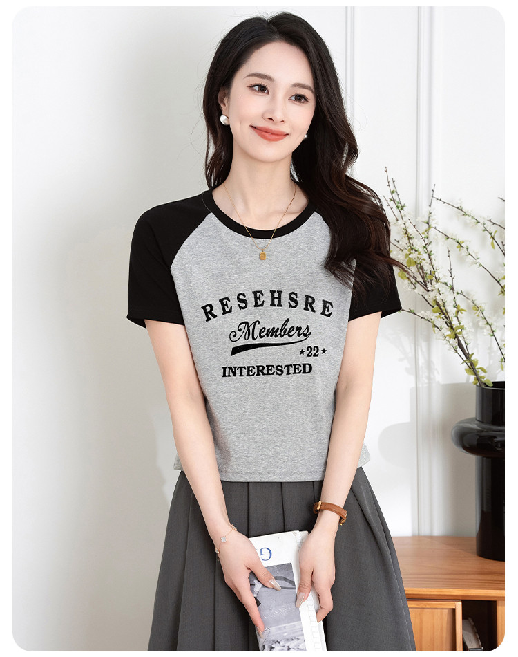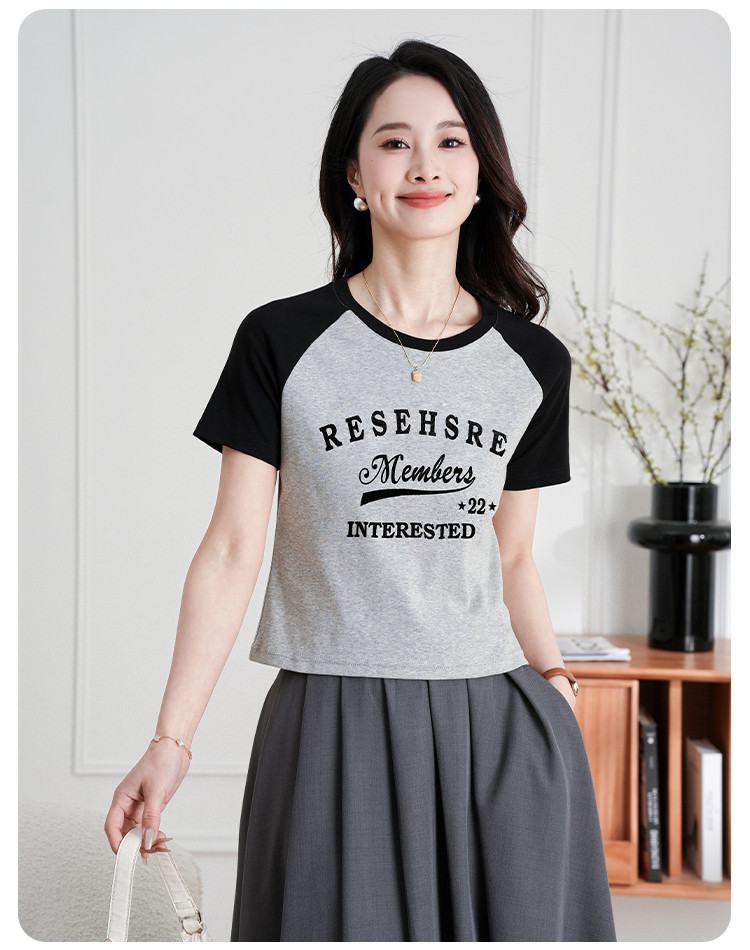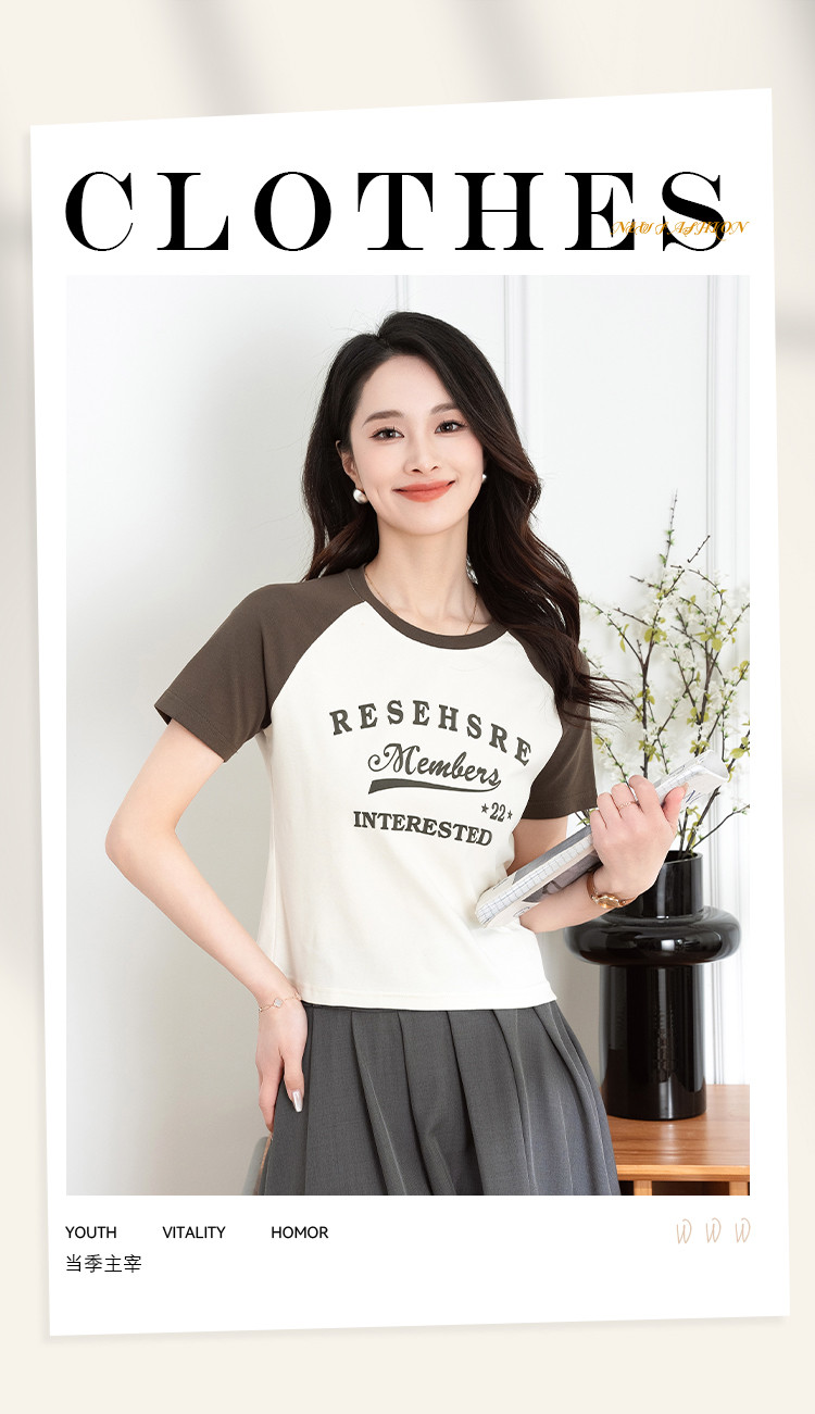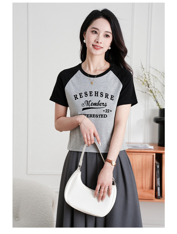 商品名称:夏季爆款印花别致插肩袖圆领短袖T恤女高弹舒适休闲修身短款上衣 324481