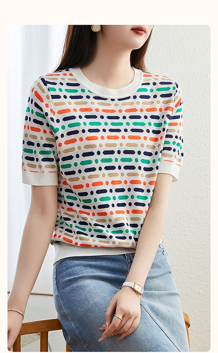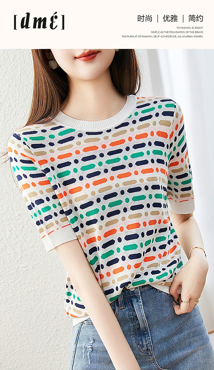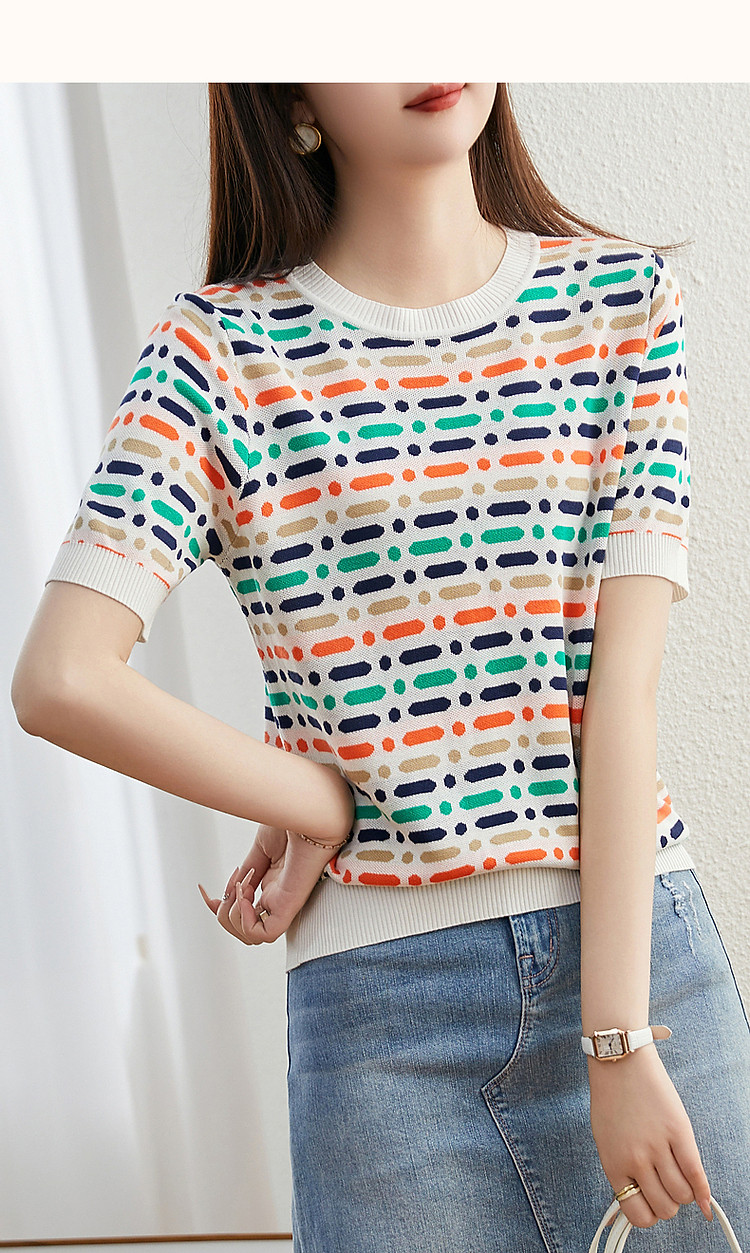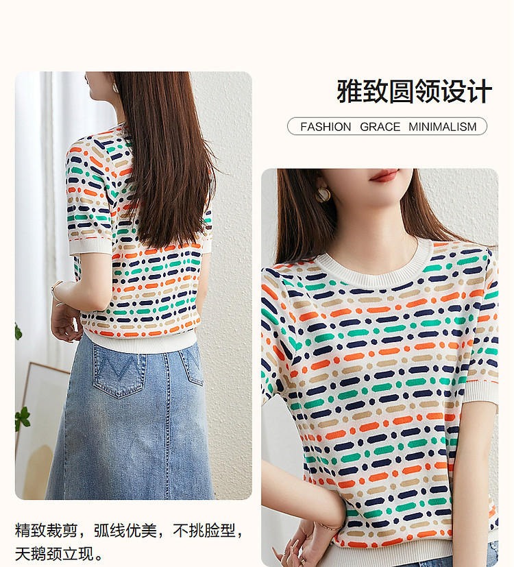 商品名称:【冰感撞色提花线衫】夏季多巴胺圆领短袖舒弹遮肉针织衫女上衣 524801