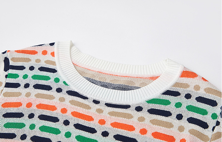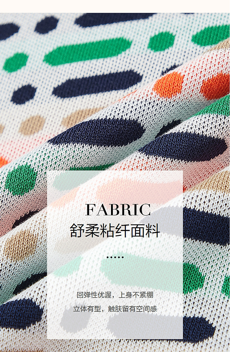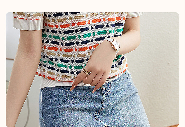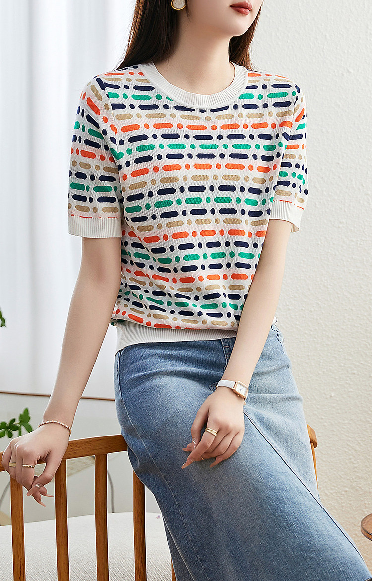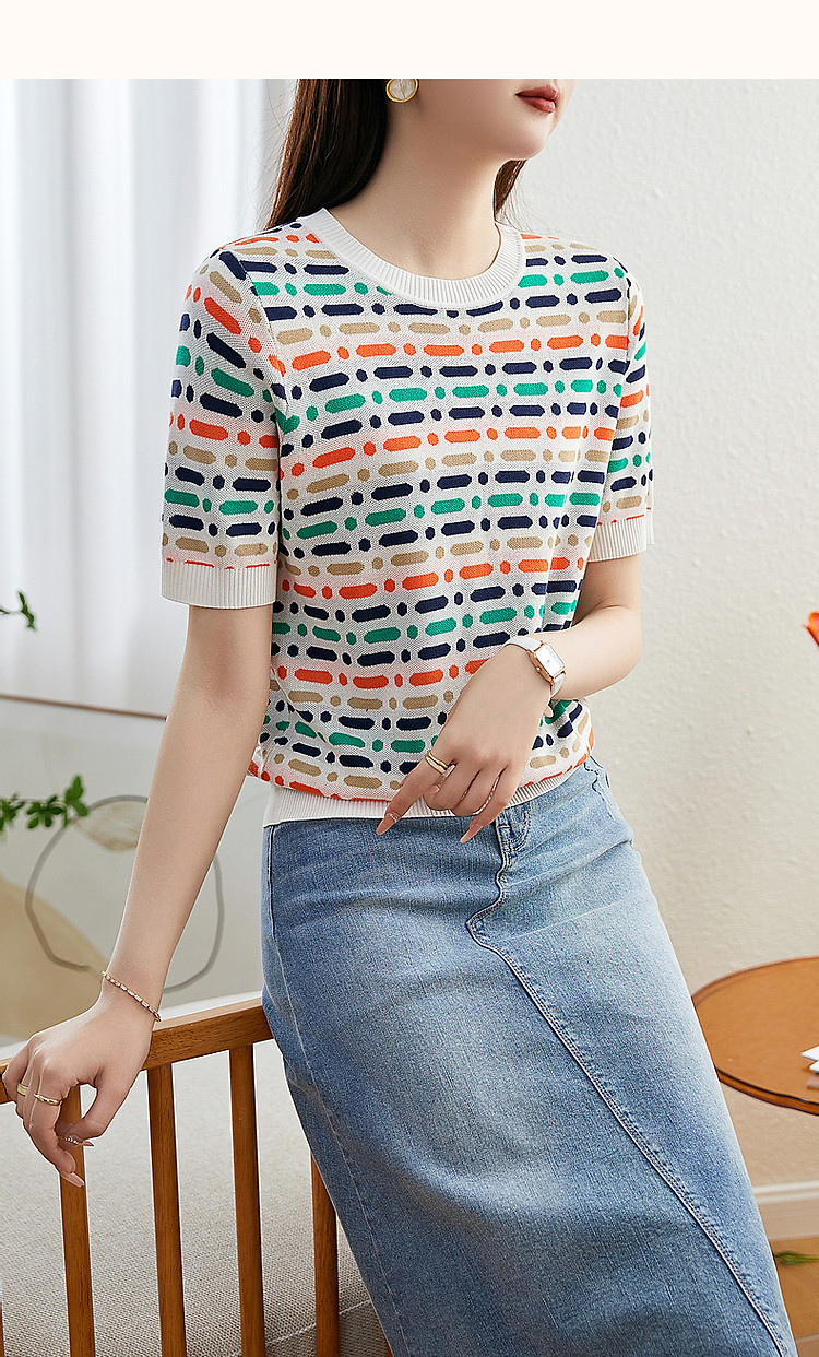 商品名称:【冰感撞色提花线衫】夏季多巴胺圆领短袖舒弹遮肉针织衫女上衣 524801