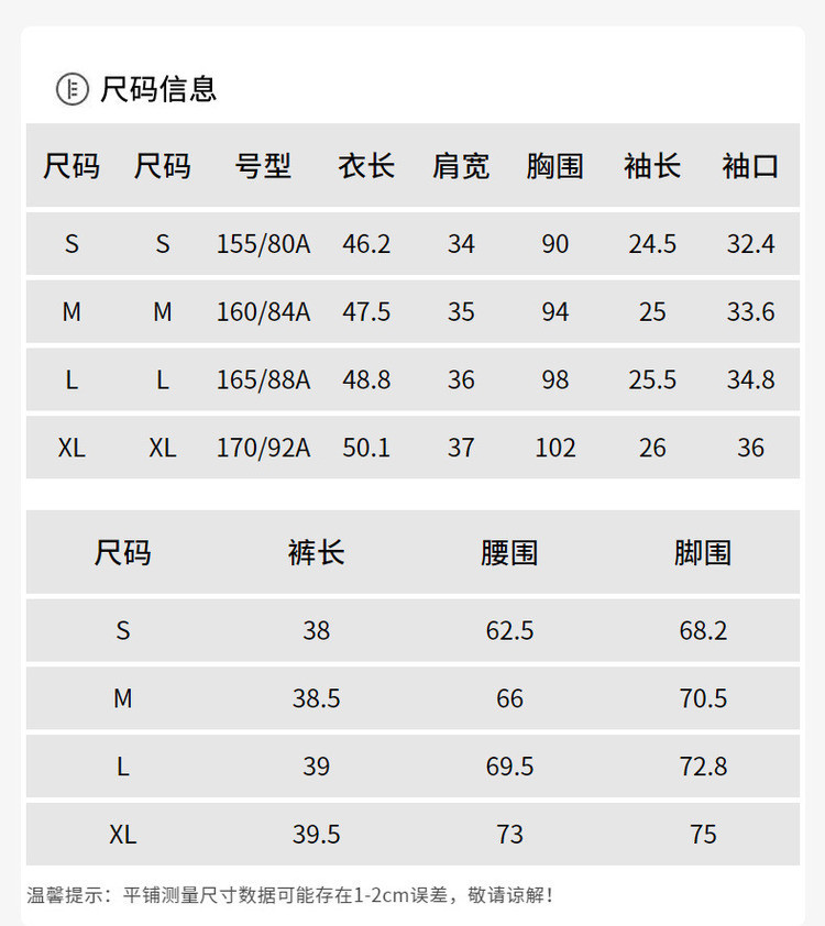 | 尺码 | 肩宽(cm) | 袖长(cm) | 上装号型 | 下装号型 | 衣长(cm) | 腰围(cm) | 裤长(cm) | 臀围(cm) | 胸围(cm) | 号型 |