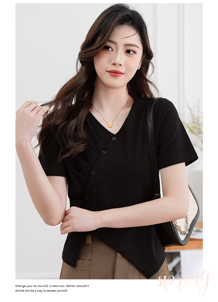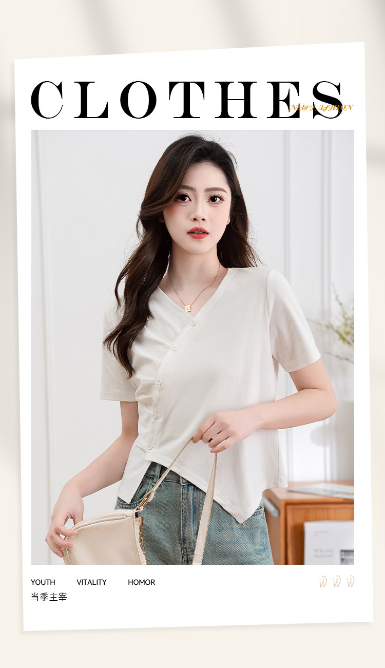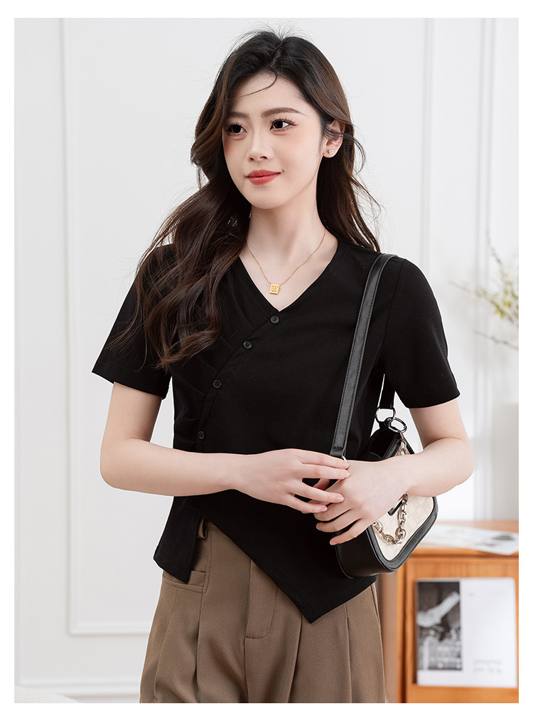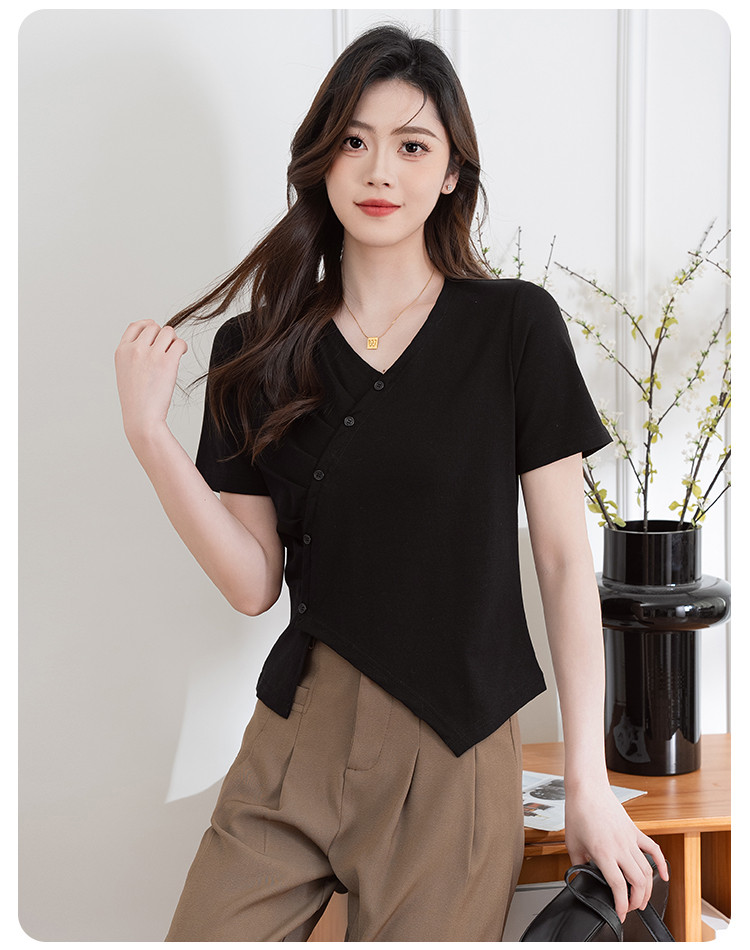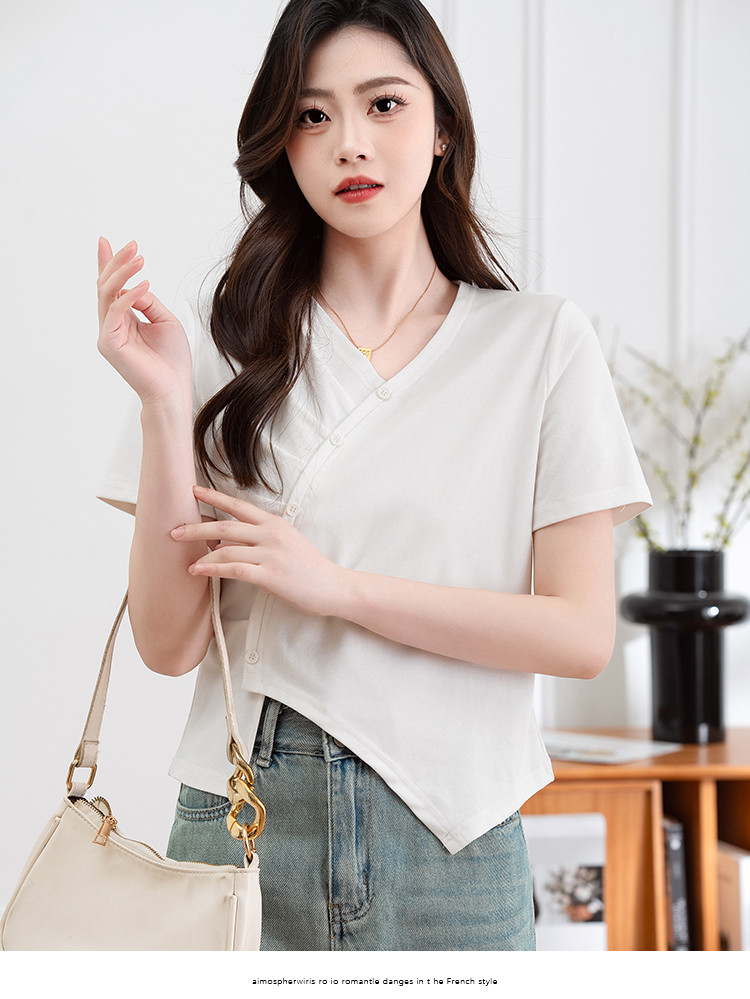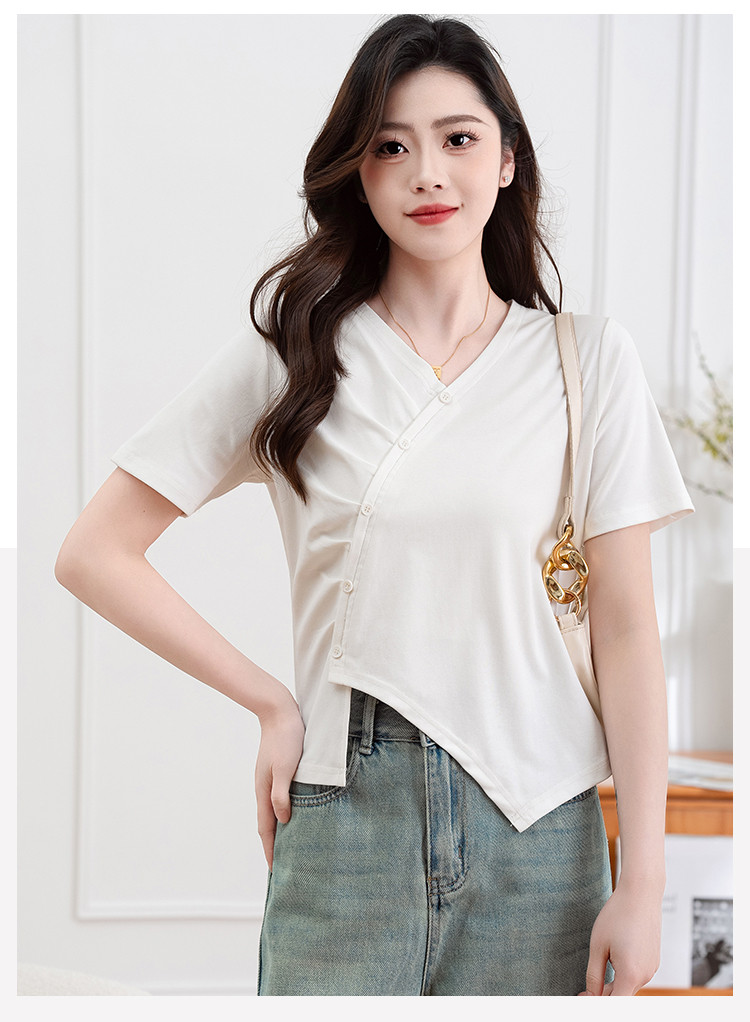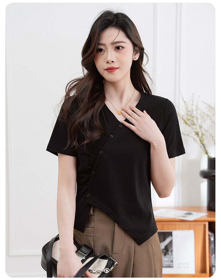 商品名称:设计独特不规则开叉斜排扣V领夏季短袖T恤女修身短款休闲上衣女 303617