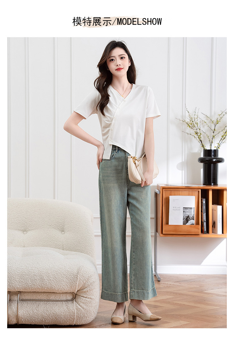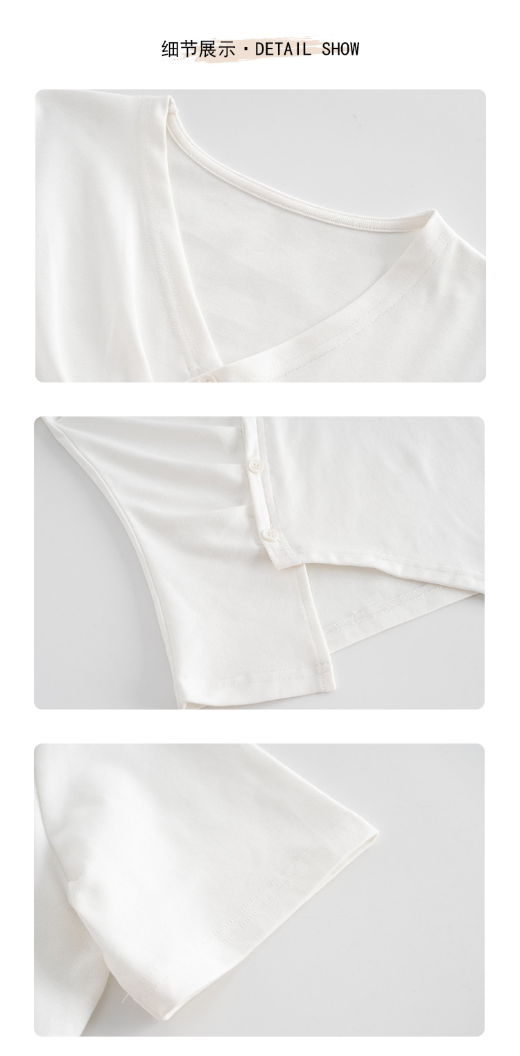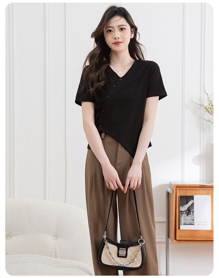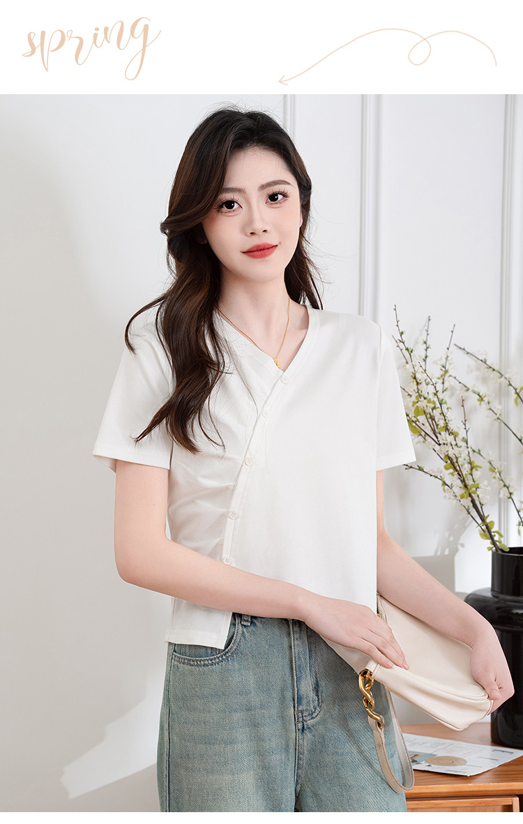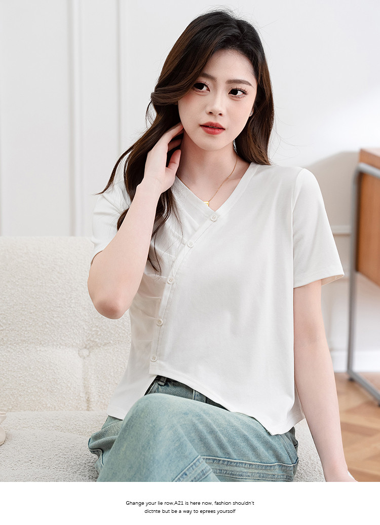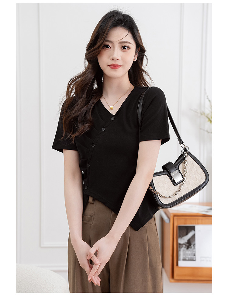 商品名称:设计独特不规则开叉斜排扣V领夏季短袖T恤女修身短款休闲上衣女 303617