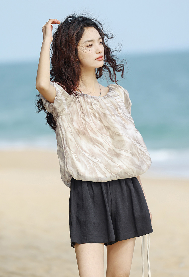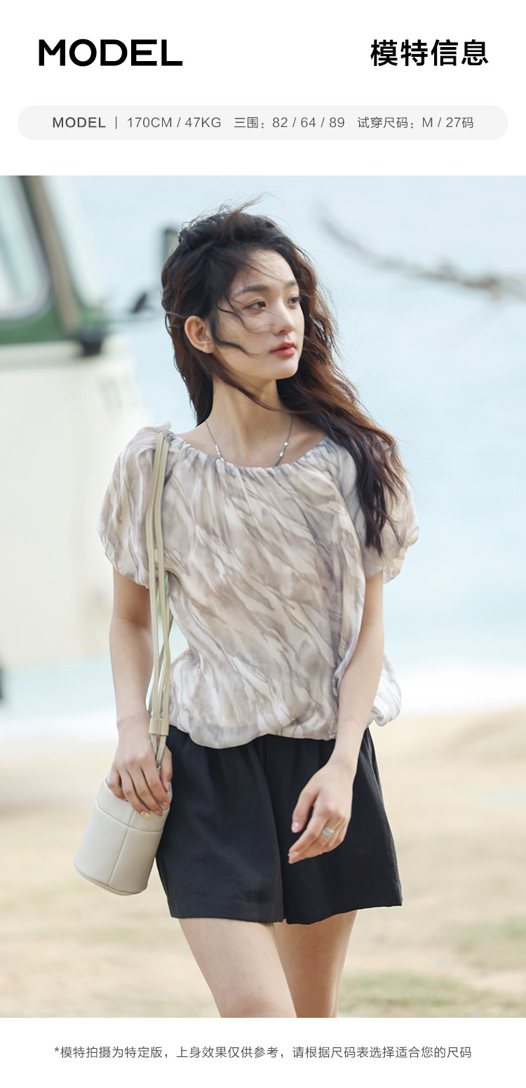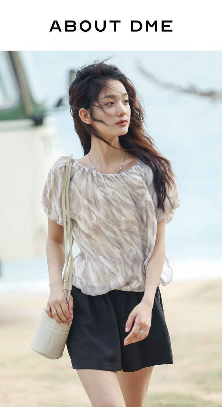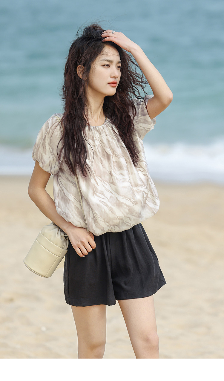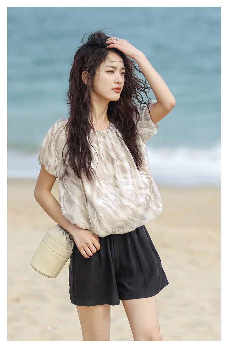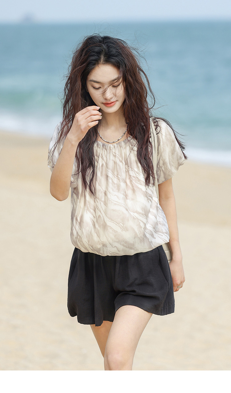 【通勤风套头衫】夏松紧领口艺术晕染印花宽松显瘦衬衫女 560258