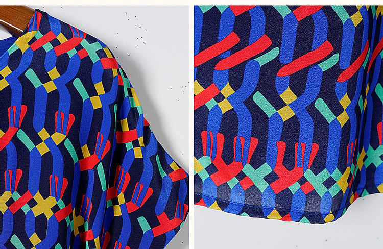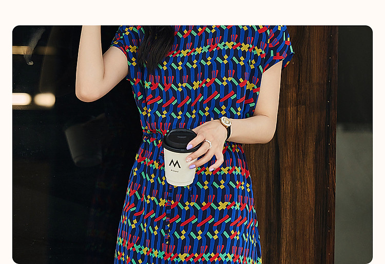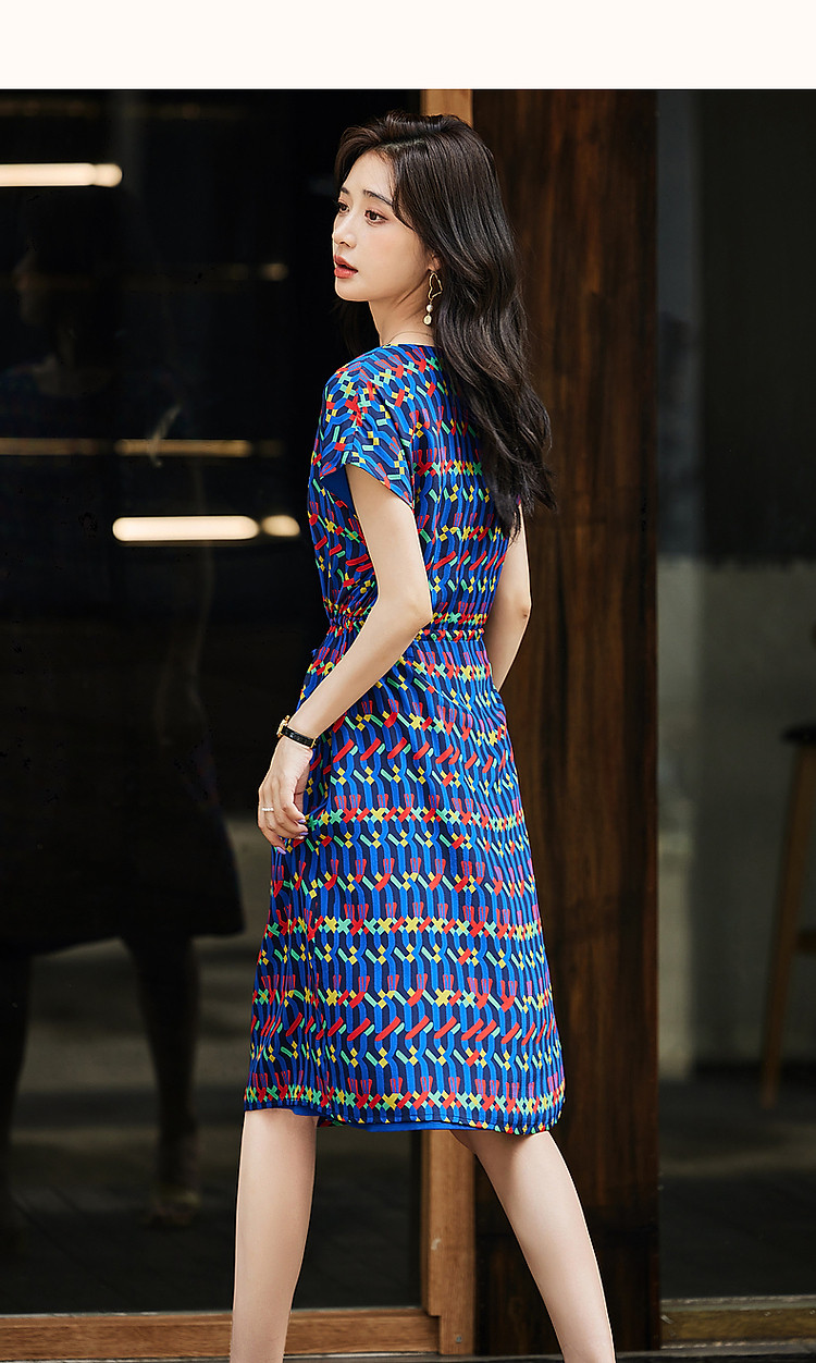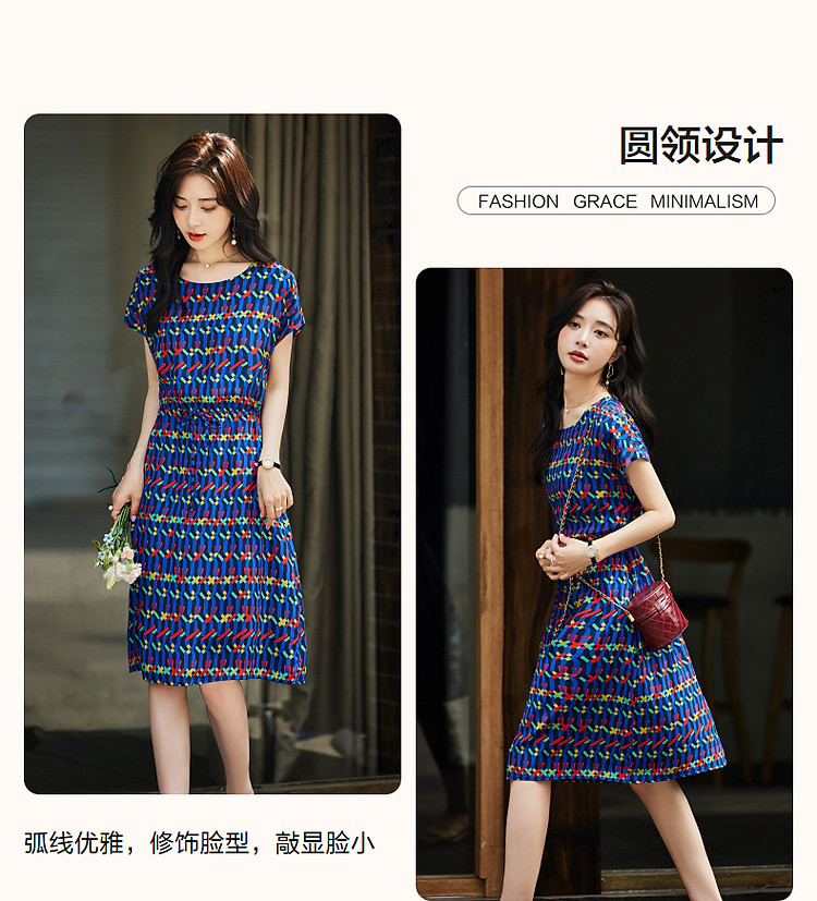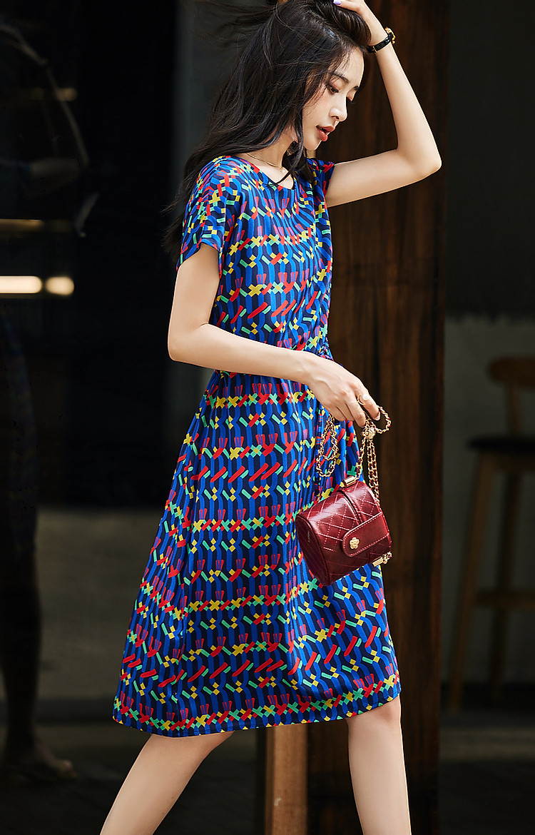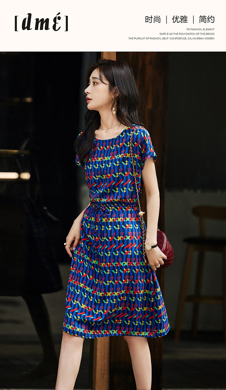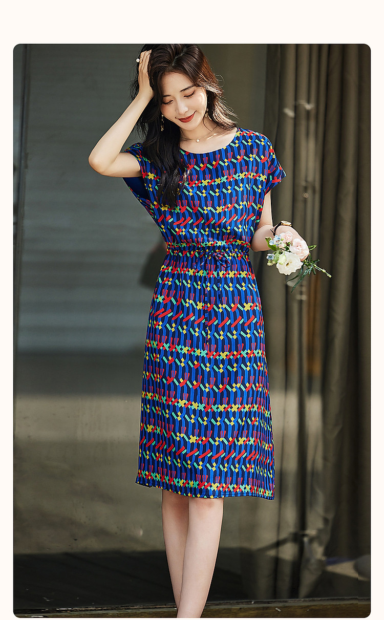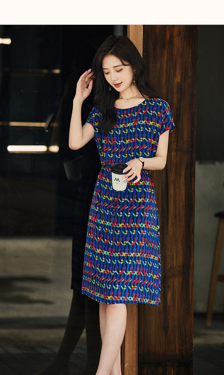 商品名称:【轻奢复古休闲】夏圆领桑蚕丝直筒几何印花连衣裙女中长 000641