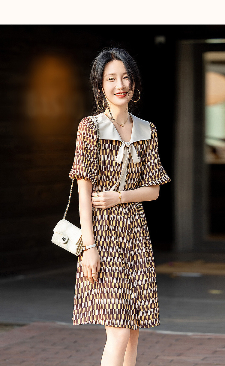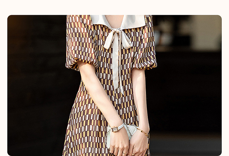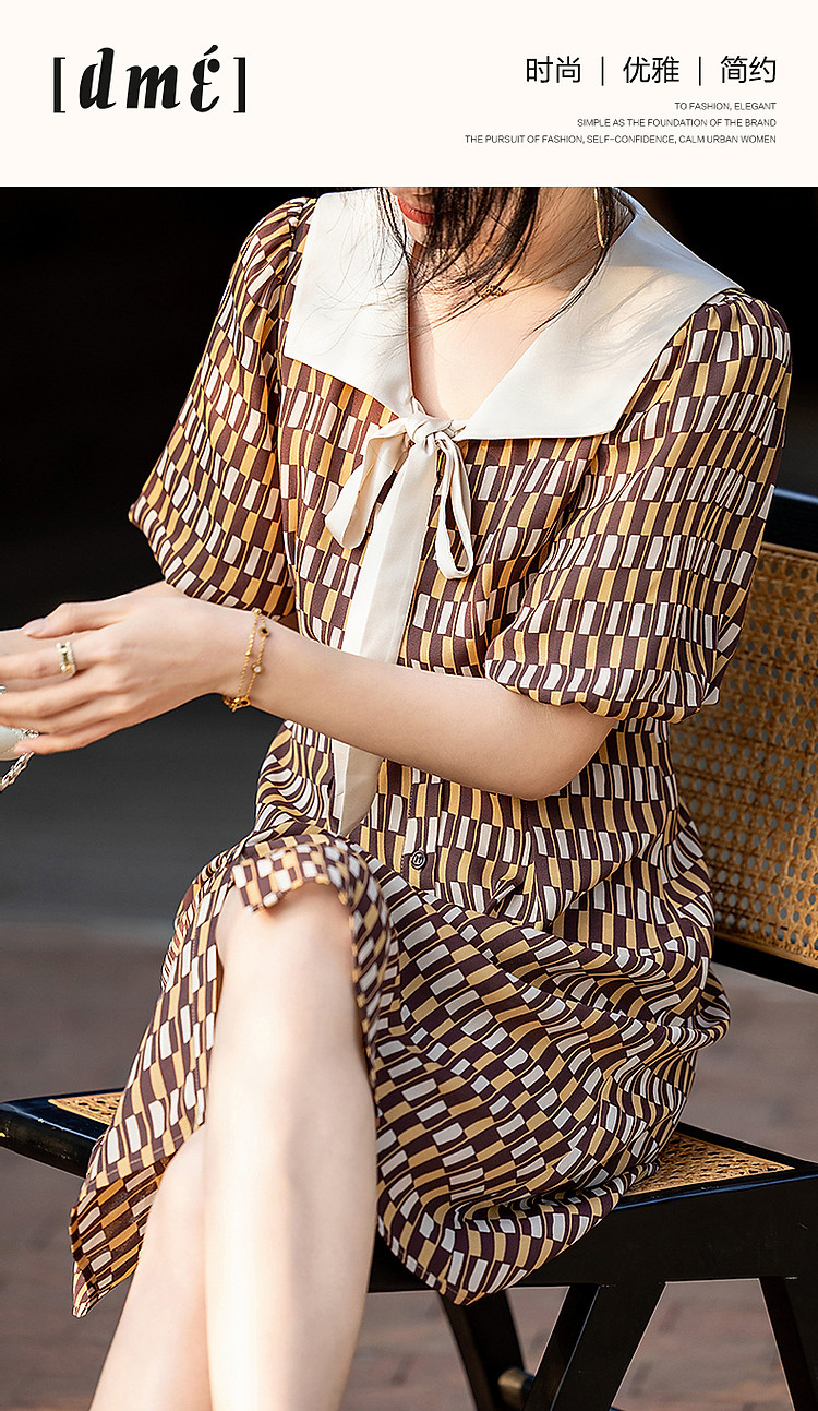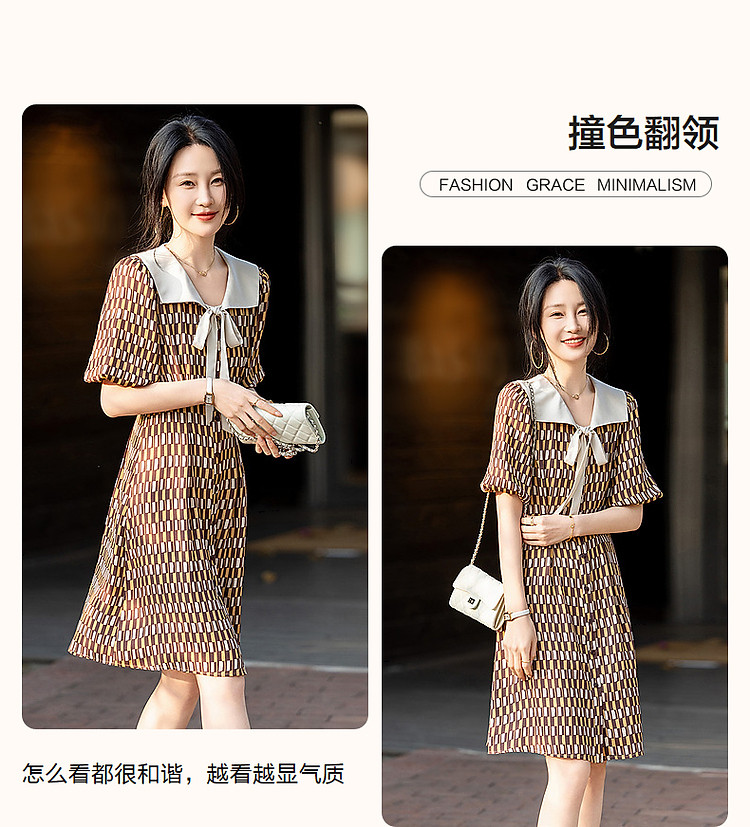 商品名称:【法式轻优雅】夏唯美印花雪纺撞色翻领短袖收腰连衣裙女中款 687873