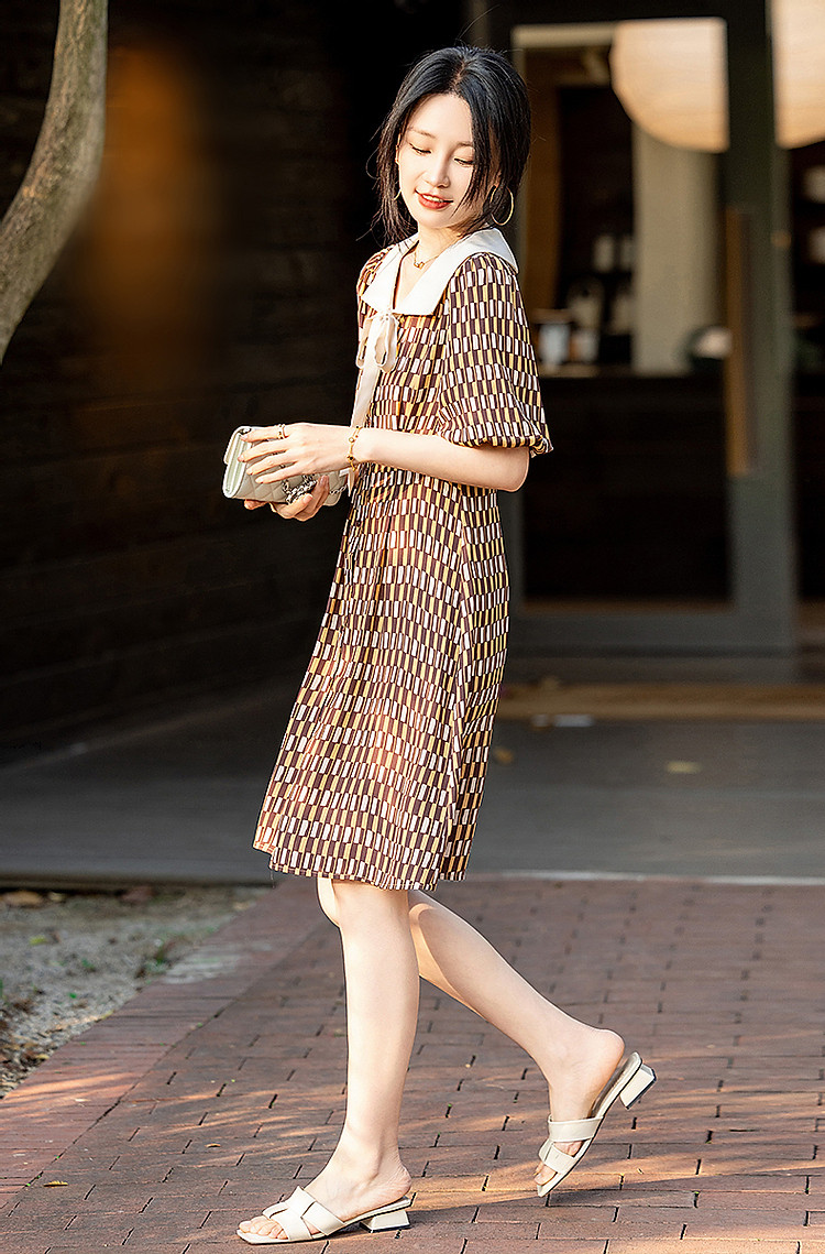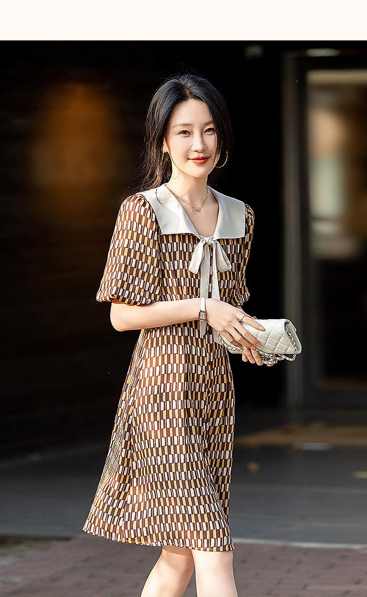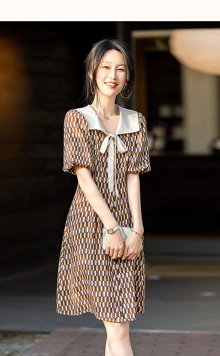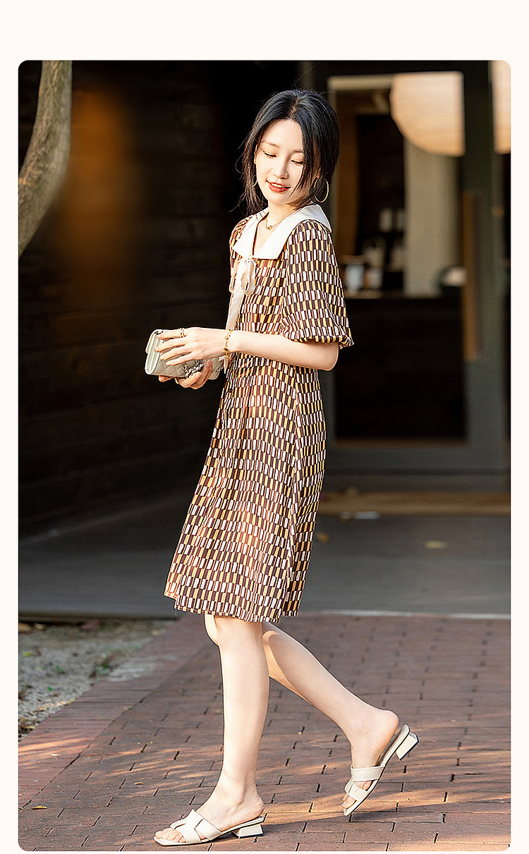 商品名称:【法式轻优雅】夏唯美印花雪纺撞色翻领短袖收腰连衣裙女中款 687873