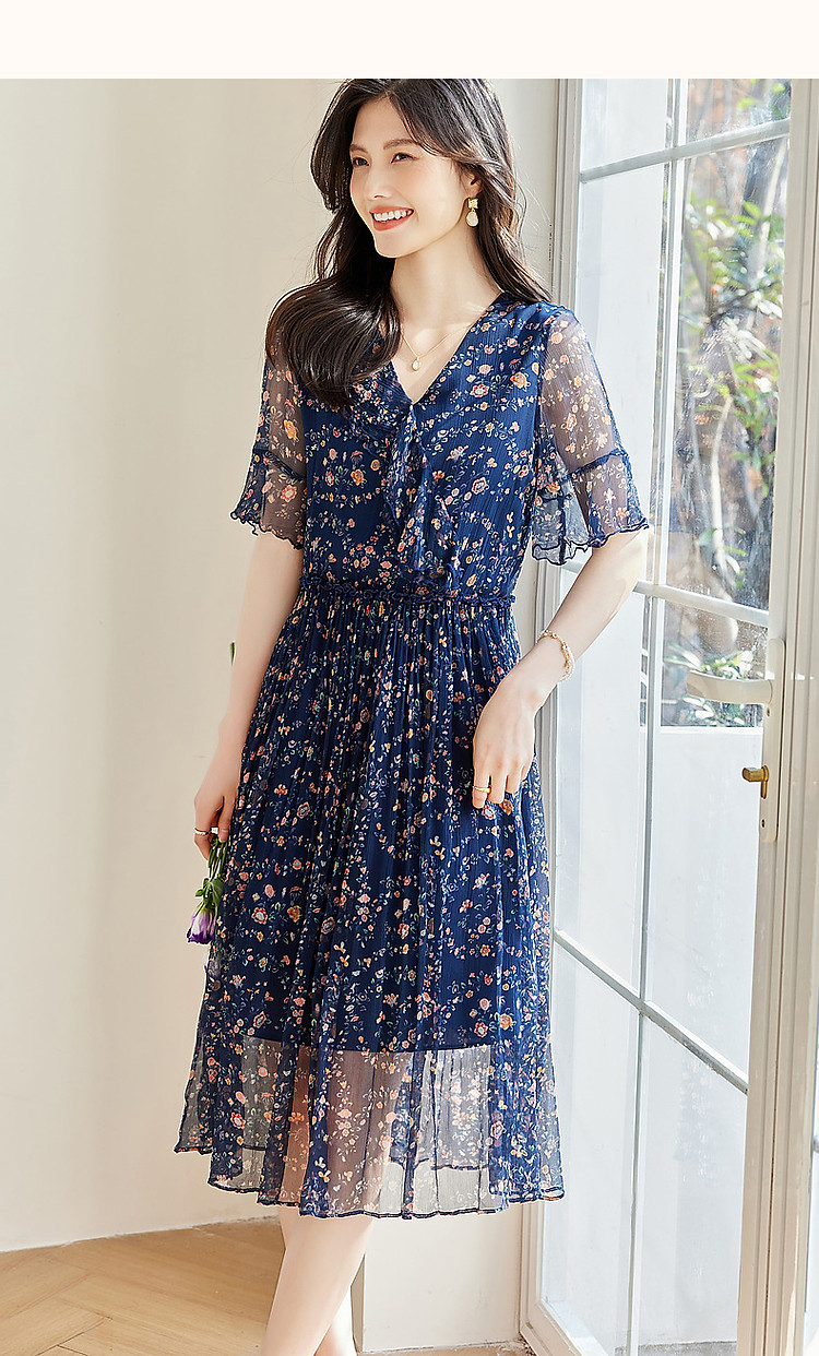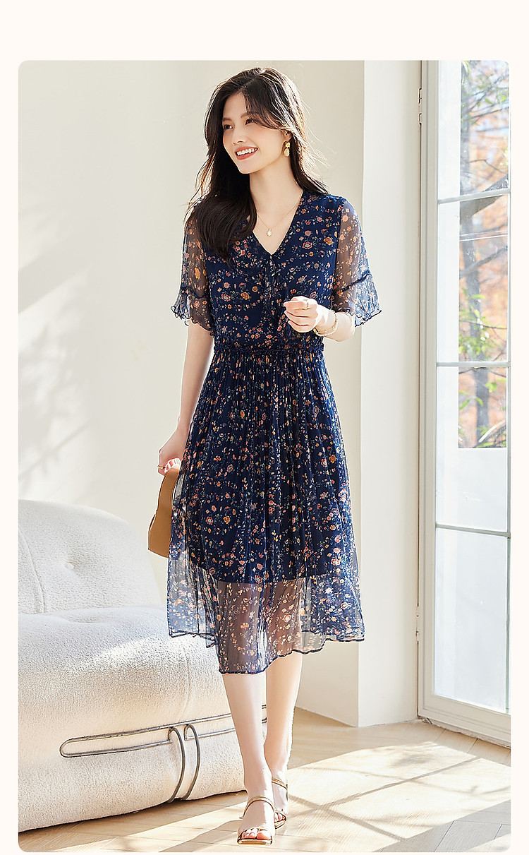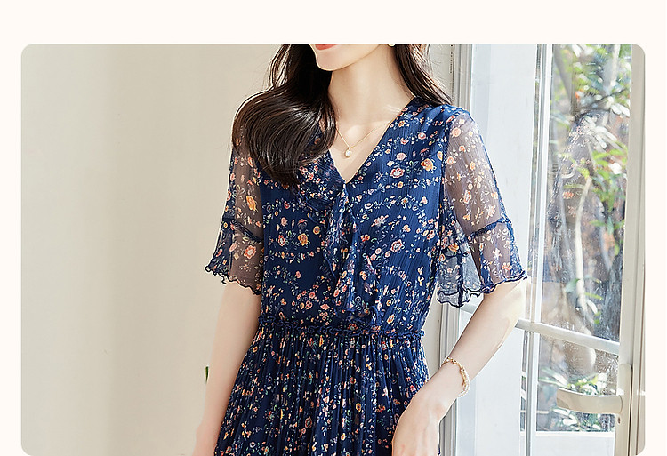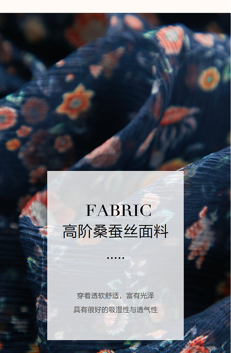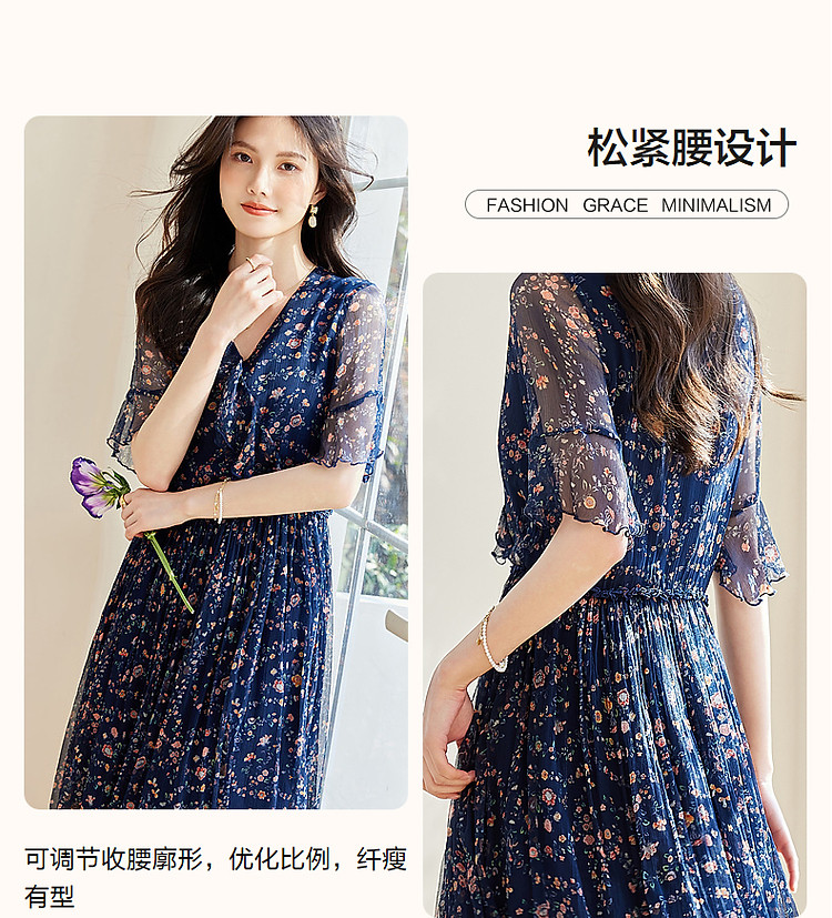 商品名称:【真丝俱乐部】春呼吸感桑蚕丝荷叶袖碎花松紧腰连衣裙女 571201