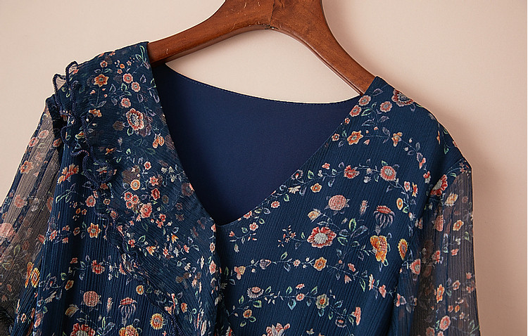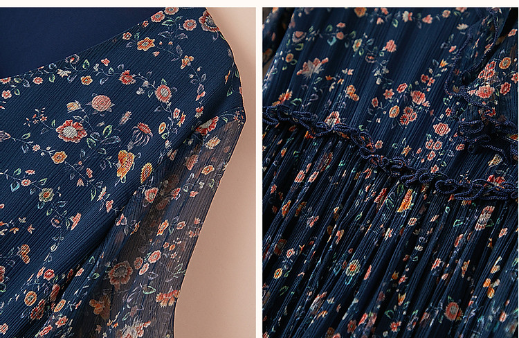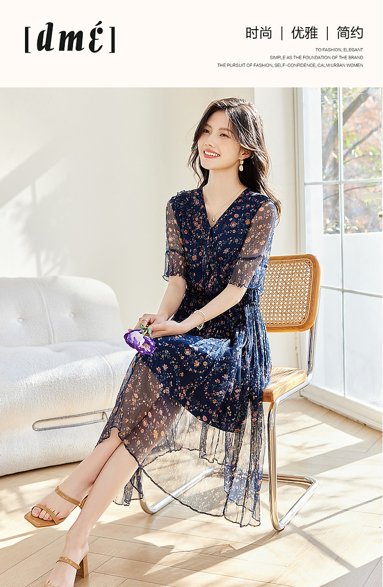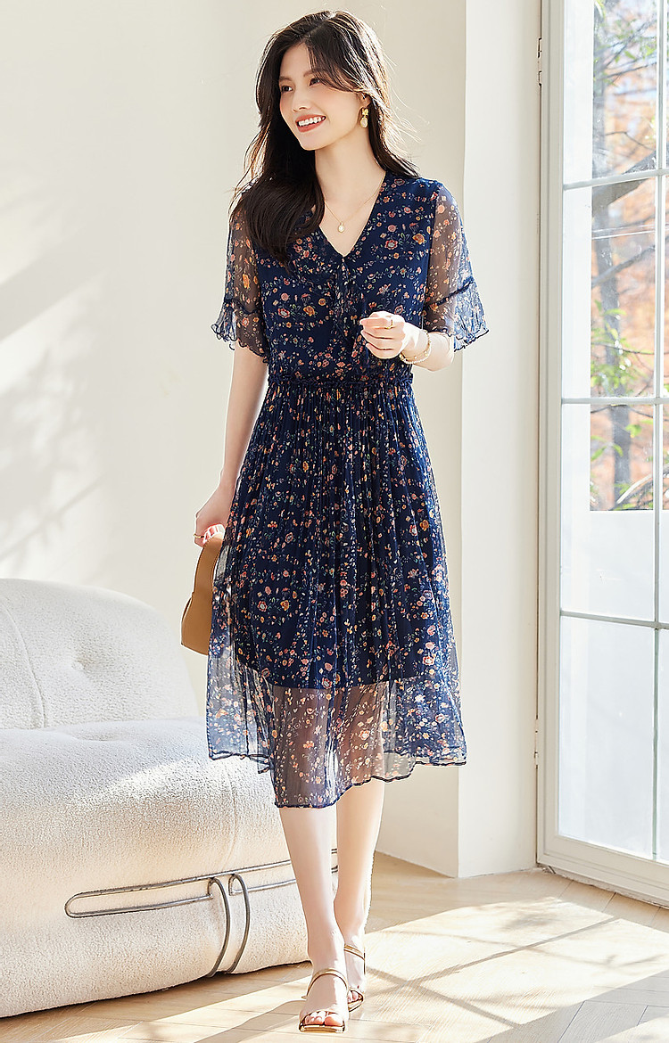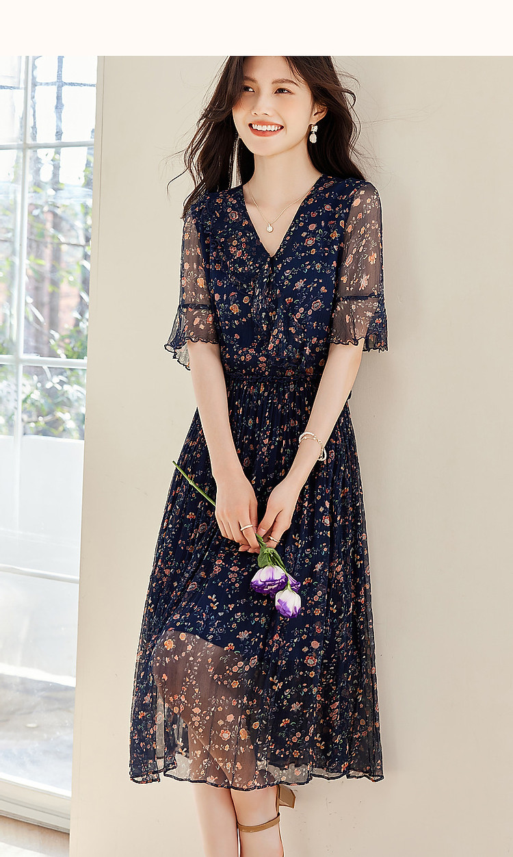 商品名称:【真丝俱乐部】春呼吸感桑蚕丝荷叶袖碎花松紧腰连衣裙女 571201