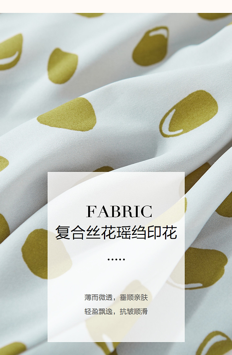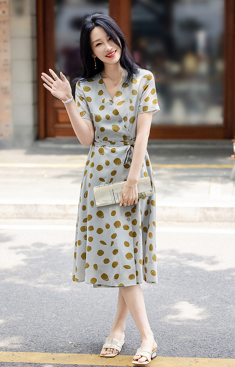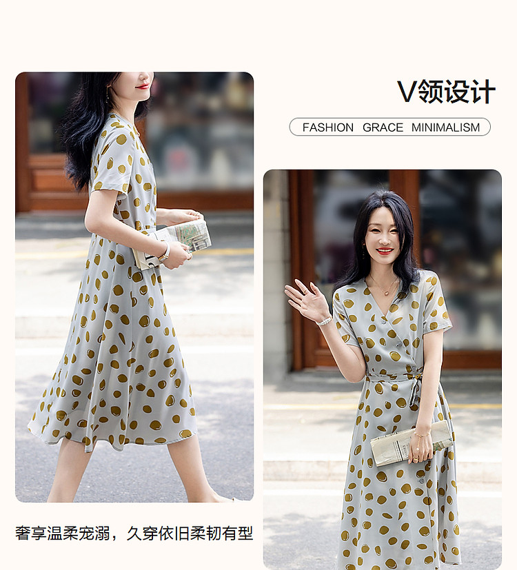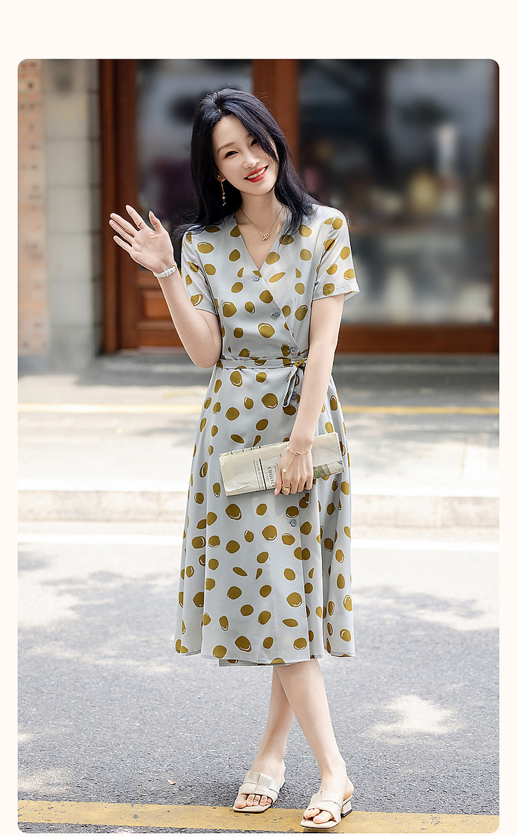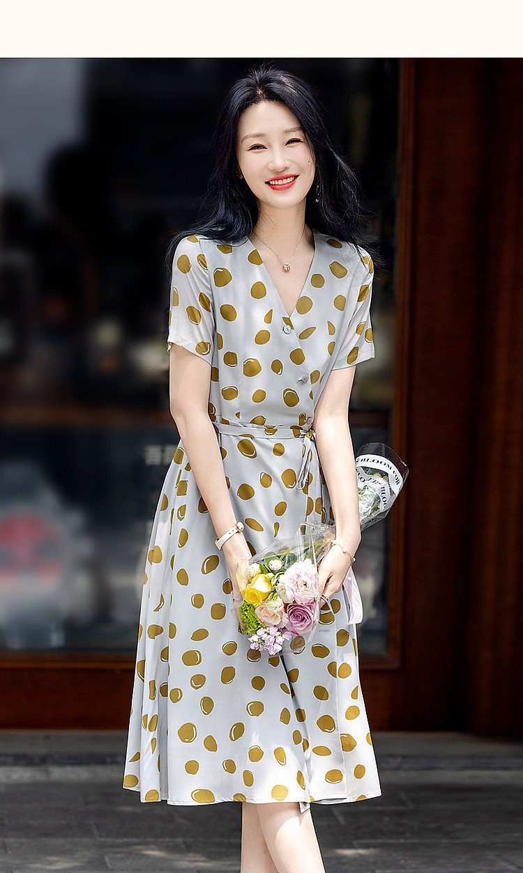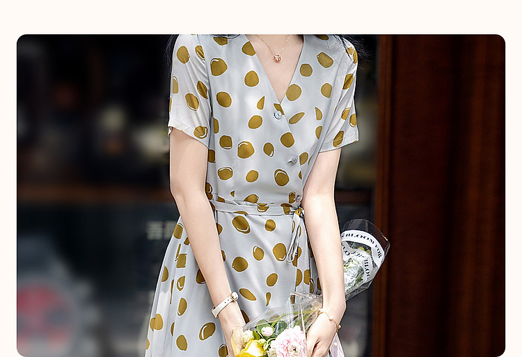 【围裹式收腰茶歇裙】夏V领复合丝花瑶绉印花大摆纽扣装饰连衣裙 808897