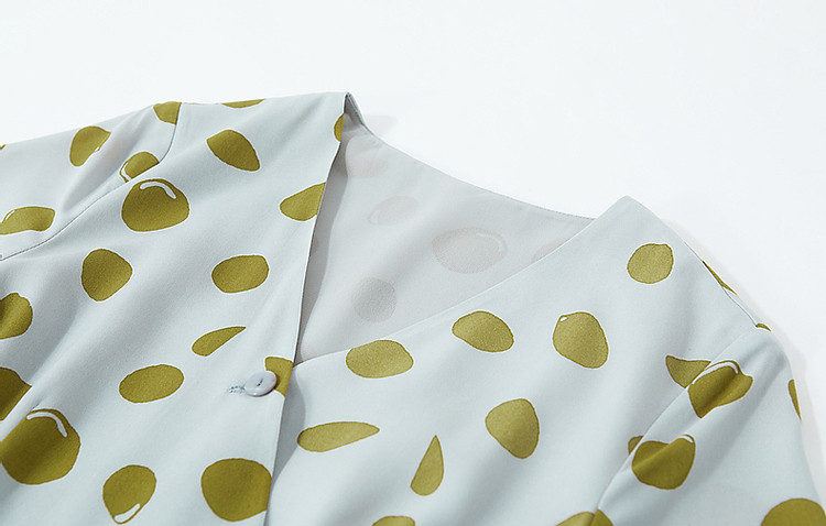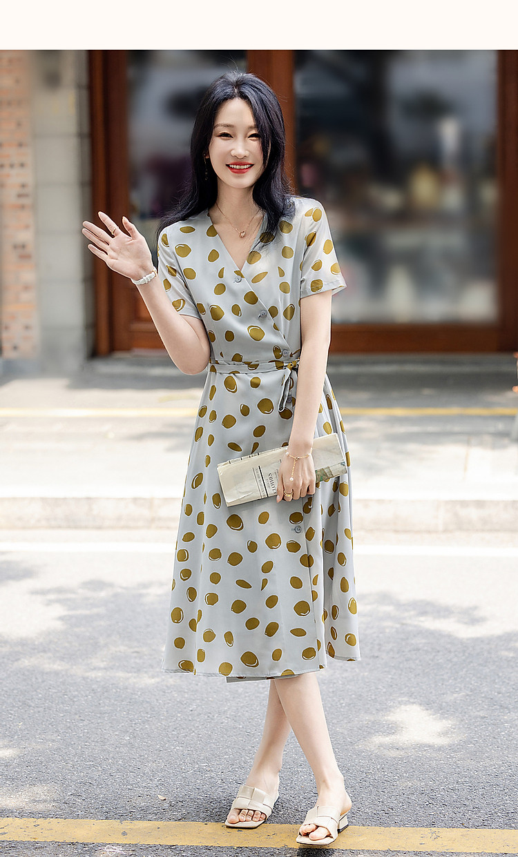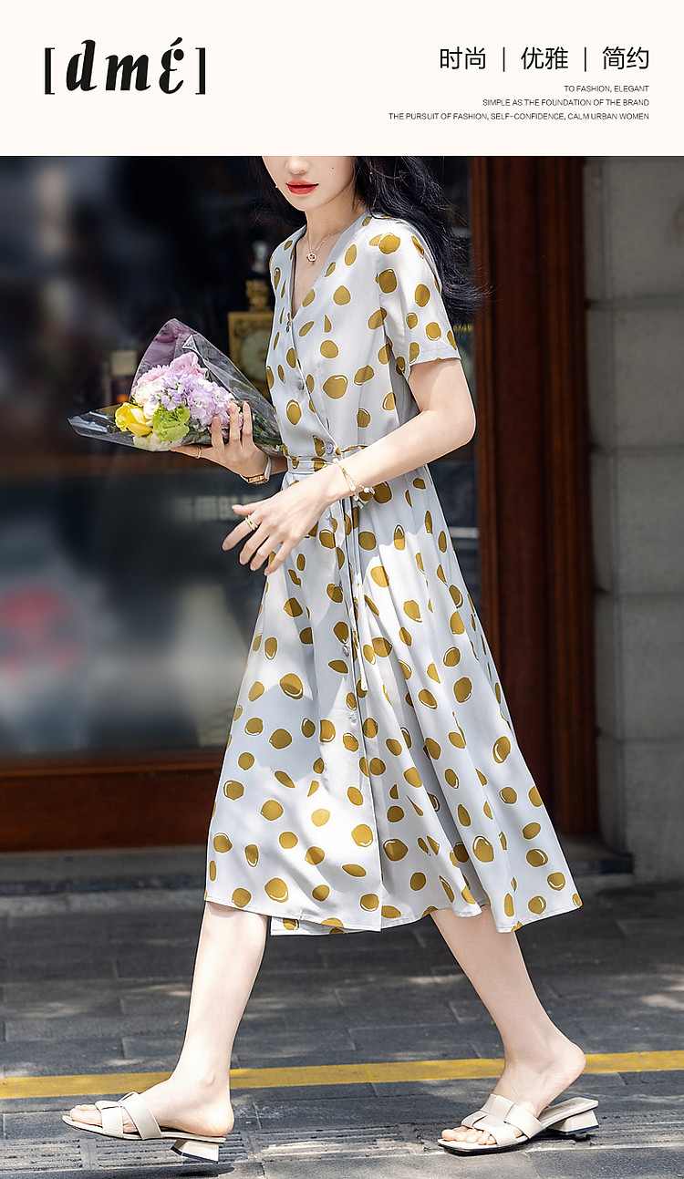 商品名称:【围裹式收腰茶歇裙】夏V领复合丝花瑶绉印花大摆纽扣装饰连衣裙 808897
