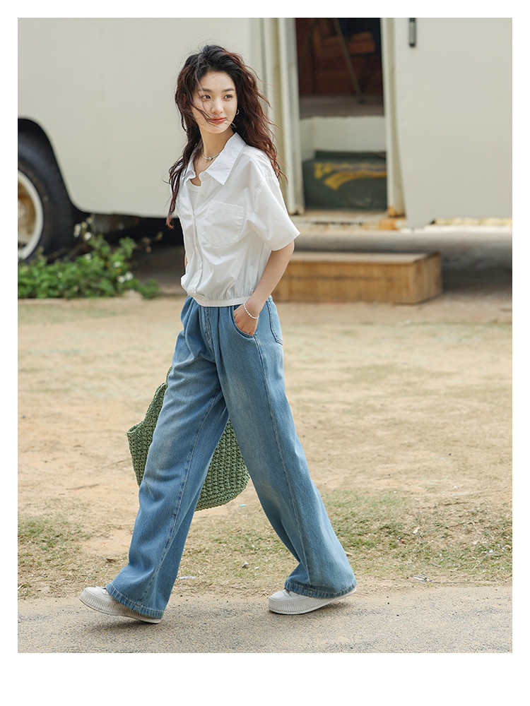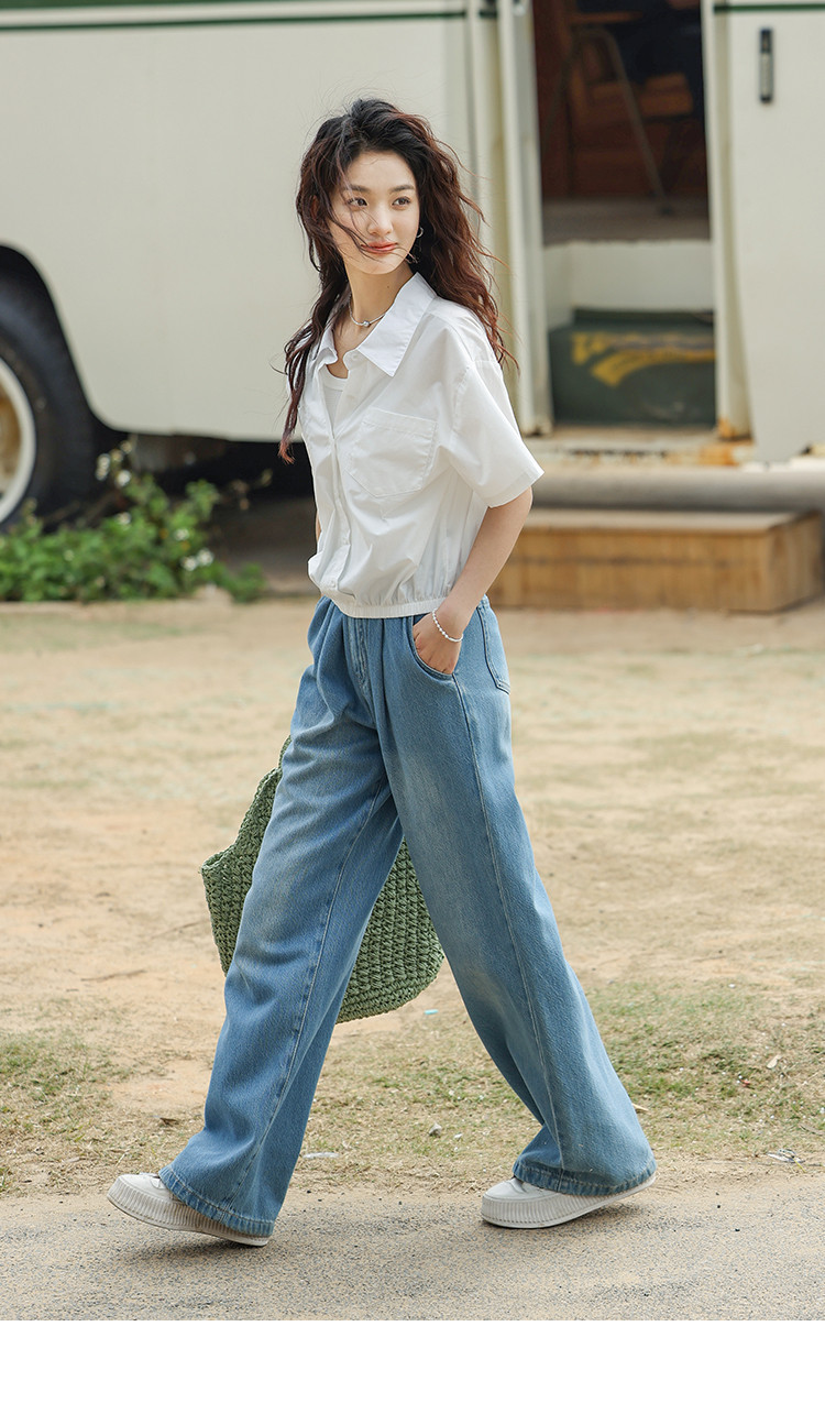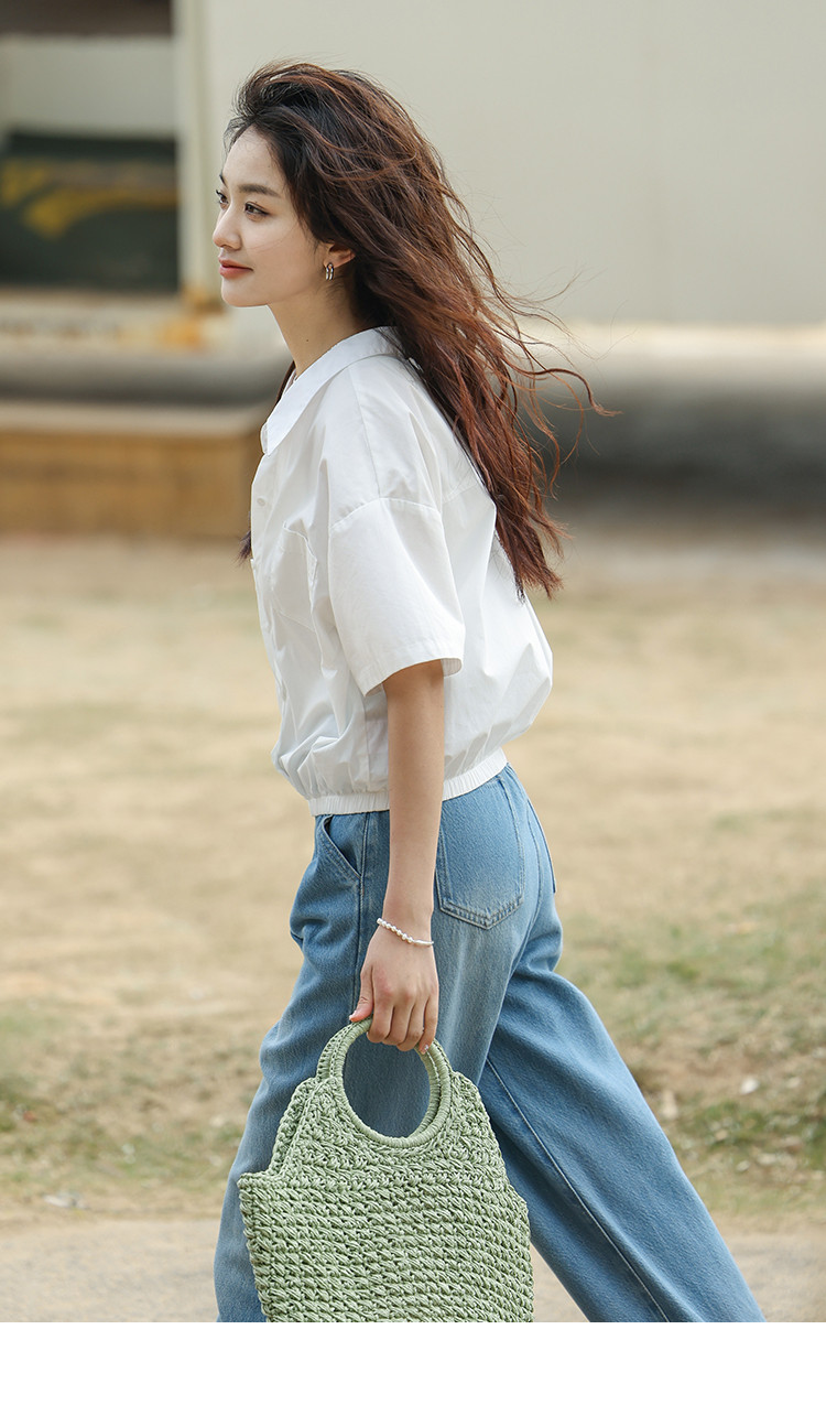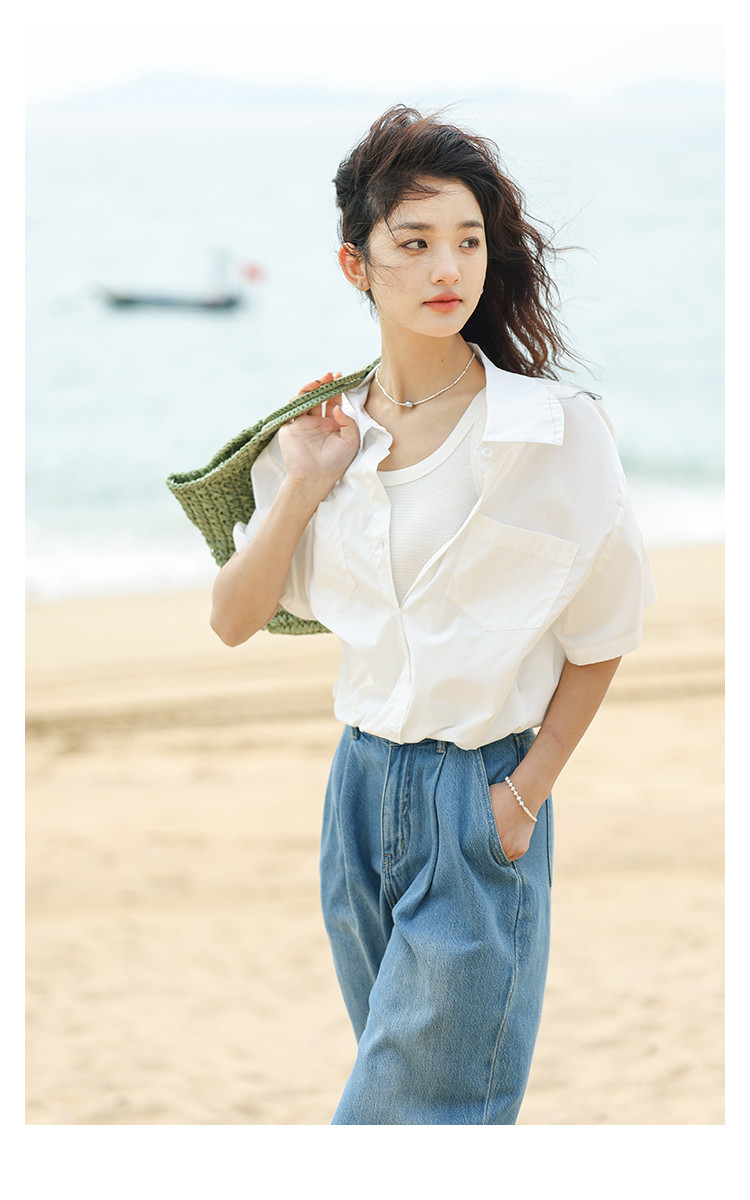 商品名称:【翻领短袖衬衫】夏款舒适简约风落肩袖百搭短款衬衫女 879746