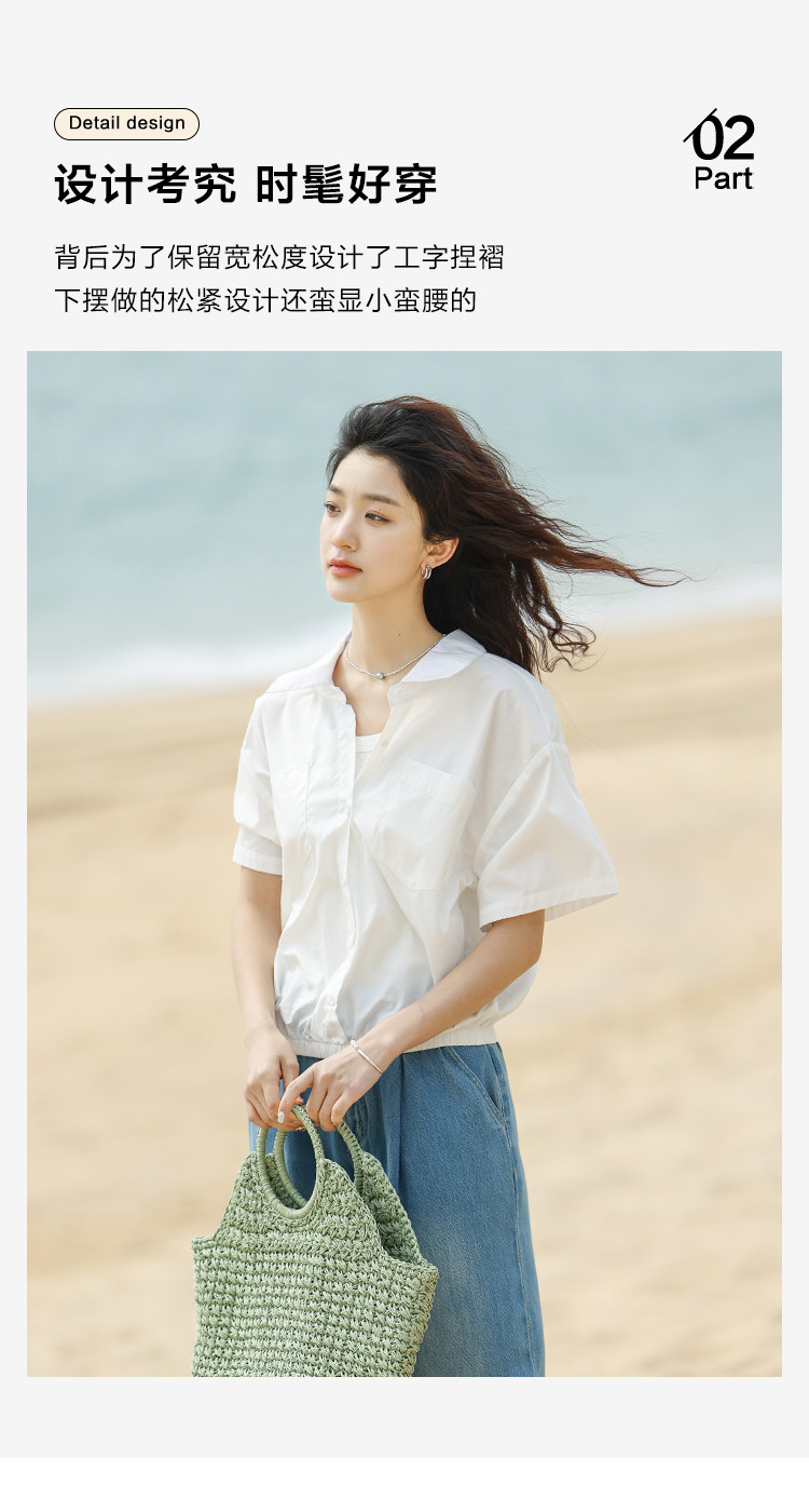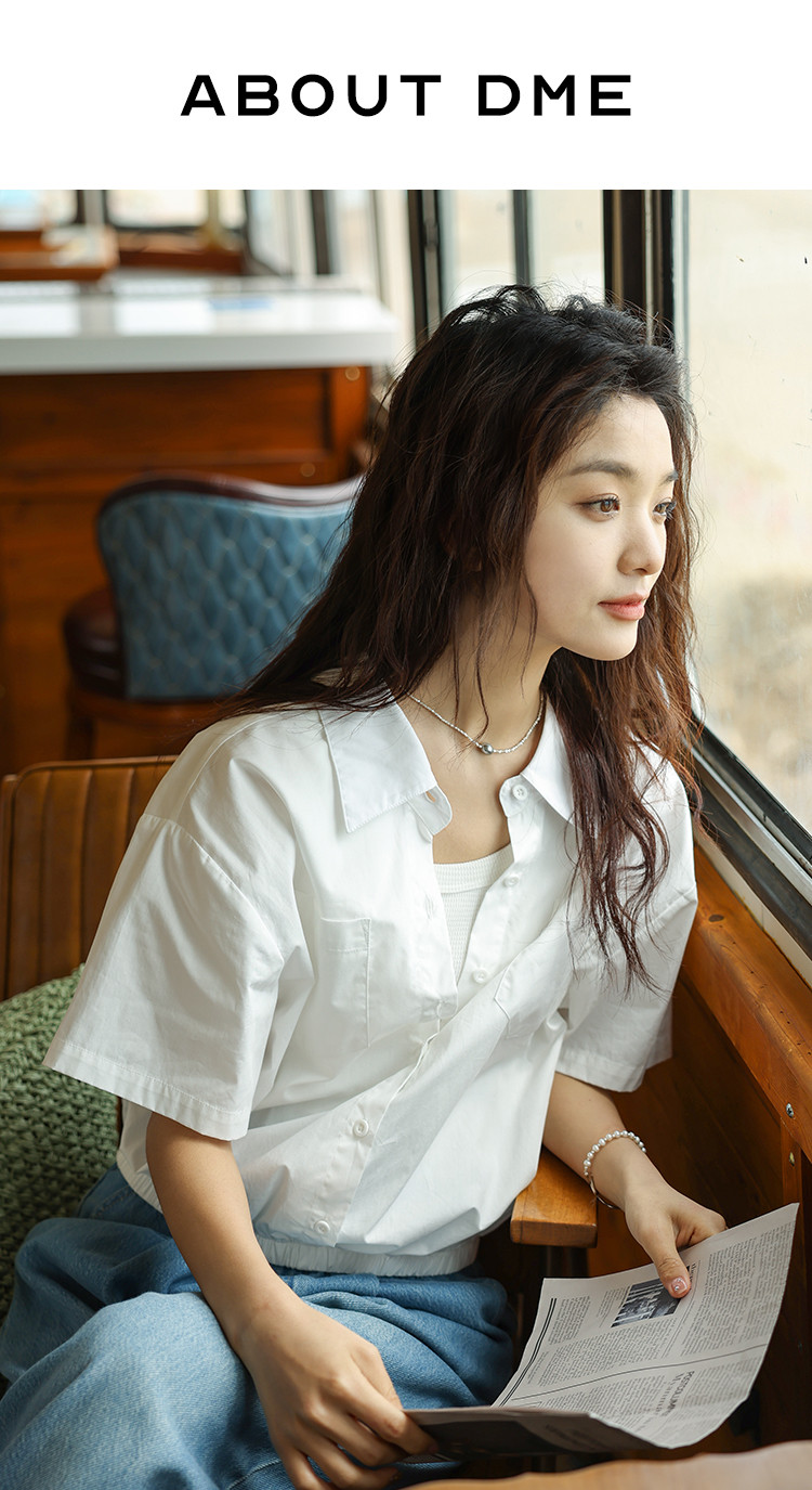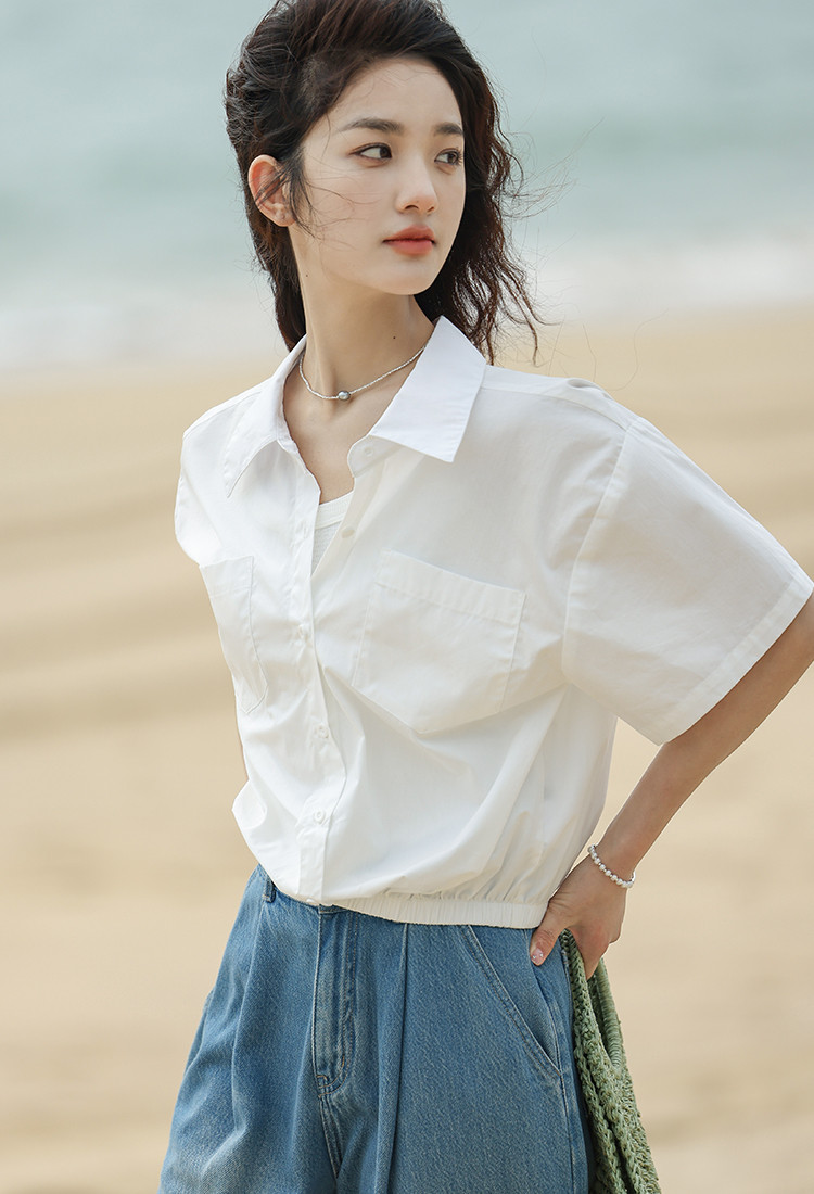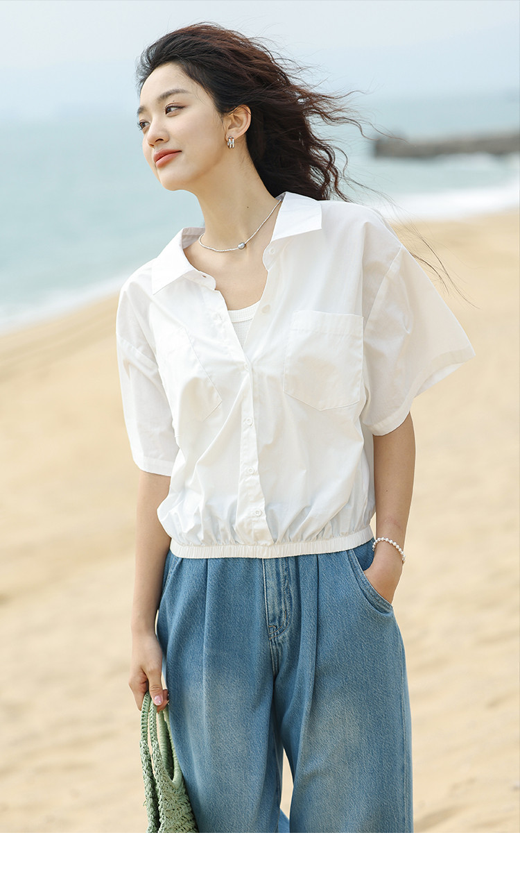【翻领短袖衬衫】夏款舒适简约风落肩袖百搭短款衬衫女 879746