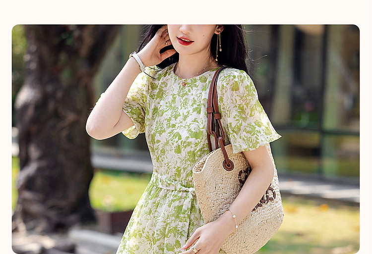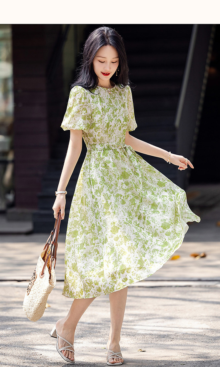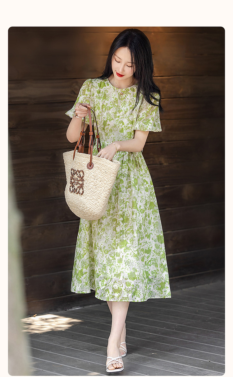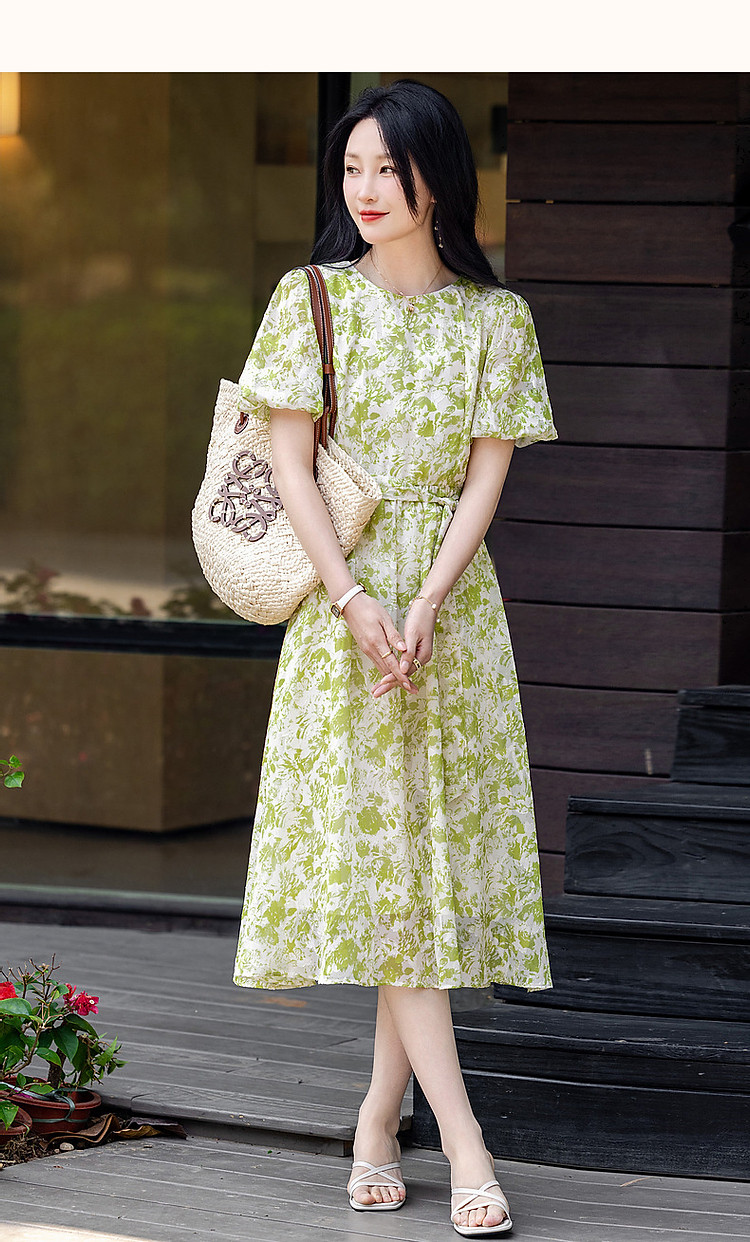 【薄荷曼波】夏法式烧花镂空工艺印花泡泡袖系带大摆藏肉连衣裙 200065