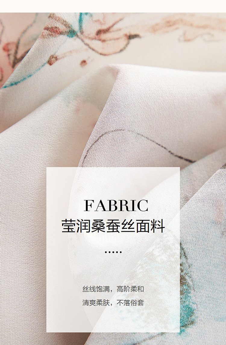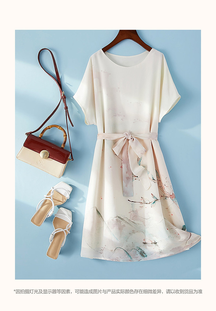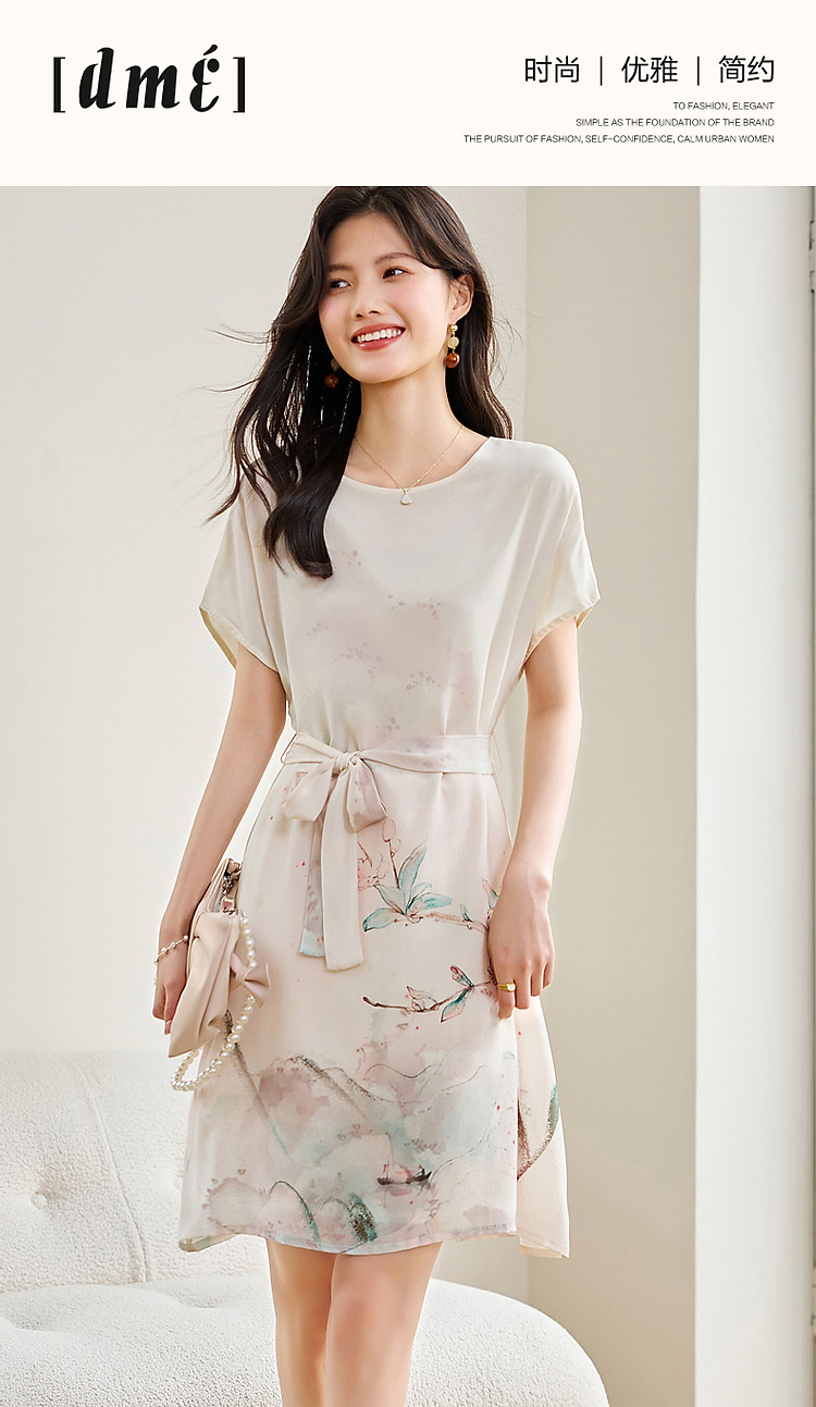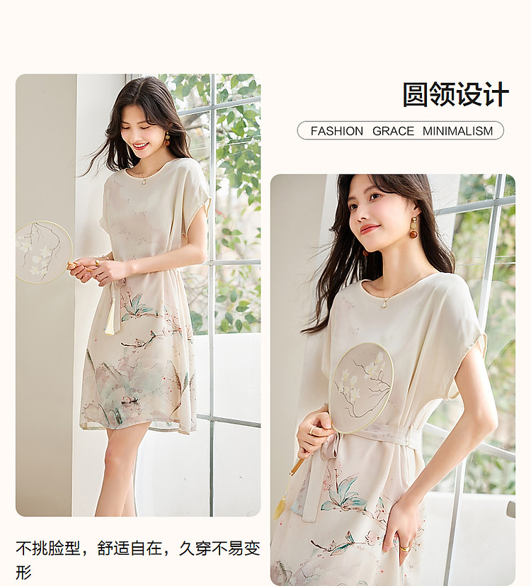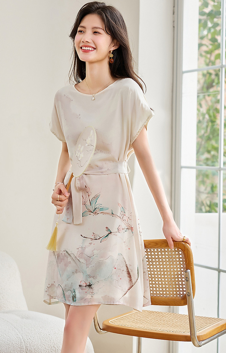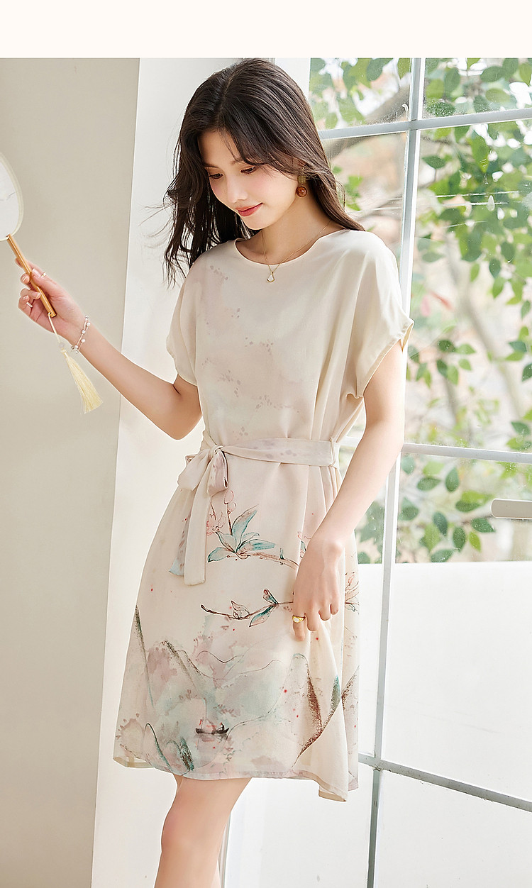 商品名称:【国风下江南】夏圆领桑蚕丝手绘印花调节腰连衣裙女中长 021121