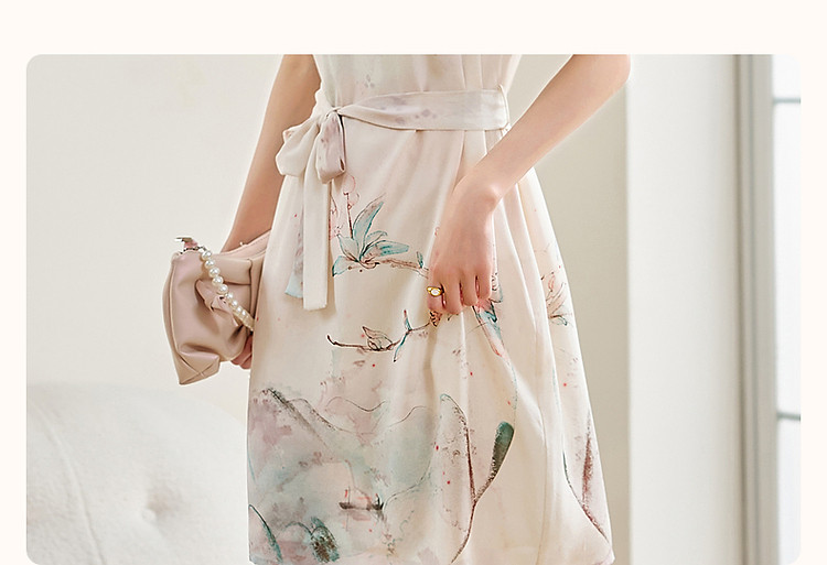 【国风下江南】夏圆领桑蚕丝手绘印花调节腰连衣裙女中长 021121