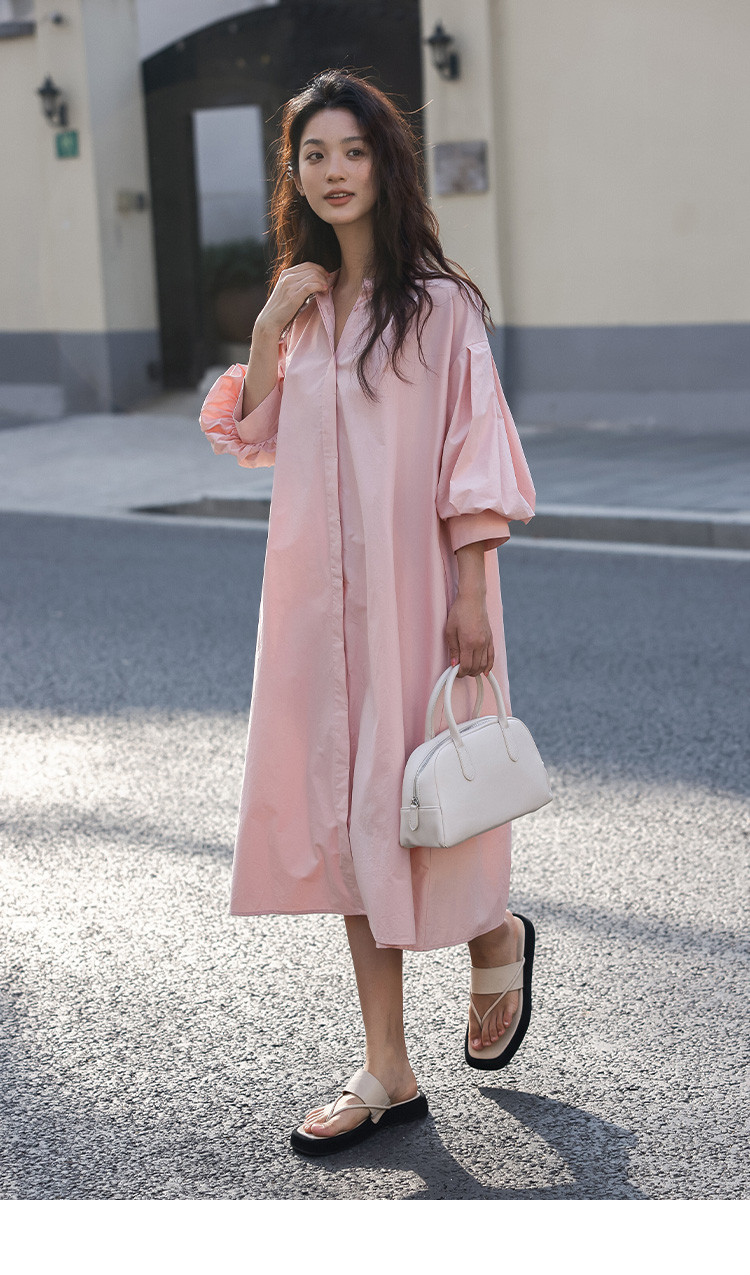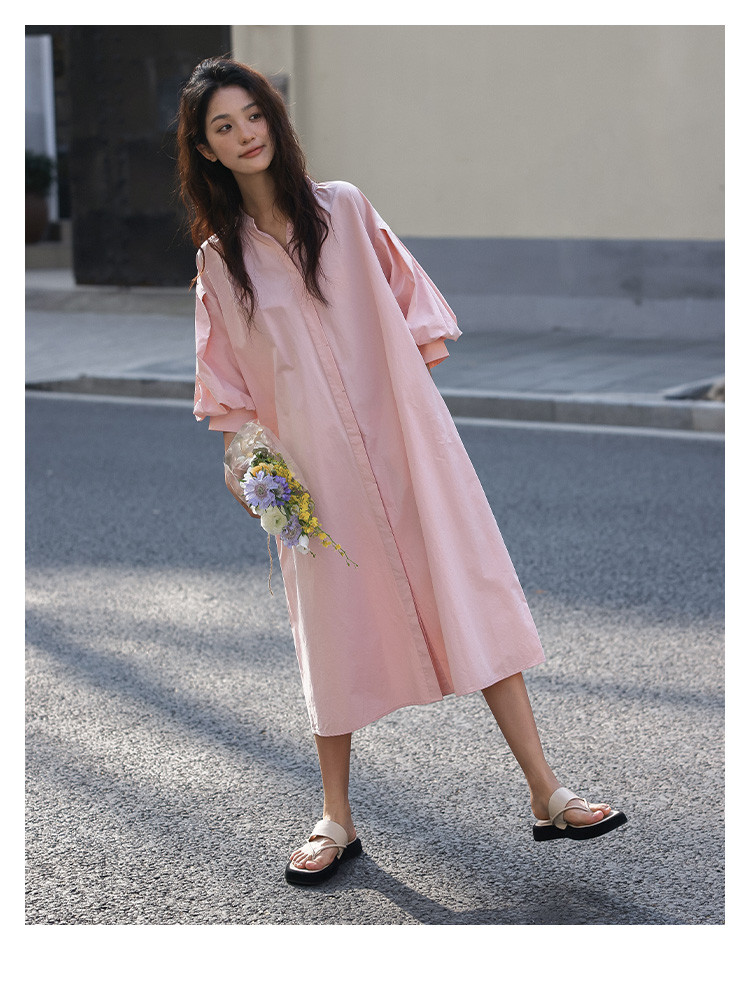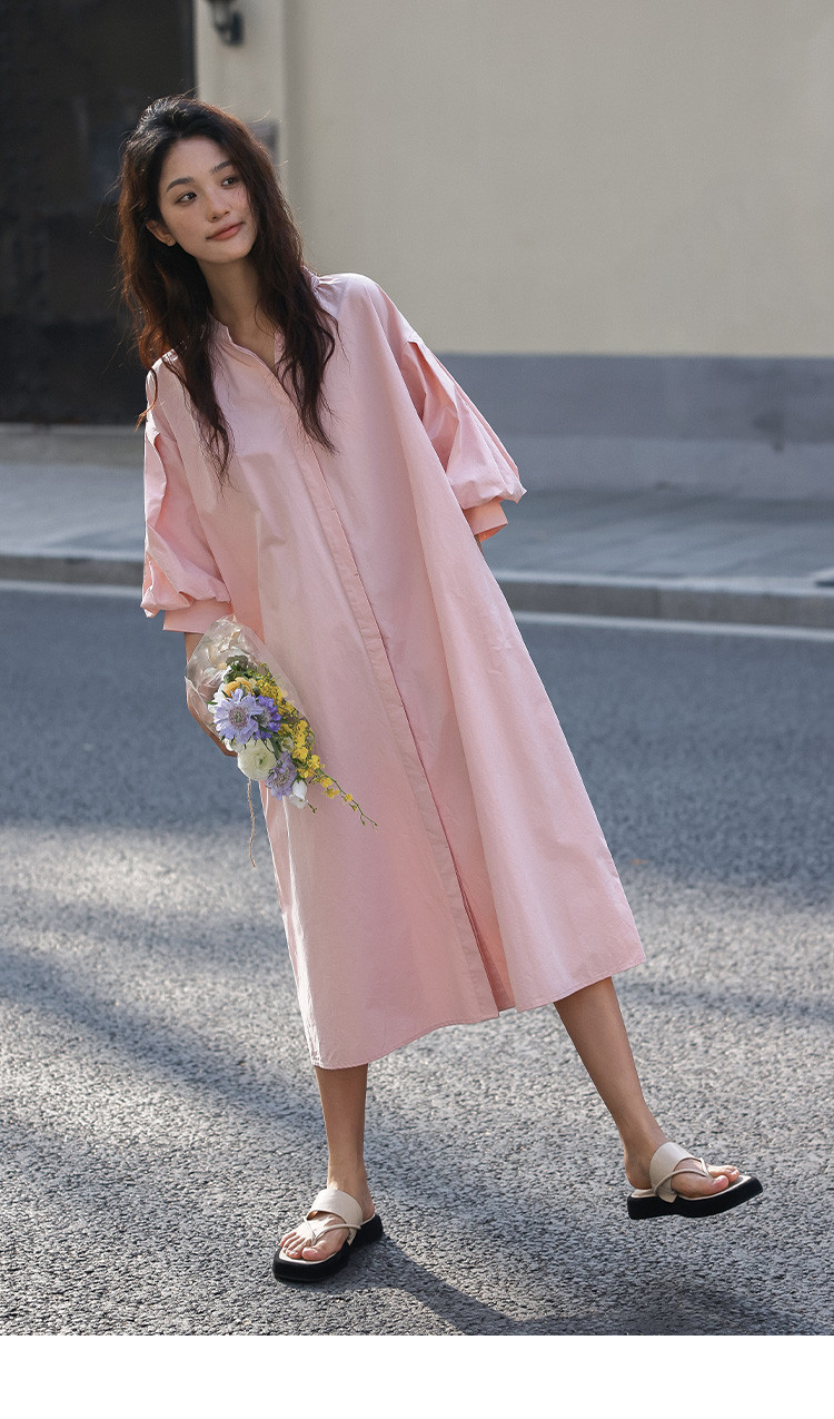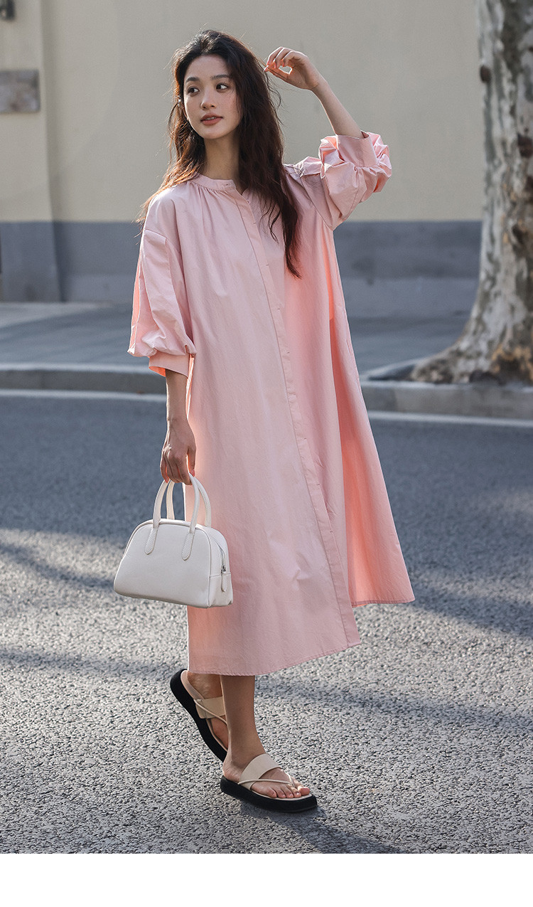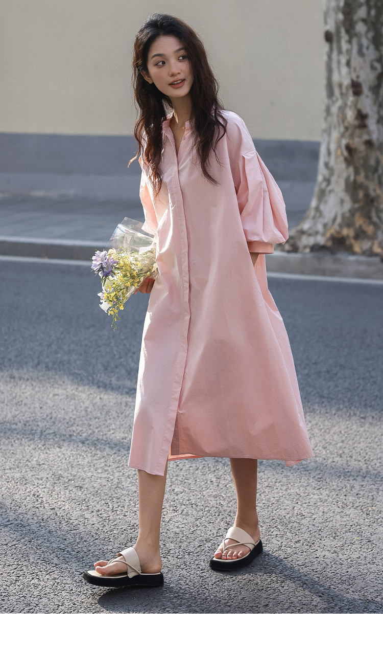 【嫩粉色中袖连衣裙】夏款粉嫩圆领泡泡袖长款连衣裙女 239490