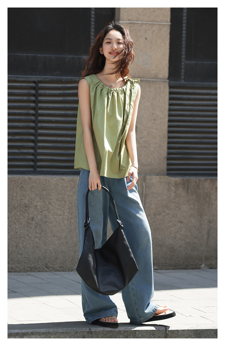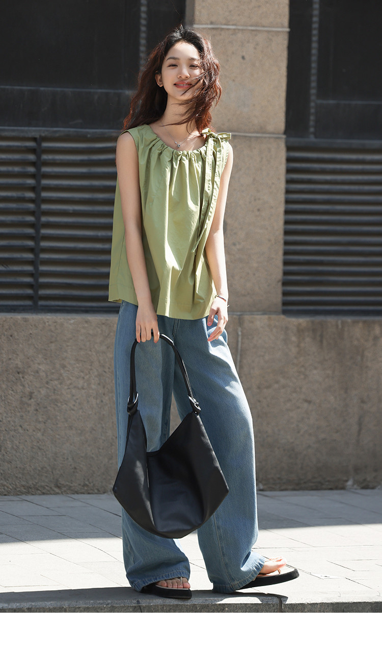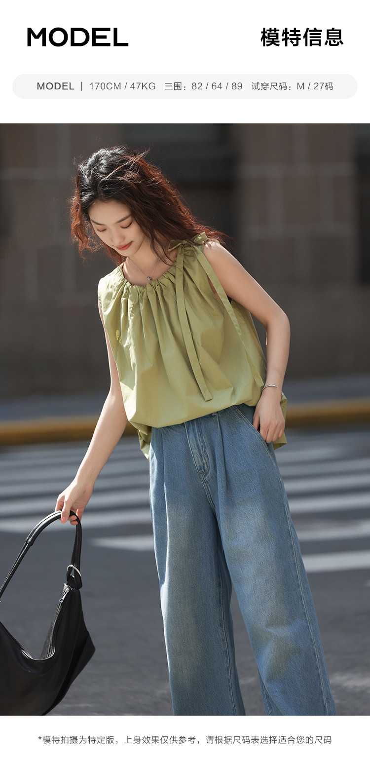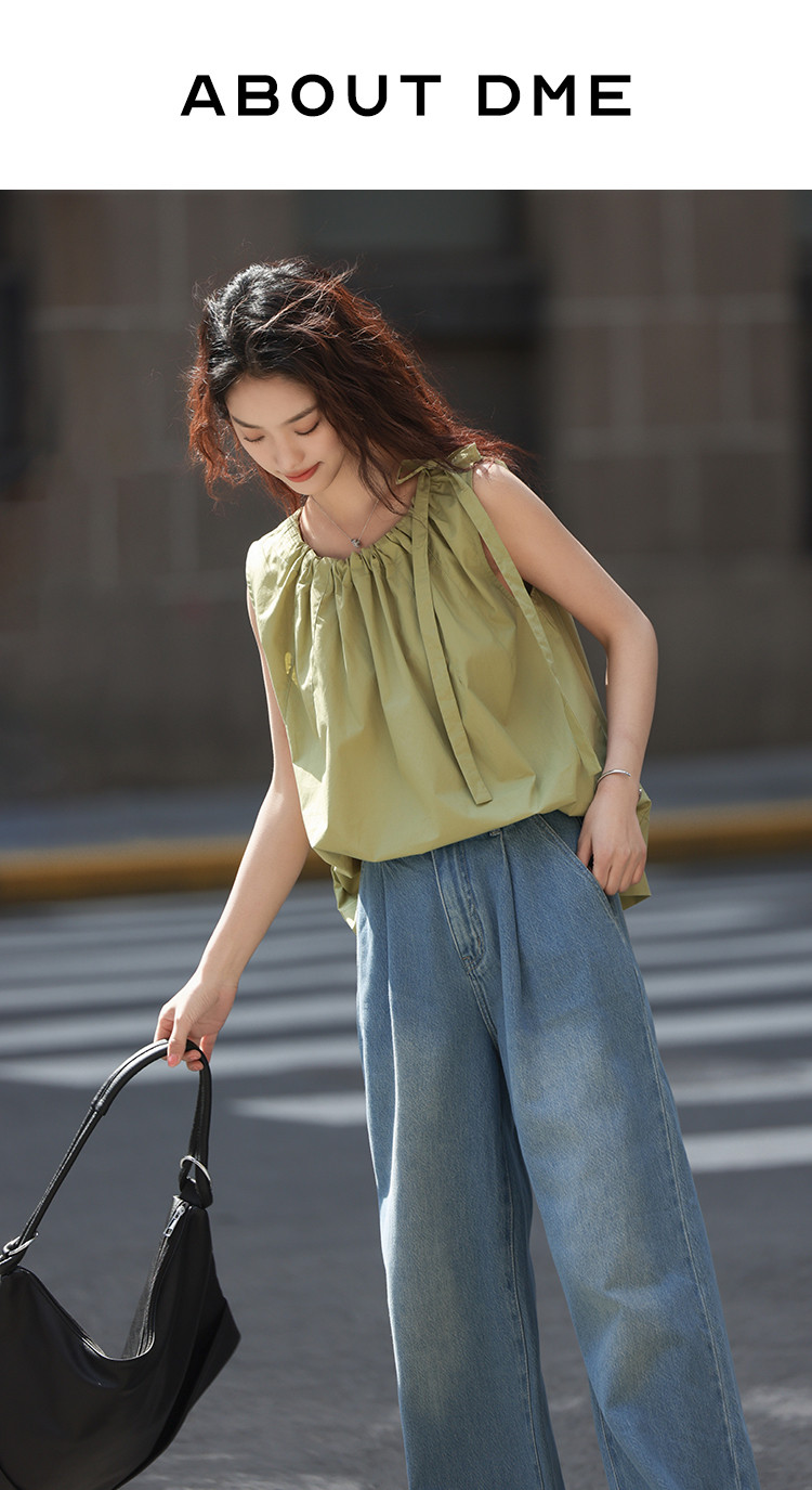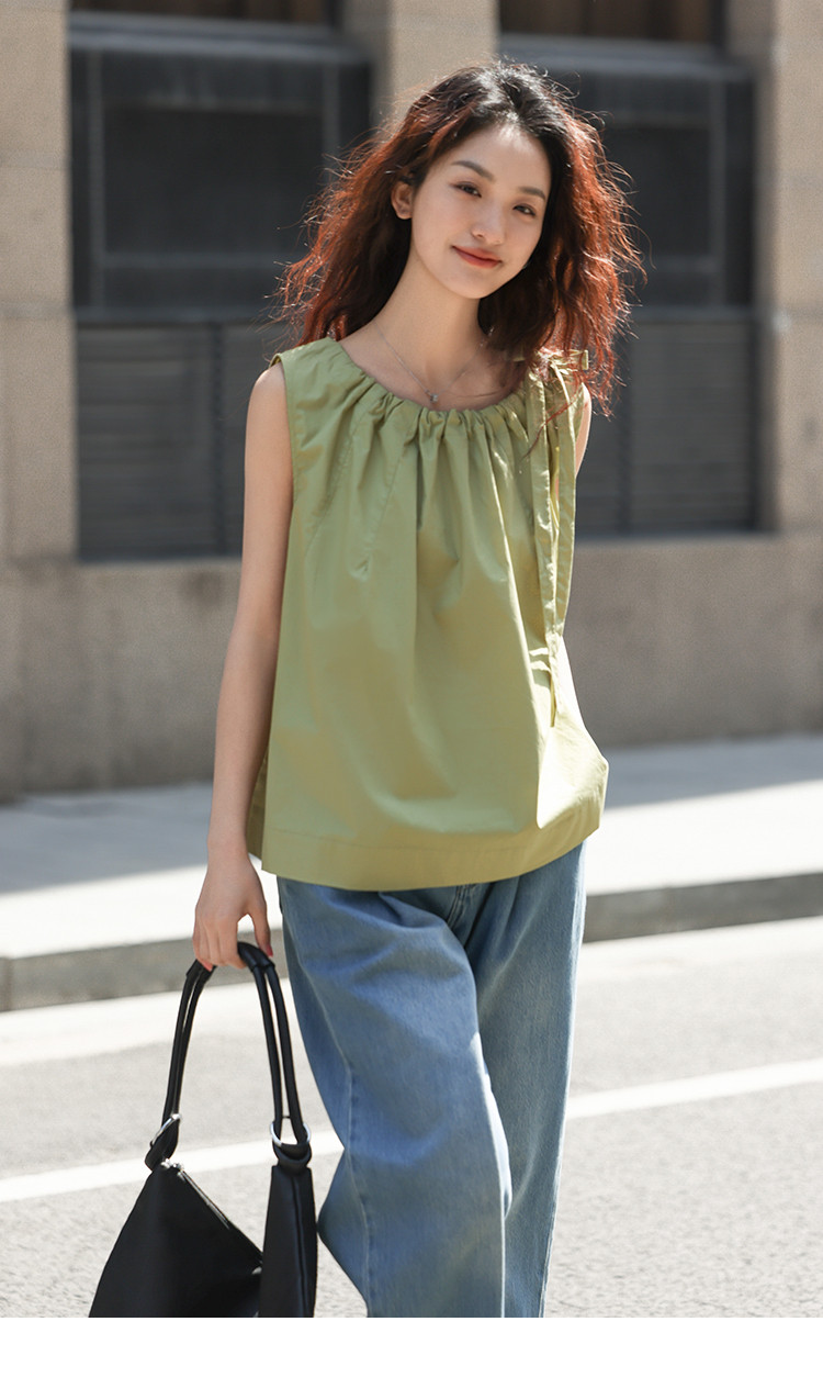 【曼波罗兰无袖衬衫】夏款清新淡绿圆领抽绳无袖小衫 649346