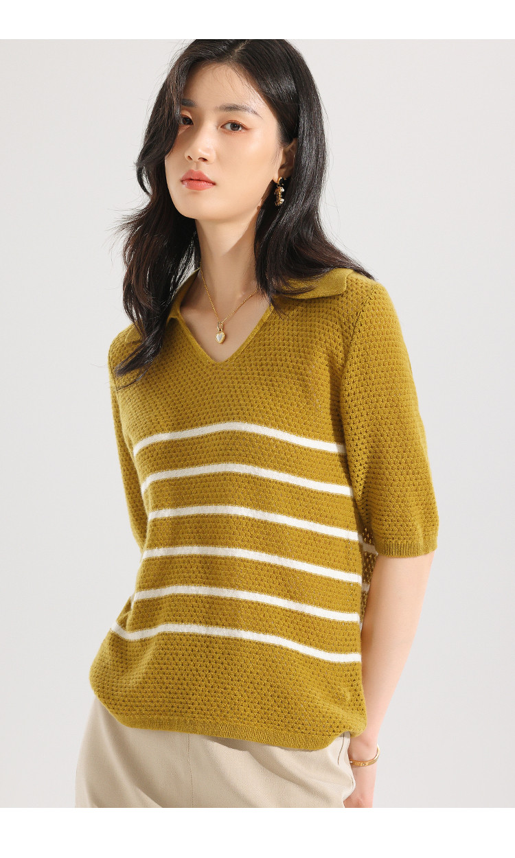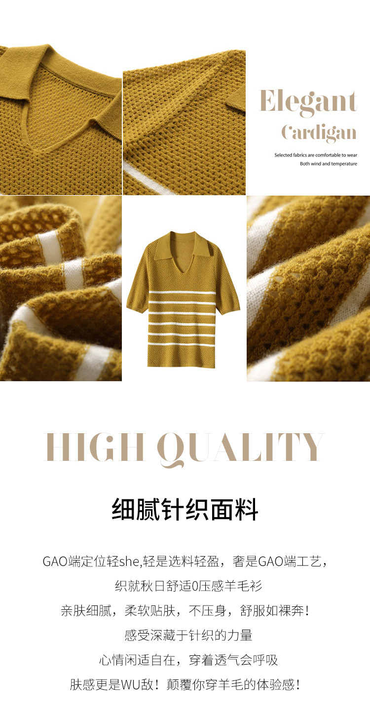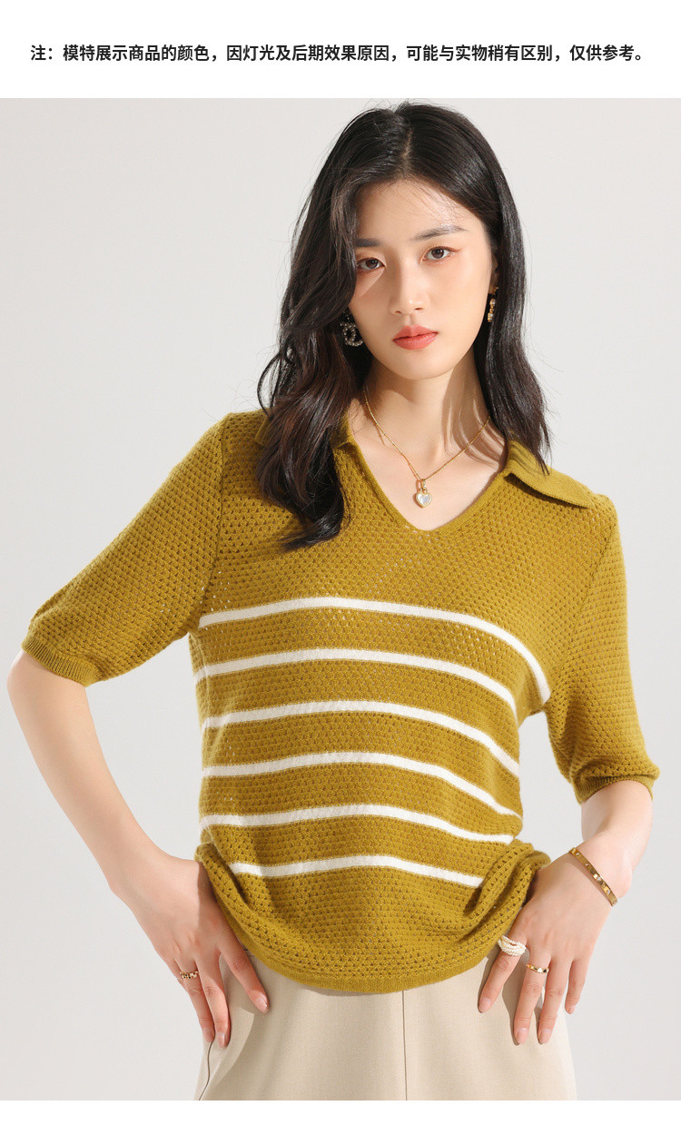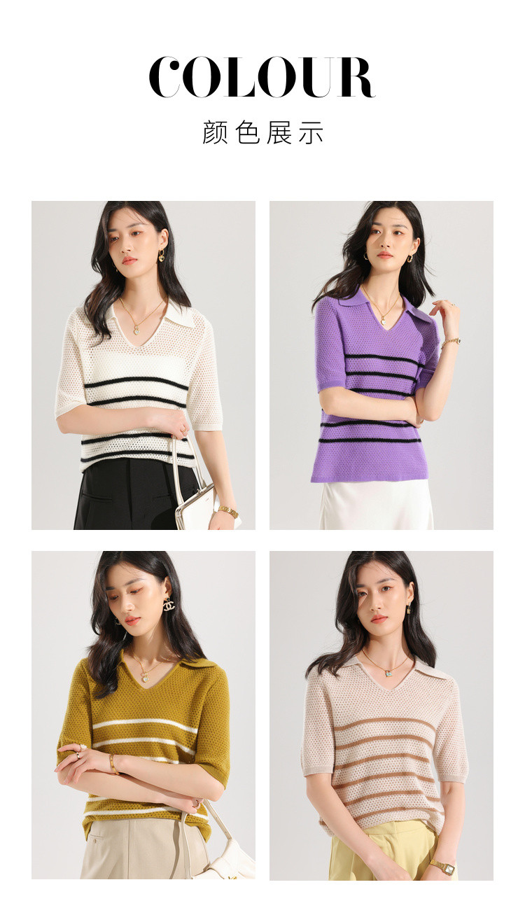 商品名称:【镂空透气】夏季纯羊毛轻薄条纹针织衫短袖翻领T恤女polo衫 886931