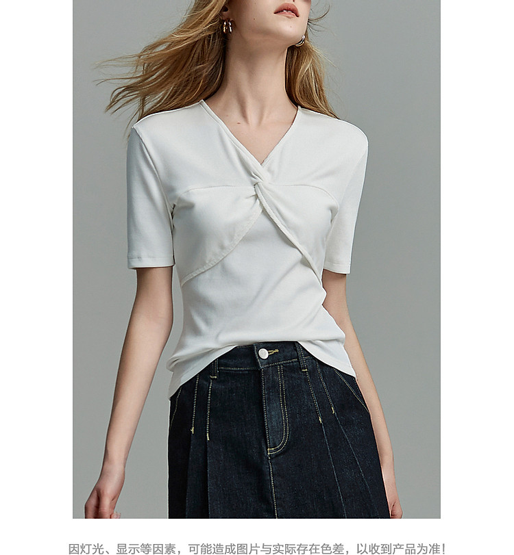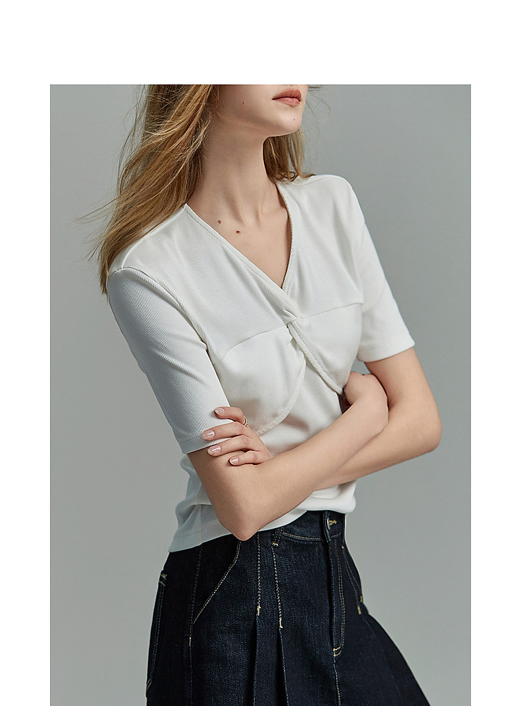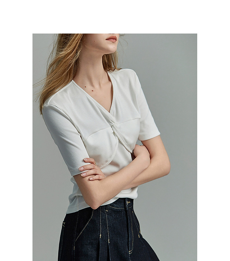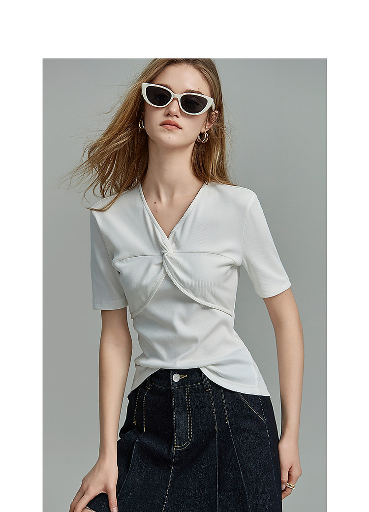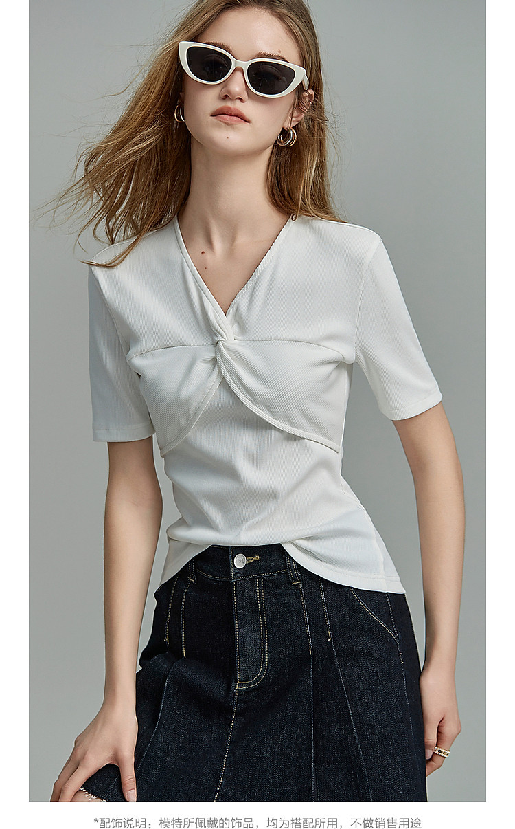 商品名称:【优雅不败】夏甜辣风V领短袖t恤女前胸收褶紧身棉料女式t恤 842689