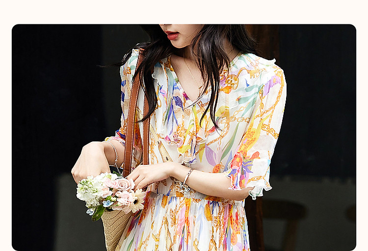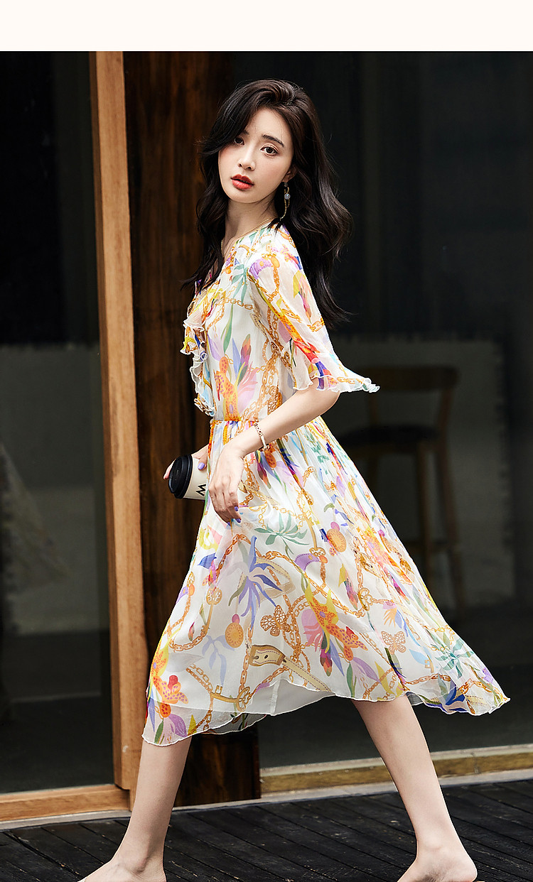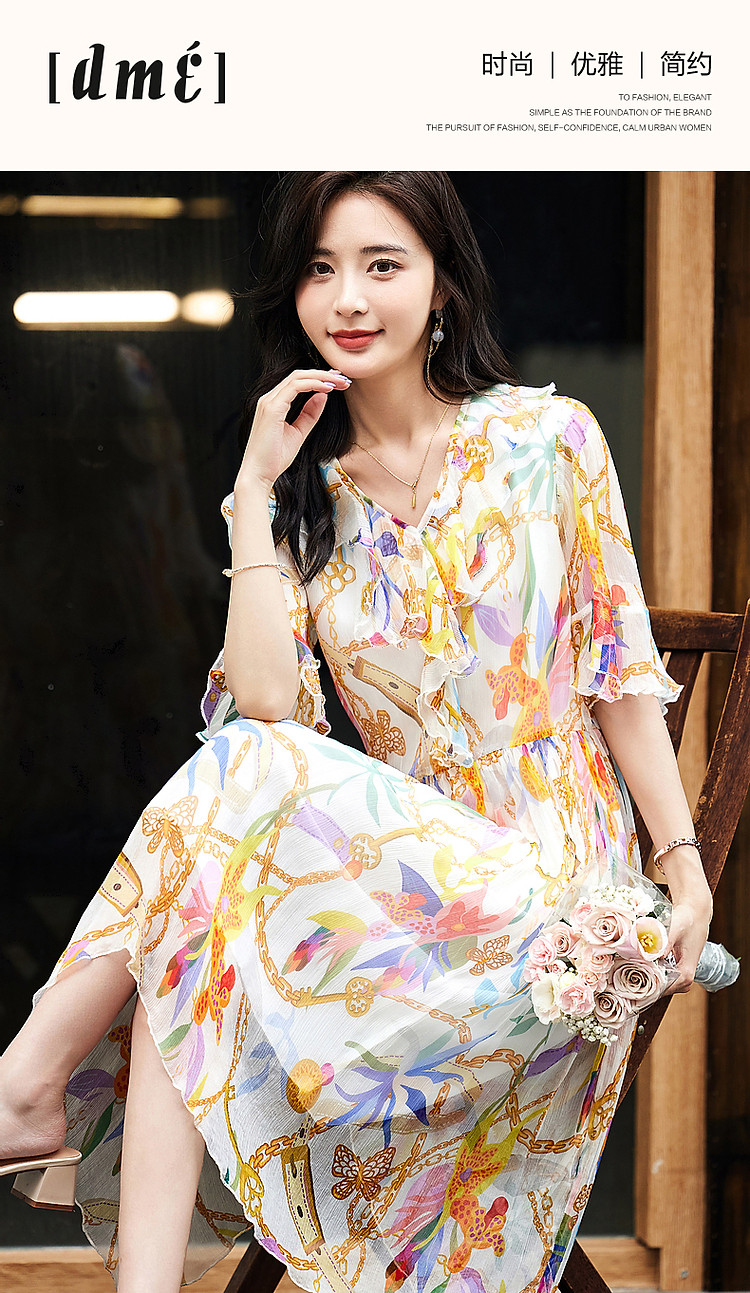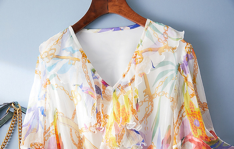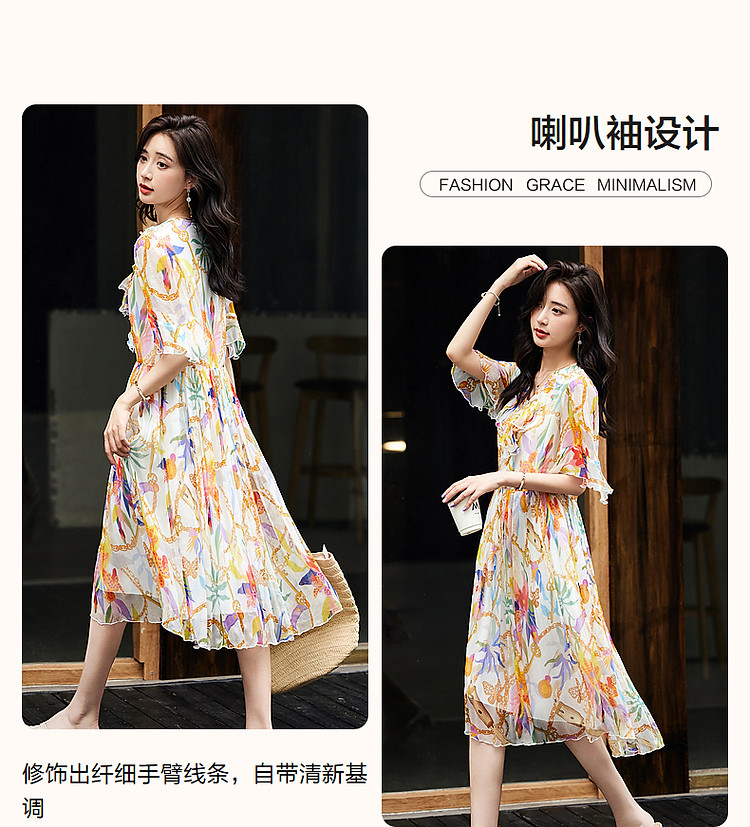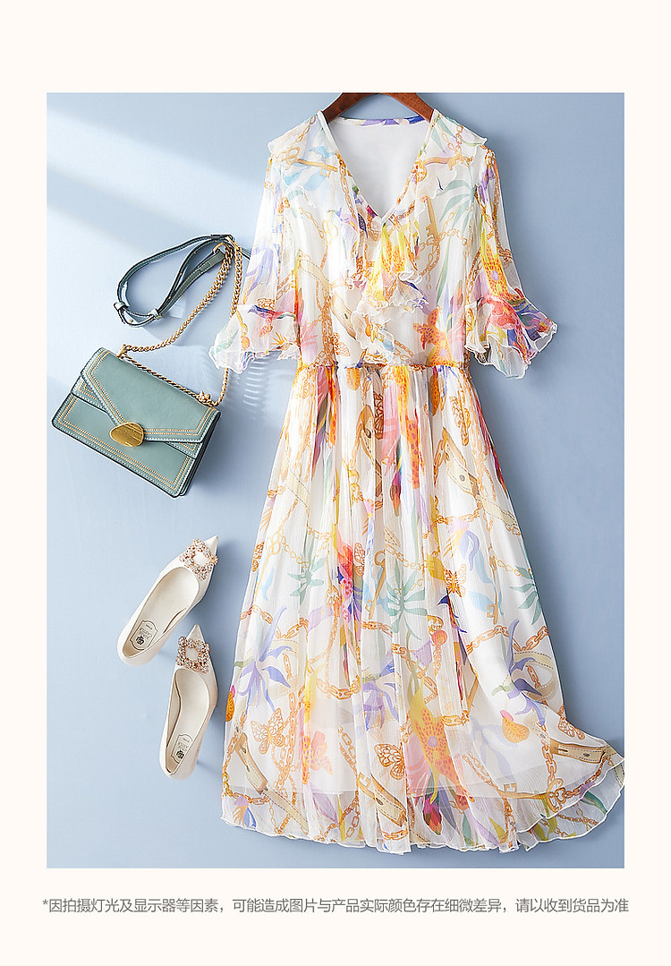 商品名称:【浪漫主义】夏圆领桑蚕丝链条印花荷叶喇叭袖a字连衣裙 485185