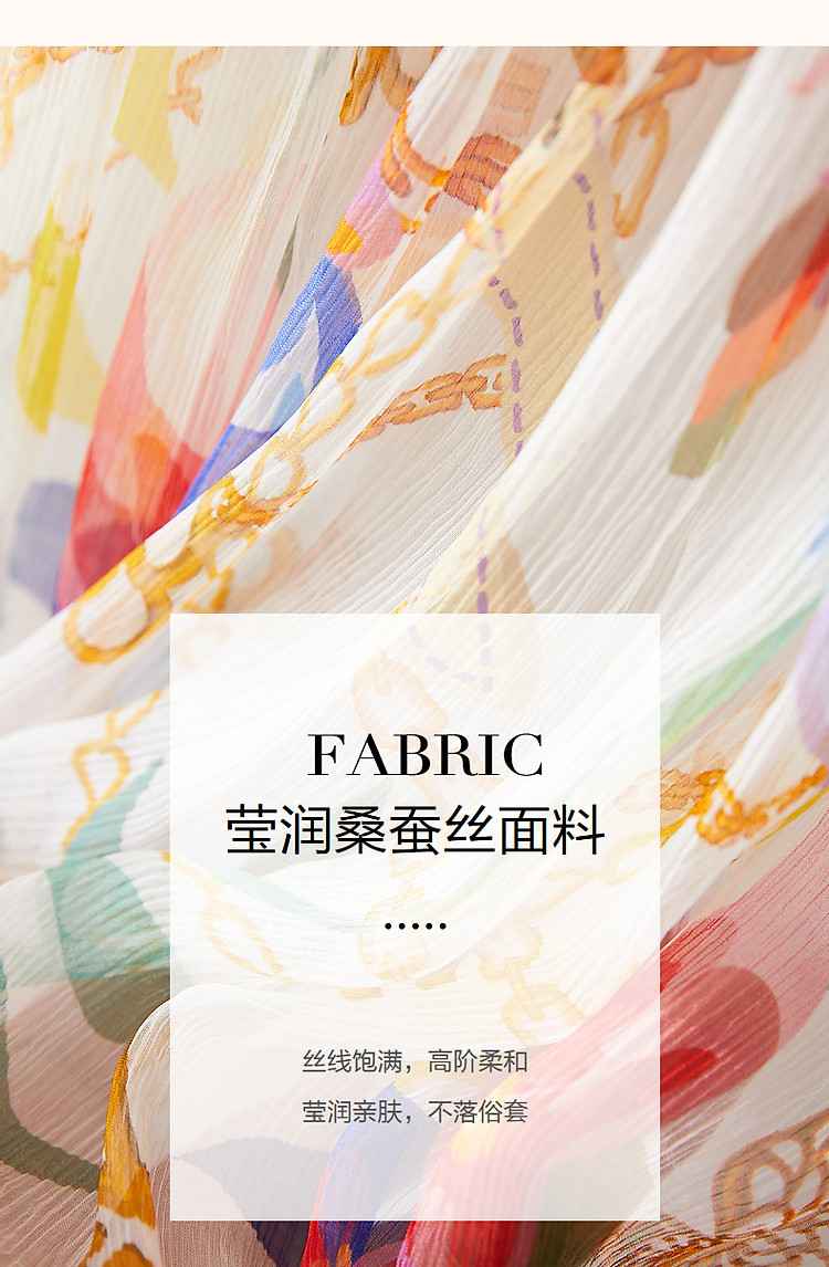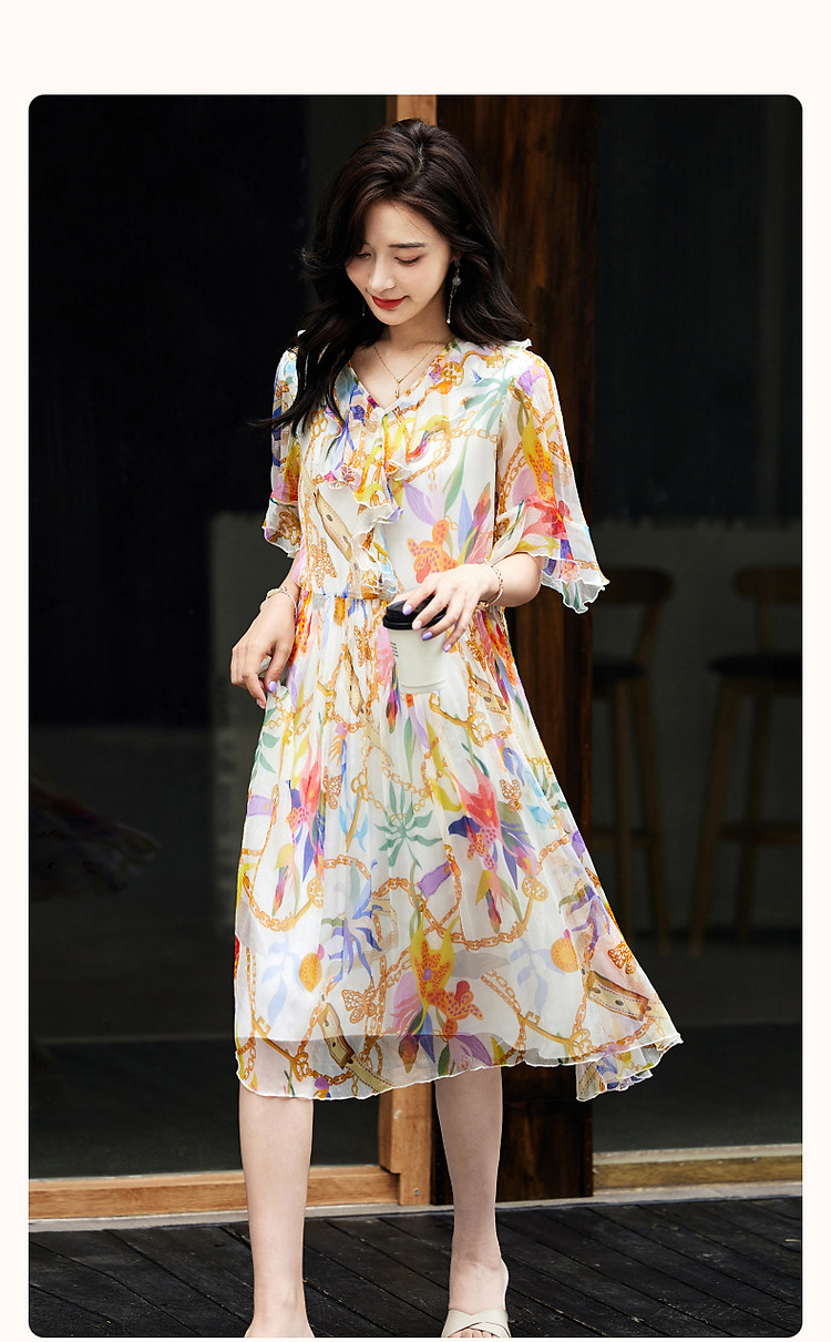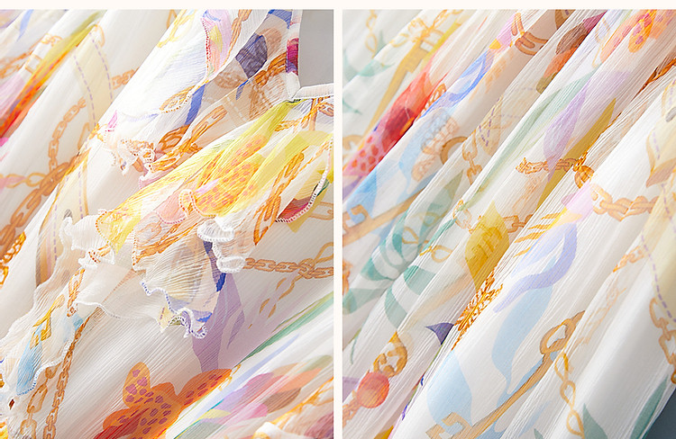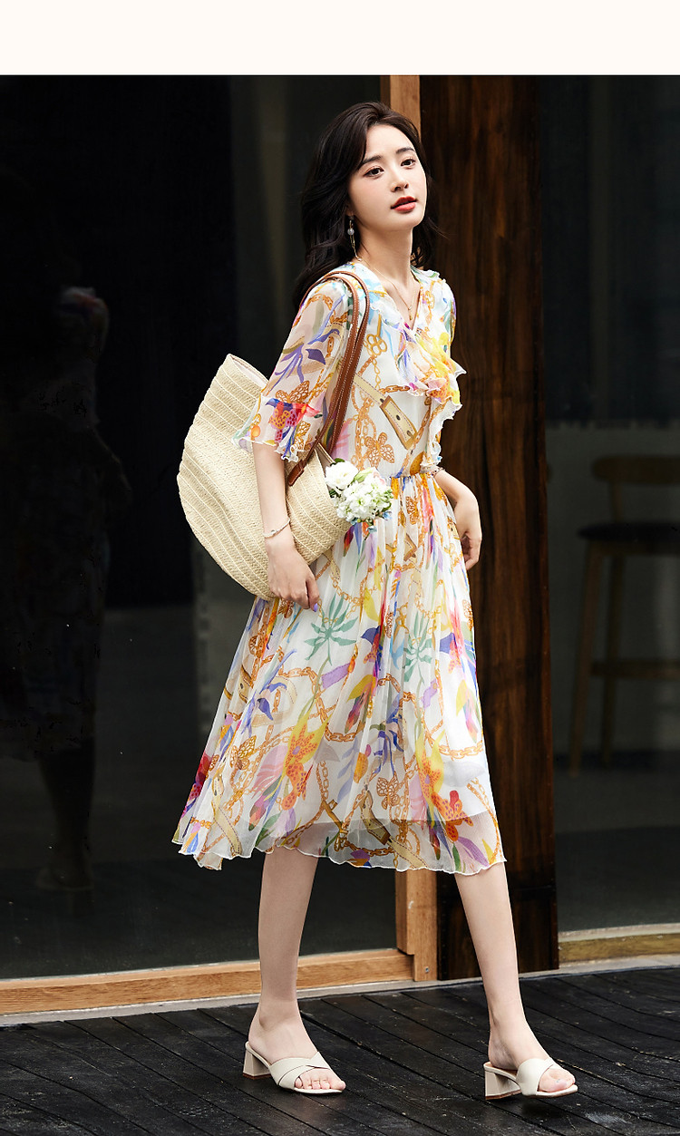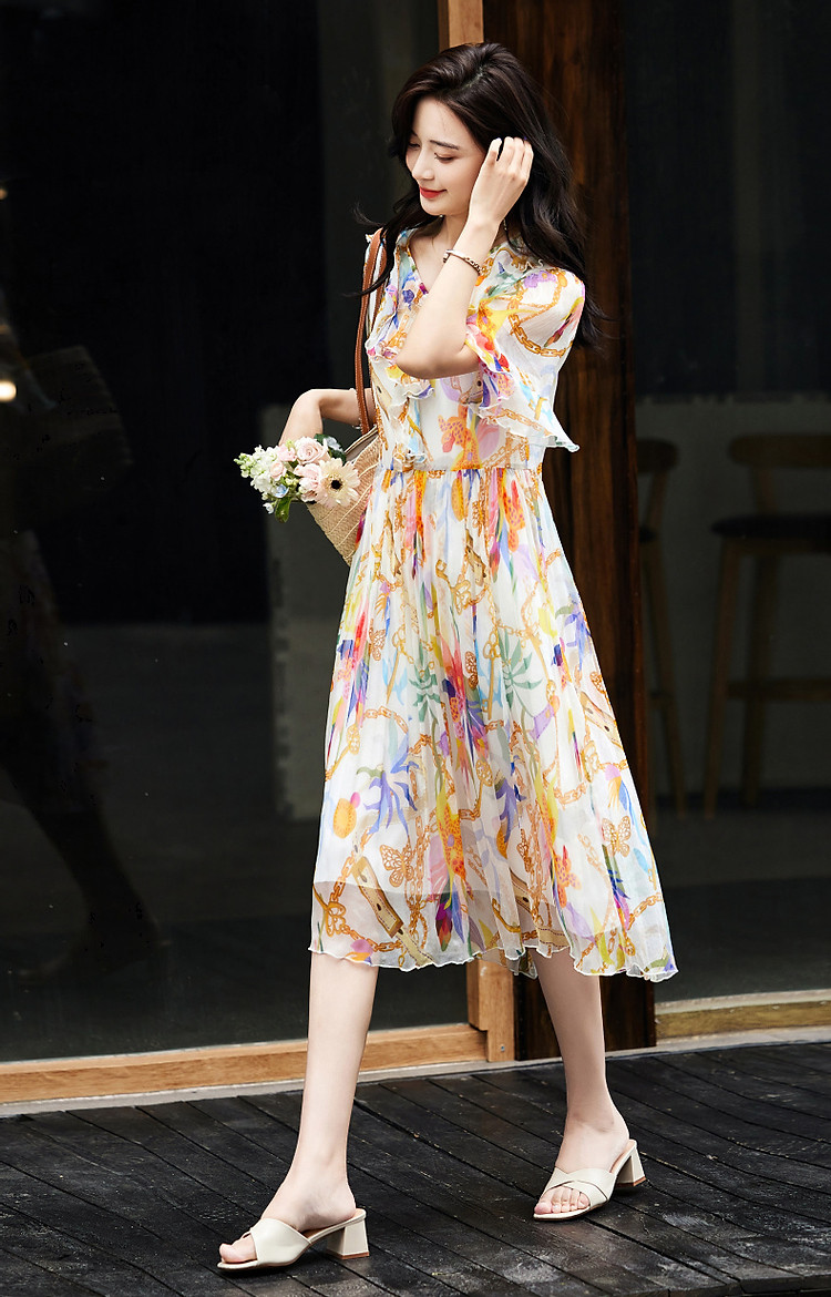 商品名称:【浪漫主义】夏圆领桑蚕丝链条印花荷叶喇叭袖a字连衣裙 485185