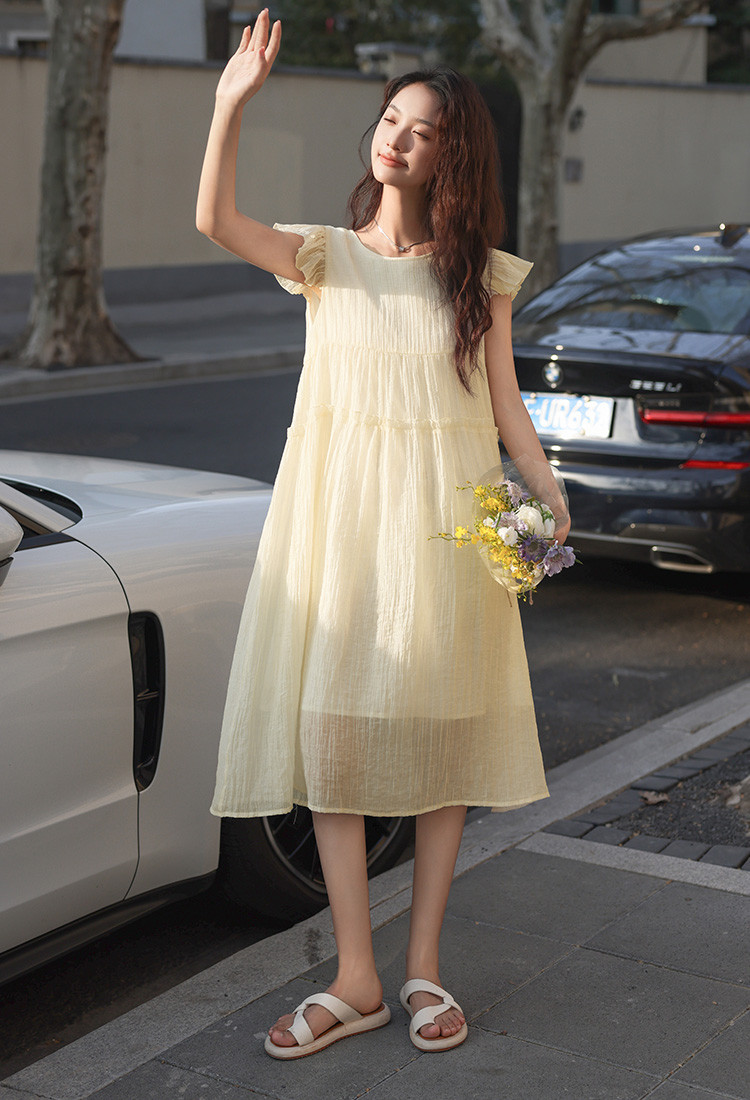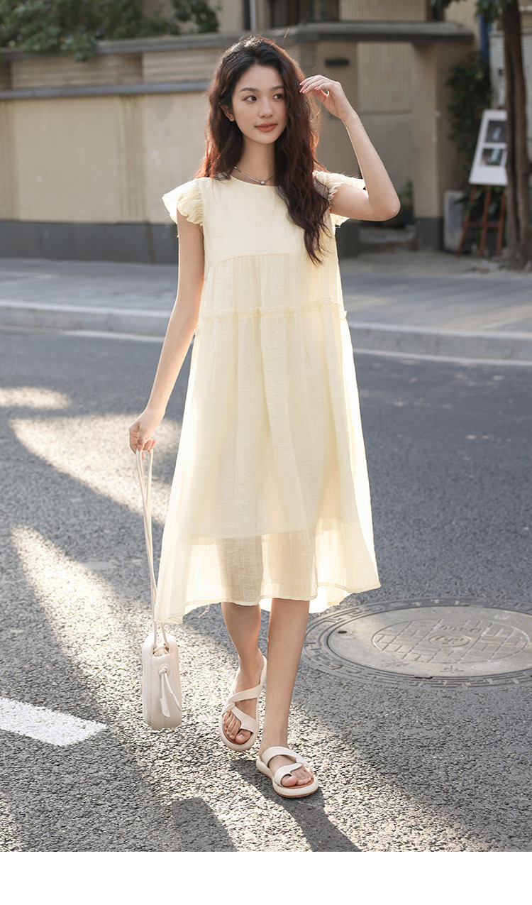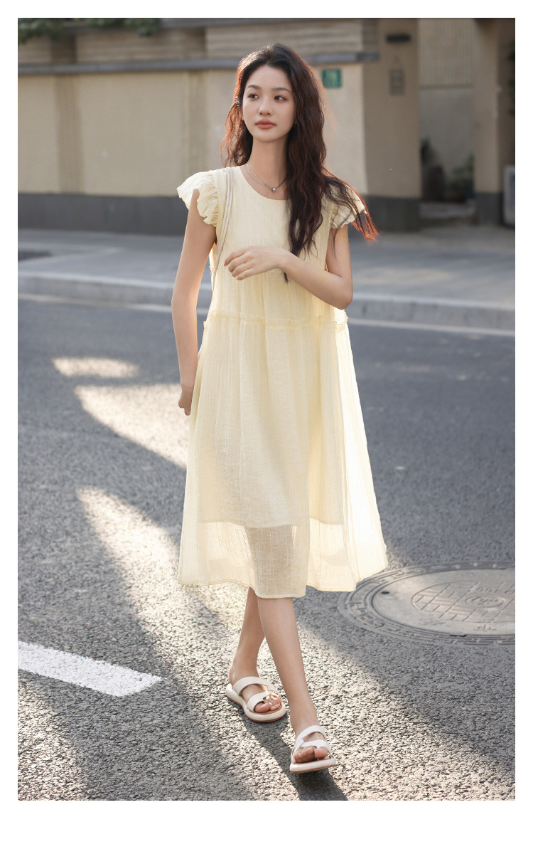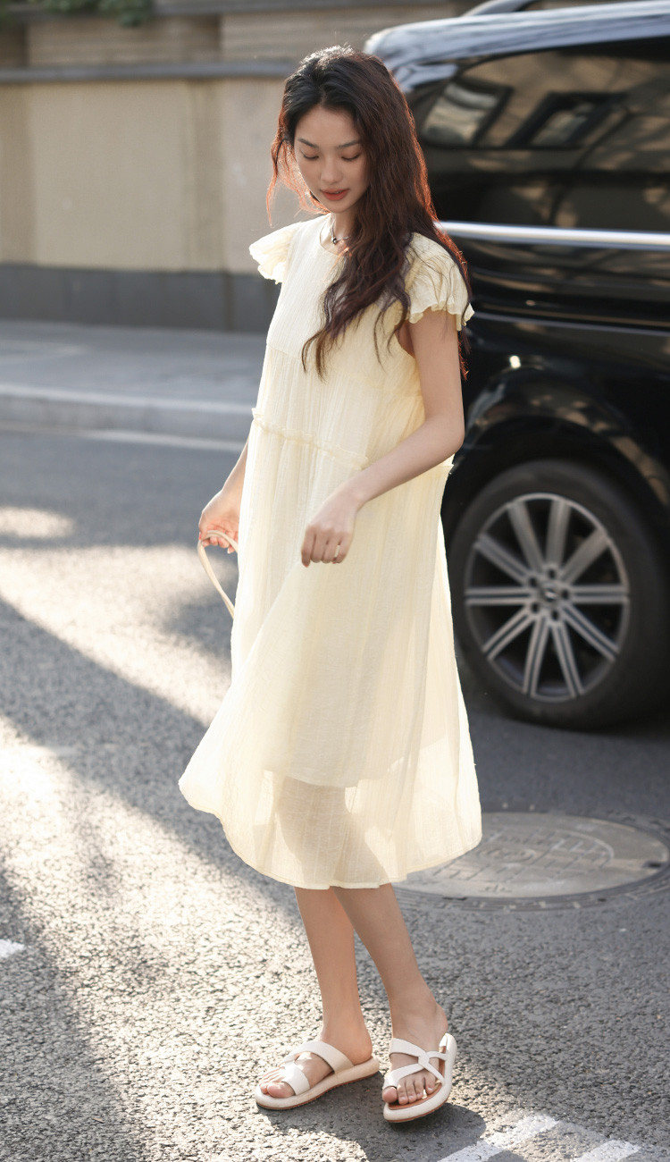 商品名称:【可爱小飞袖连衣裙】夏减龄嫩黄色木耳边洋气时髦中长裙 981634