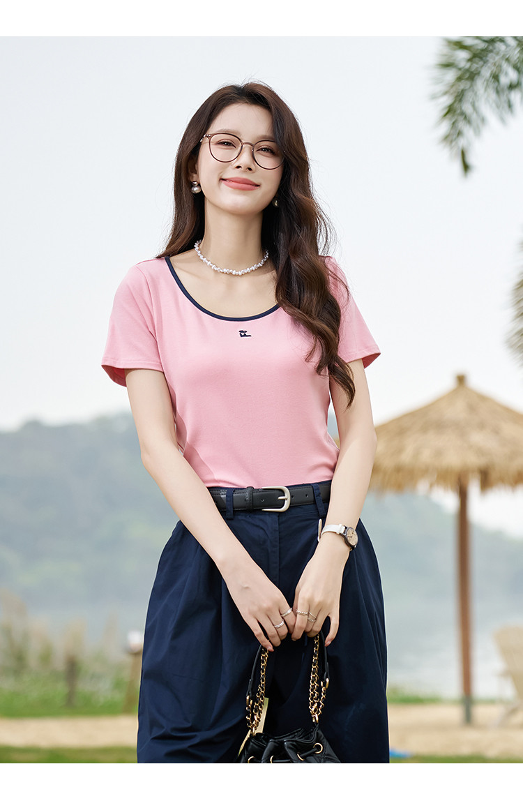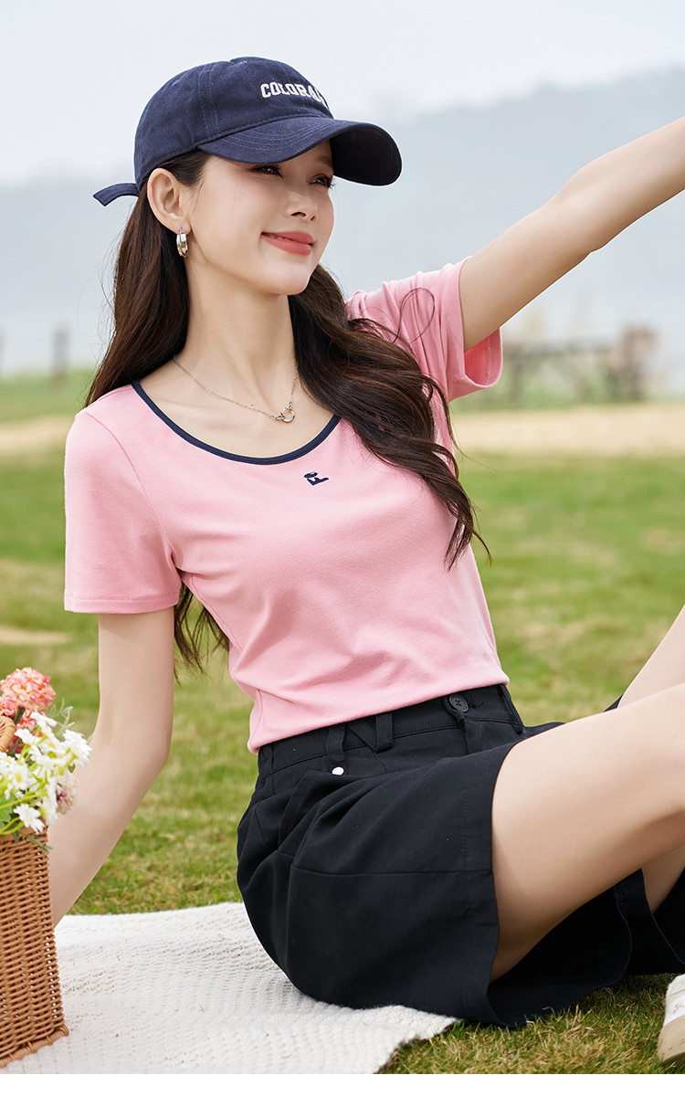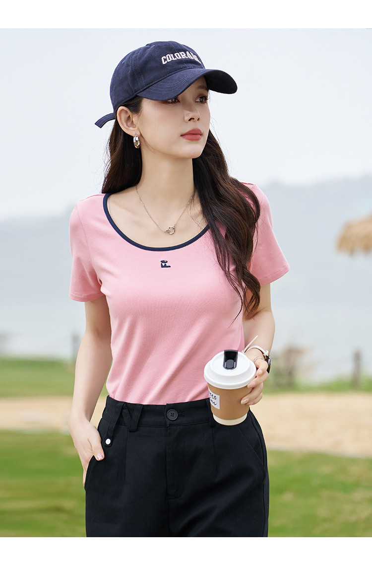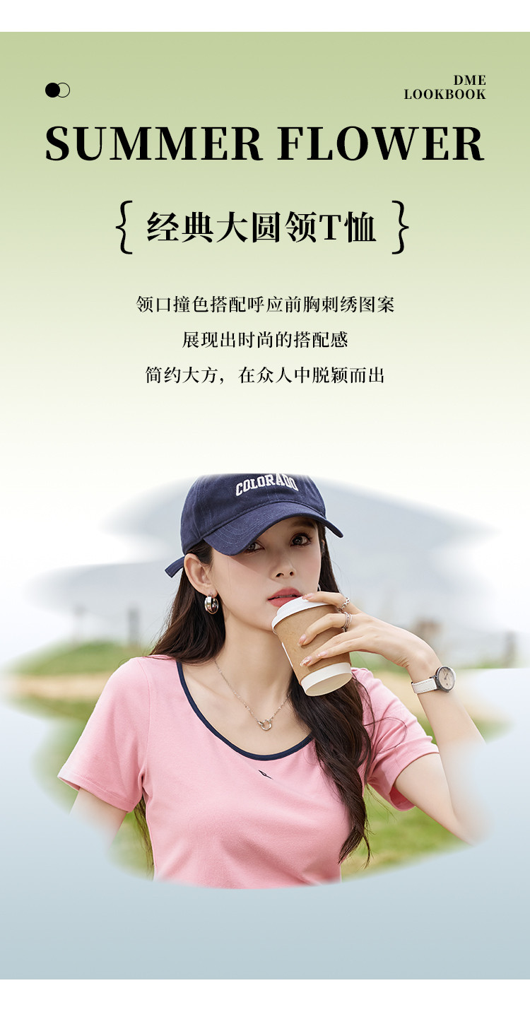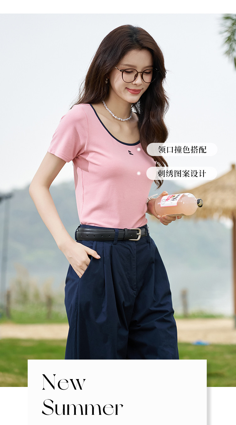 商品名称:【半熟恋人】大圆领微弹 绣花款 显瘦 辣妹 短袖T恤女 775553