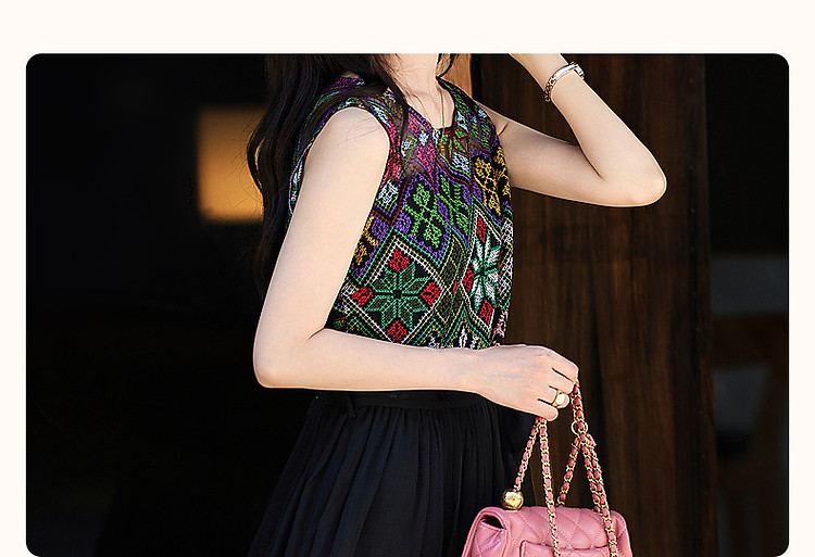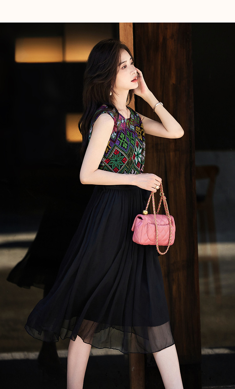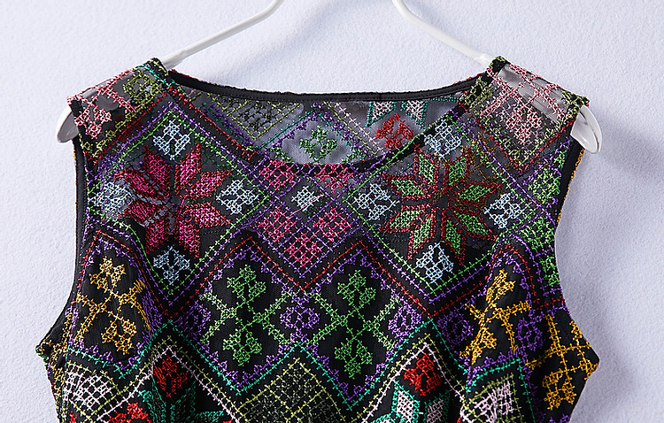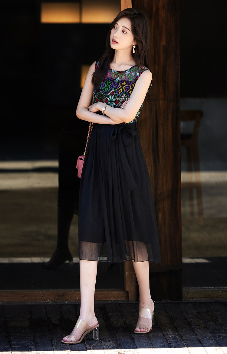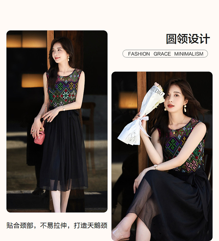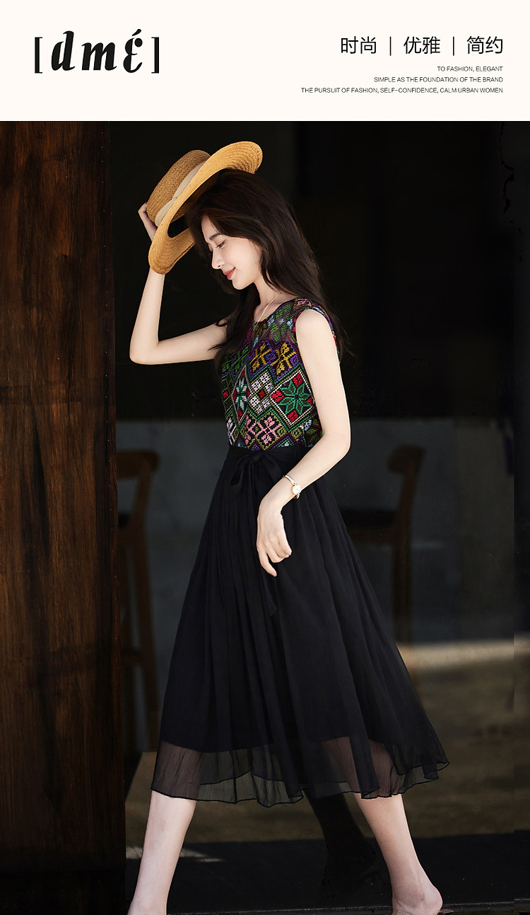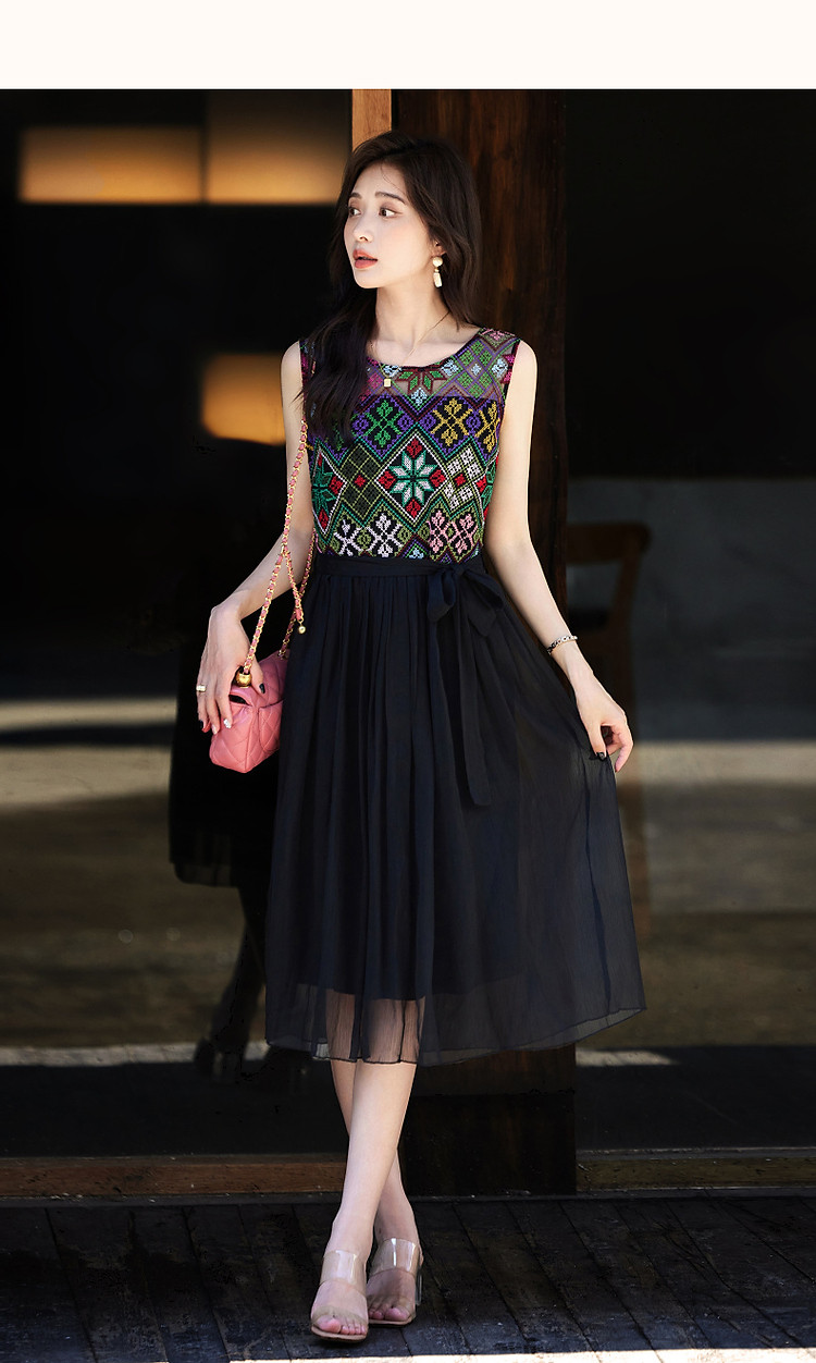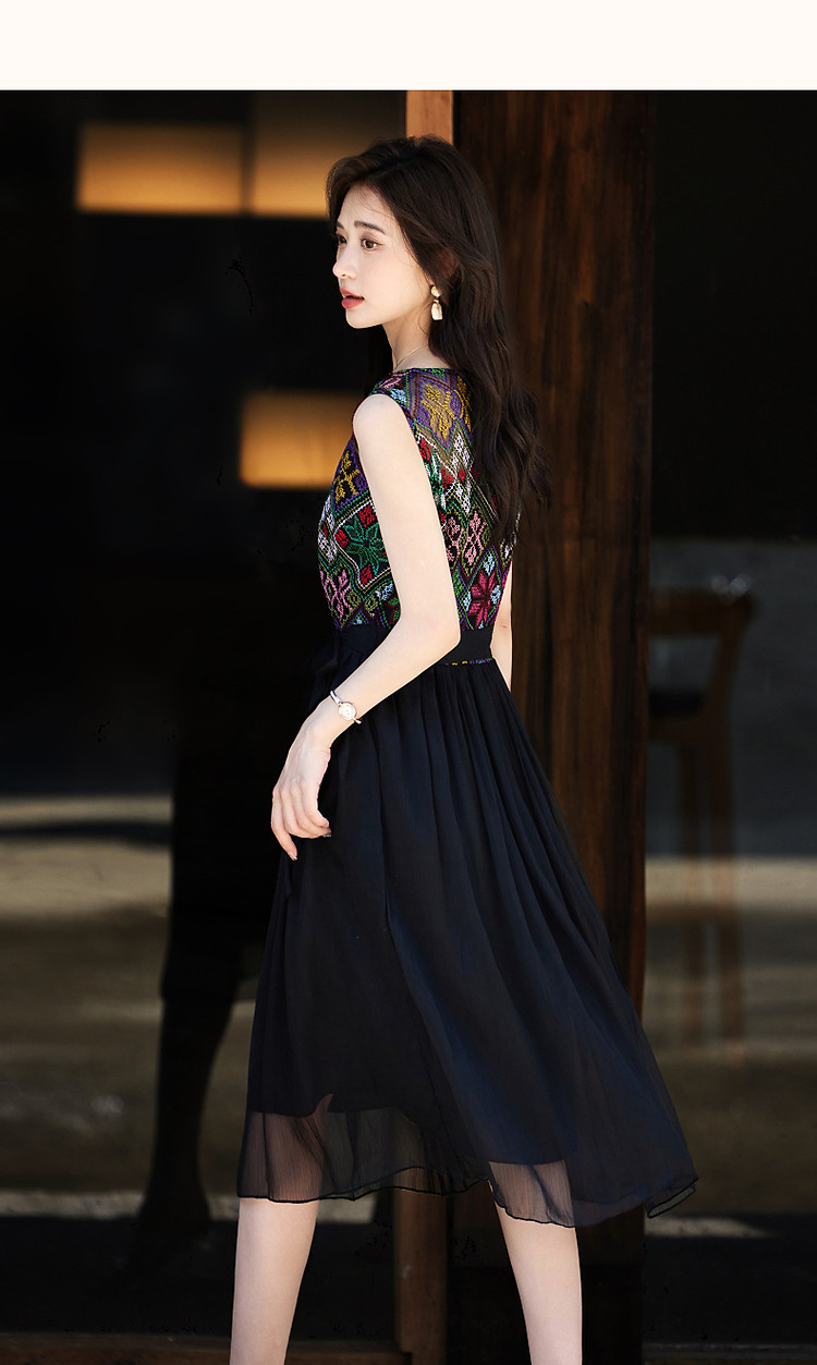 商品名称:【长相思】夏民族风重工刺绣圆领修身度假无袖大摆拼接腰带连衣裙 449089