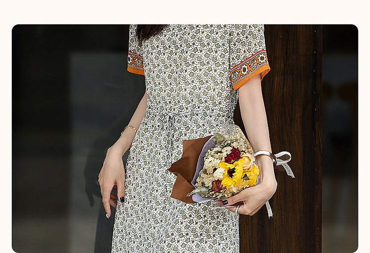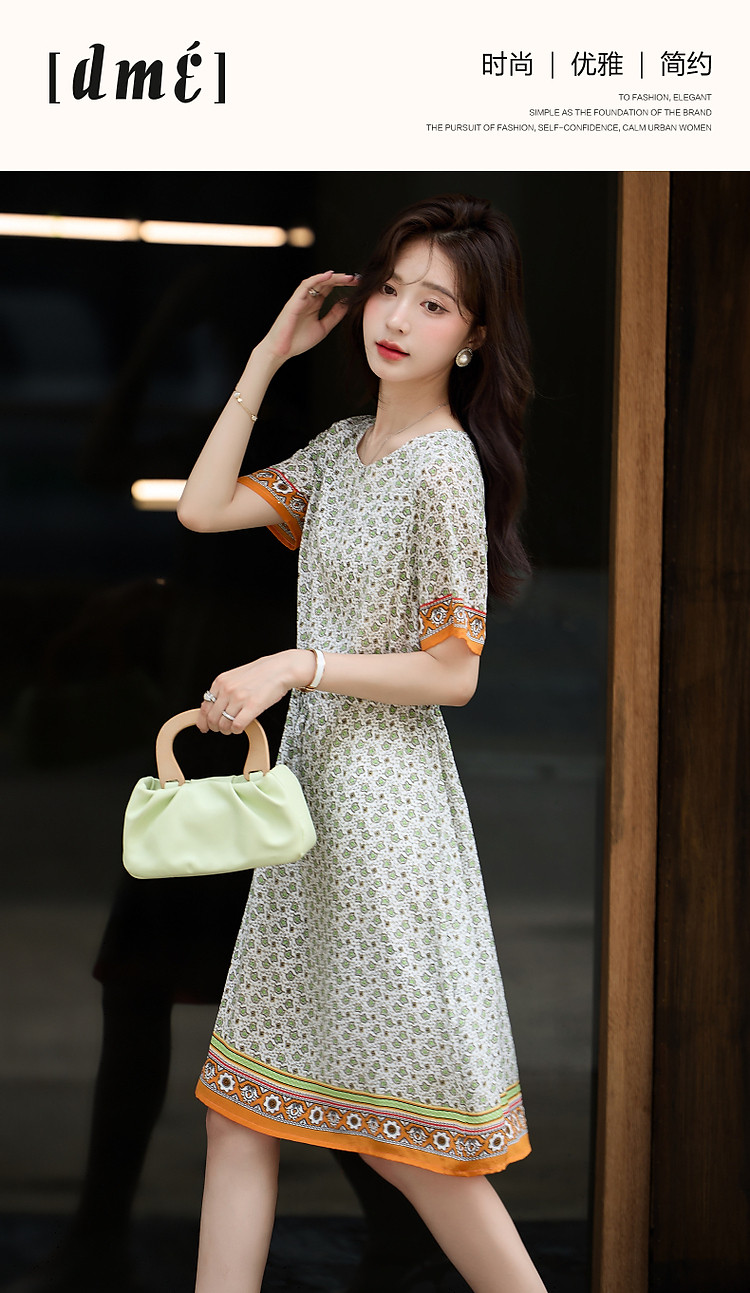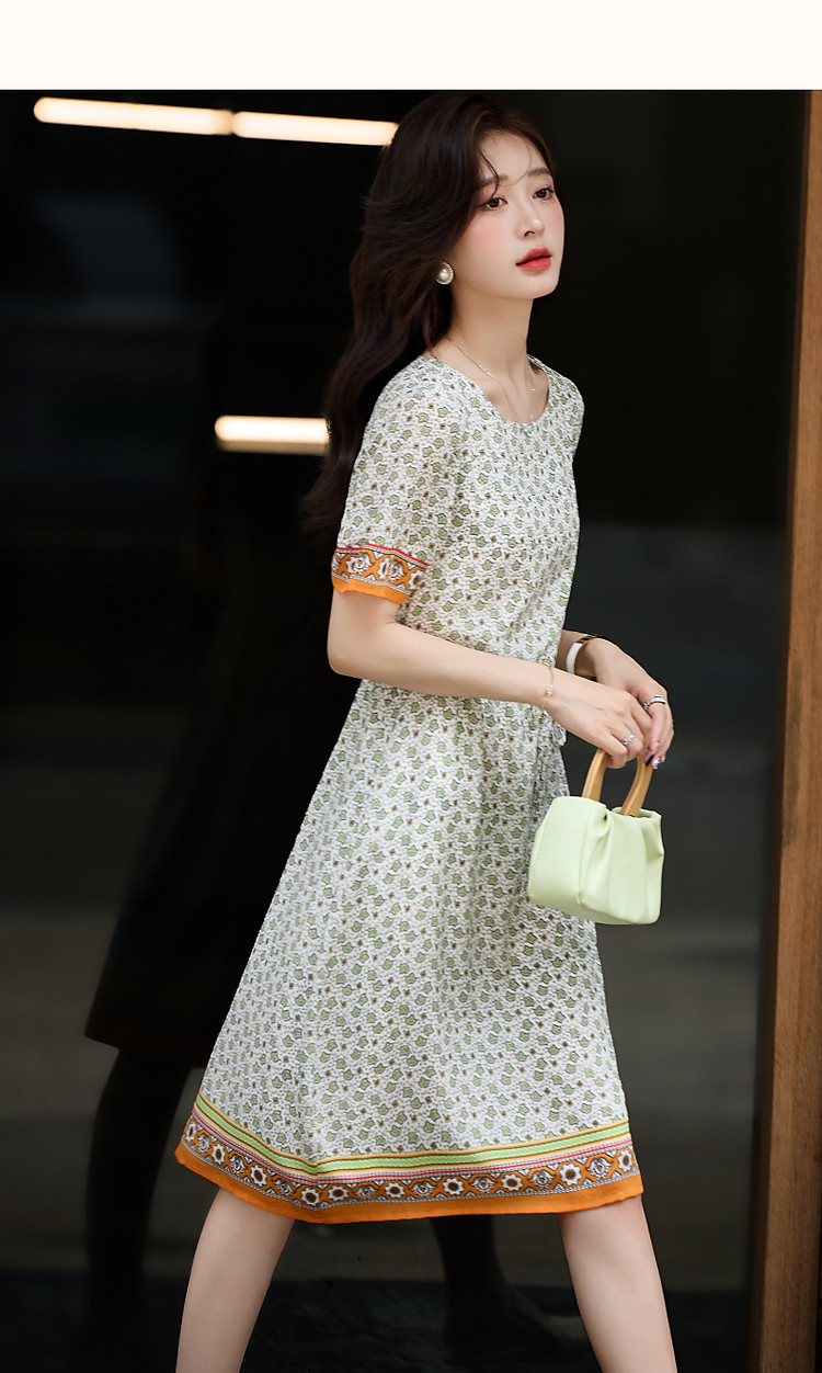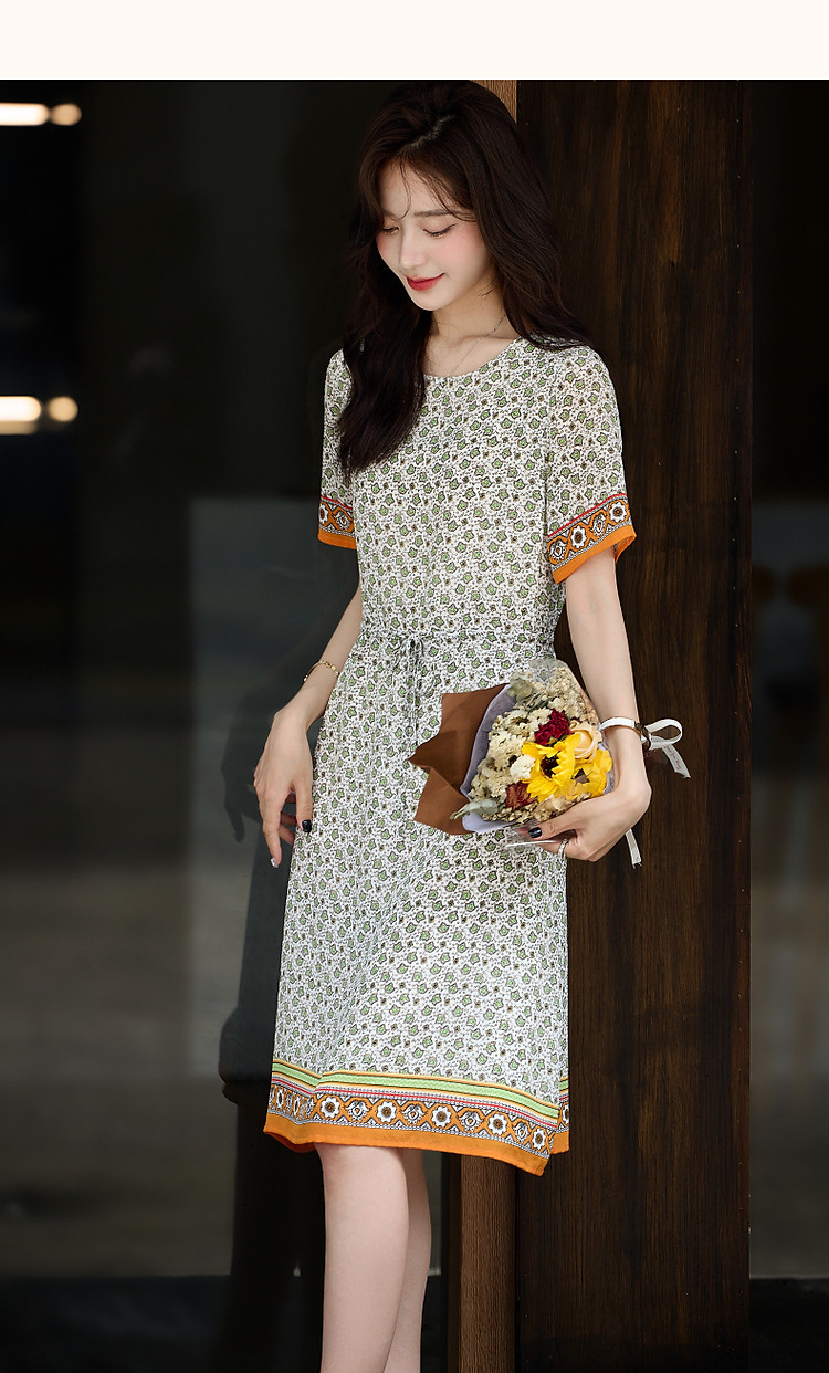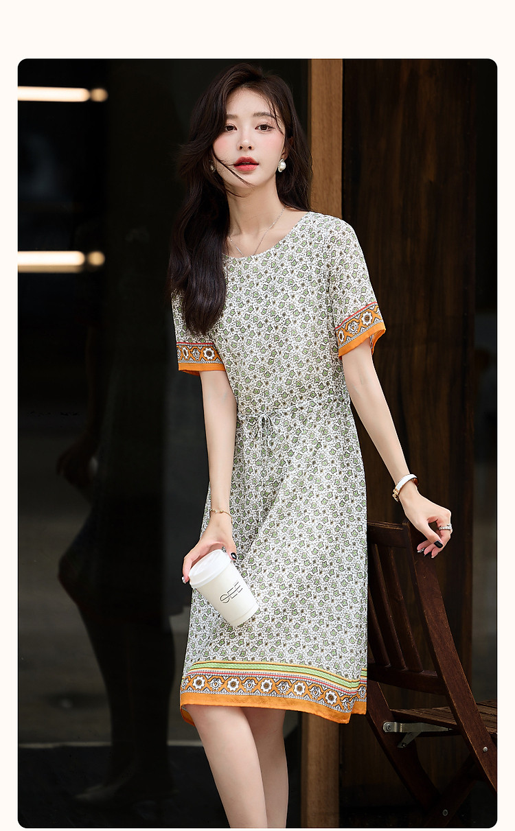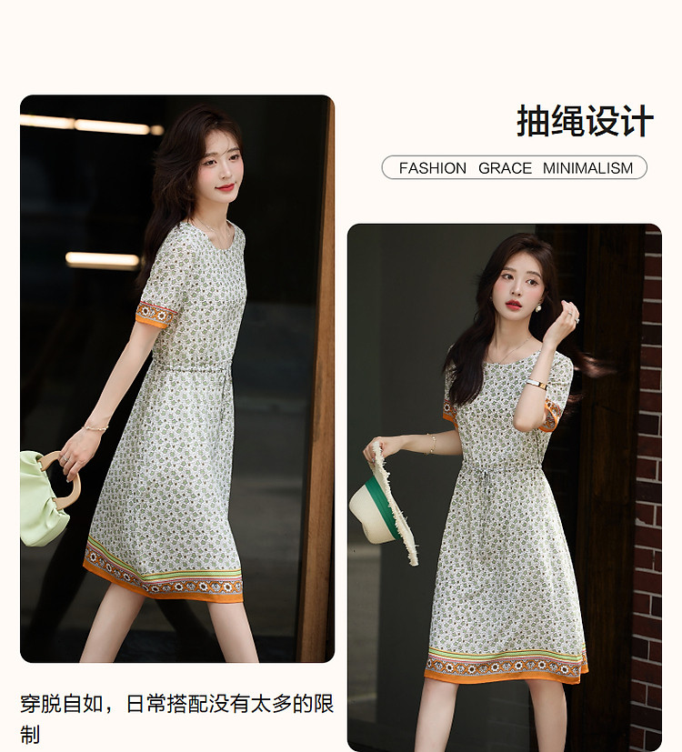 商品名称:【法式轻氧美】夏奢享桑蚕丝定位印花抽绳气质连衣裙女 354753