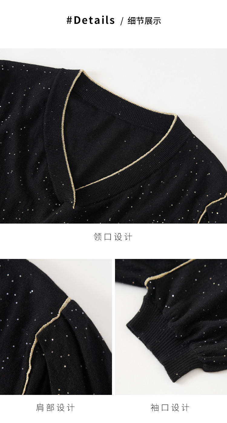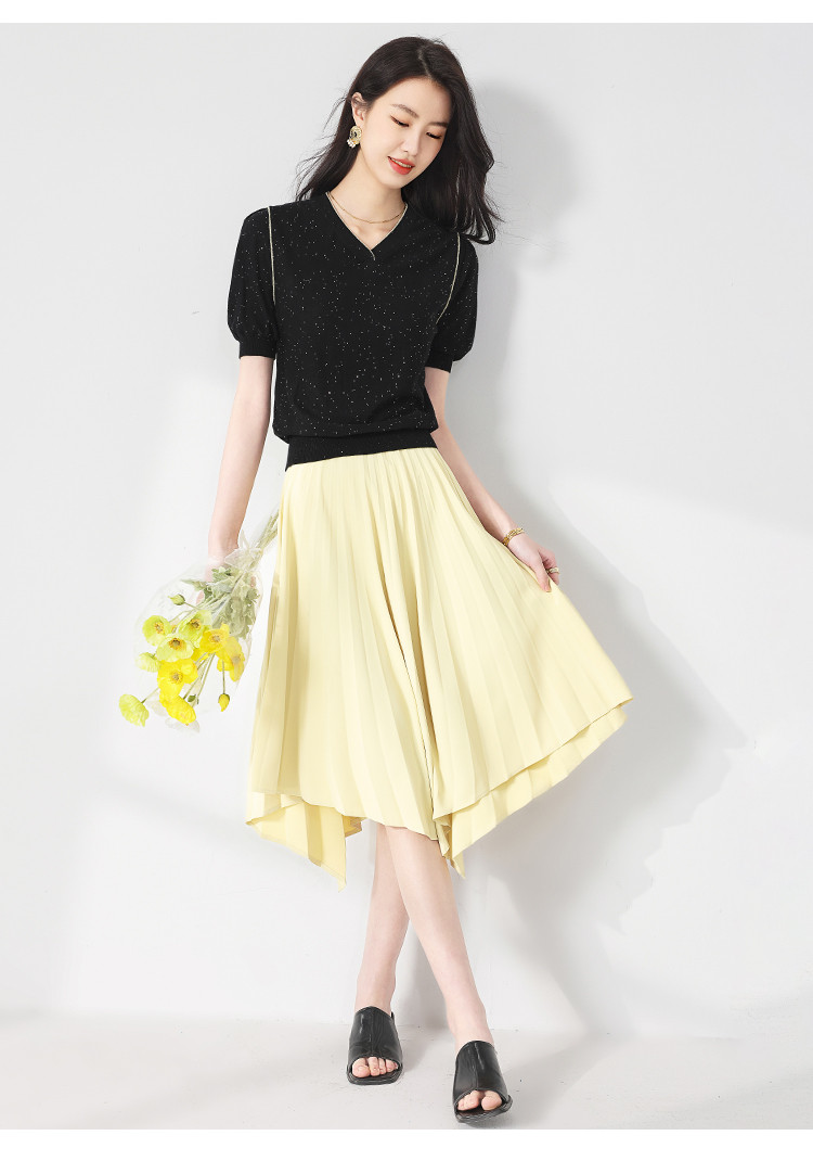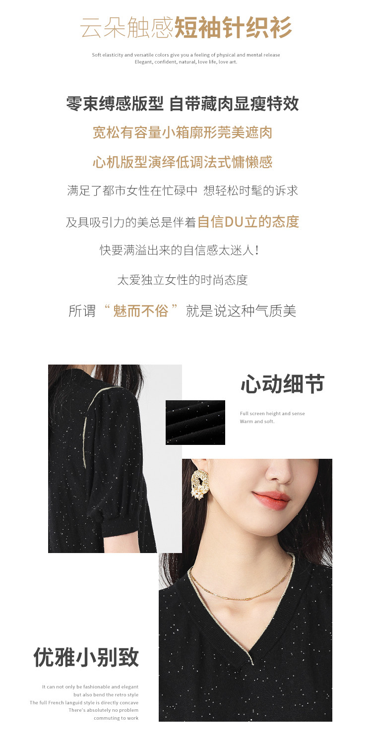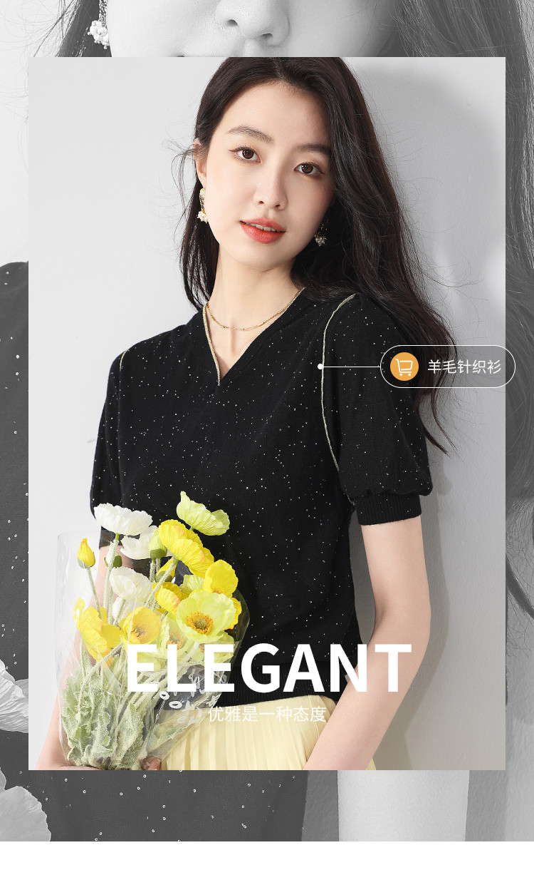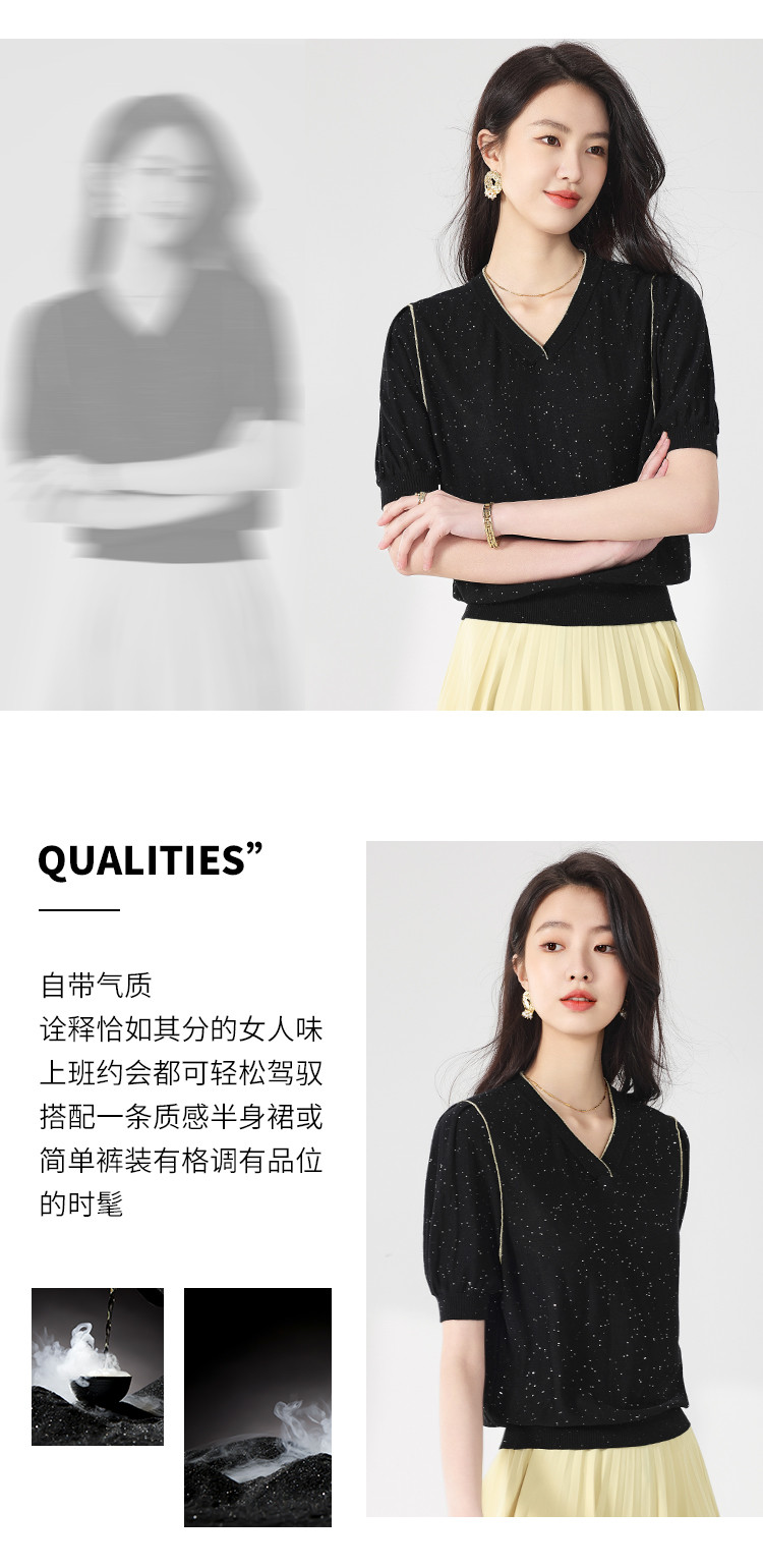 商品名称:夏轻薄透气含绵羊毛泡泡袖V领短袖T恤针织打底衫女 331283