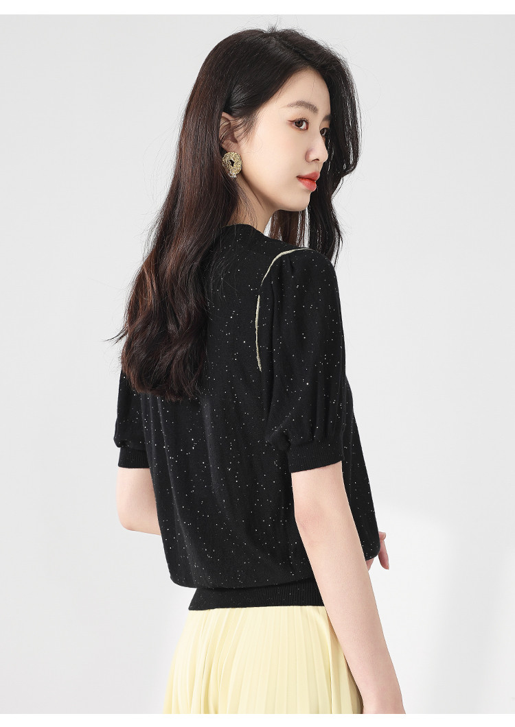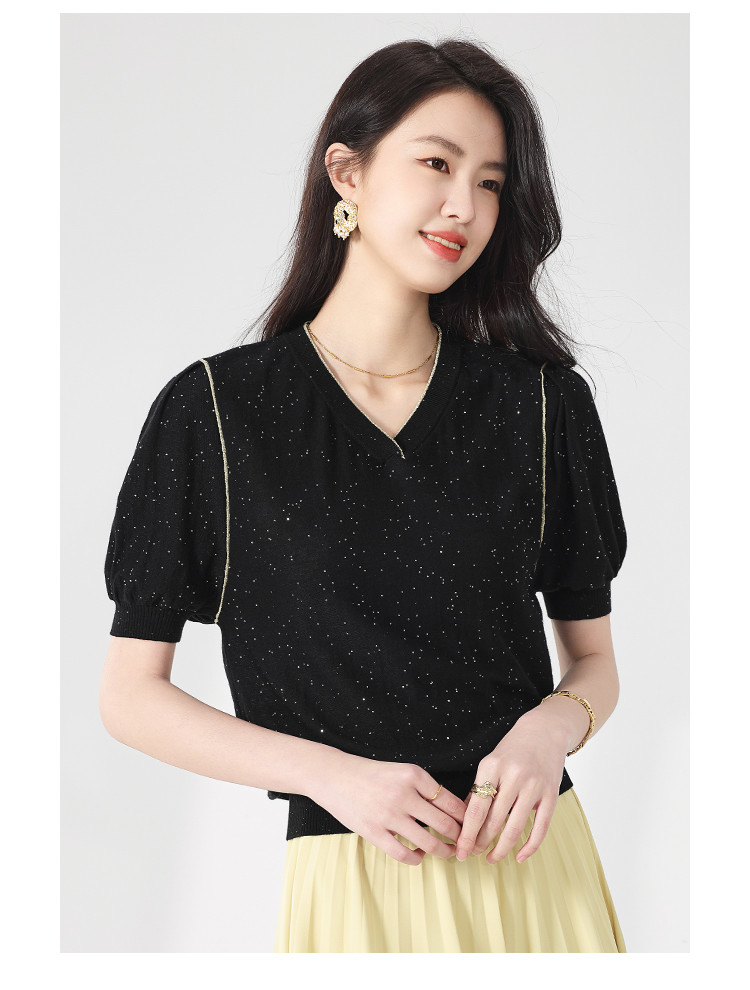 夏轻薄透气含绵羊毛泡泡袖V领短袖T恤针织打底衫女 331283
